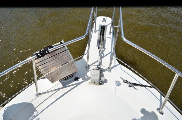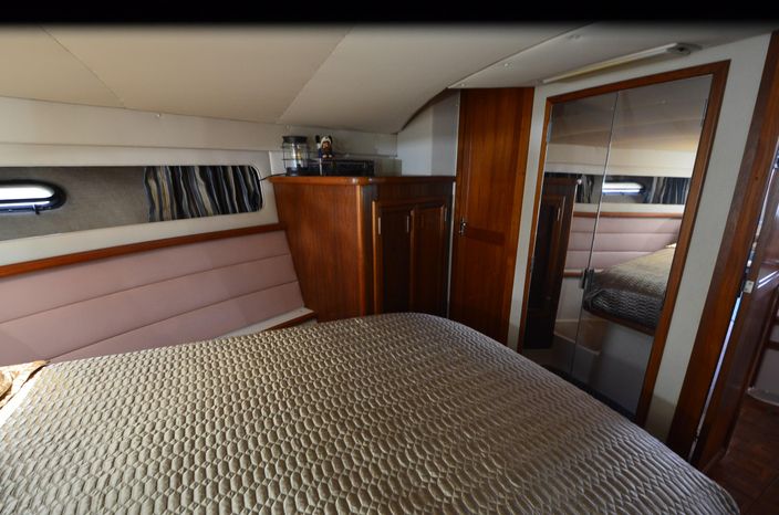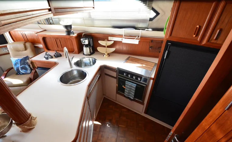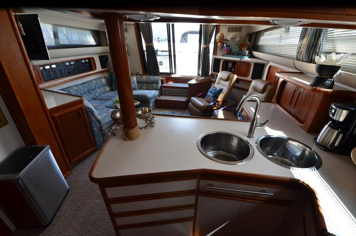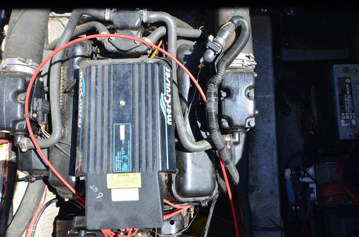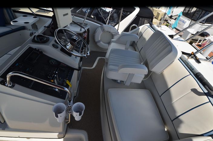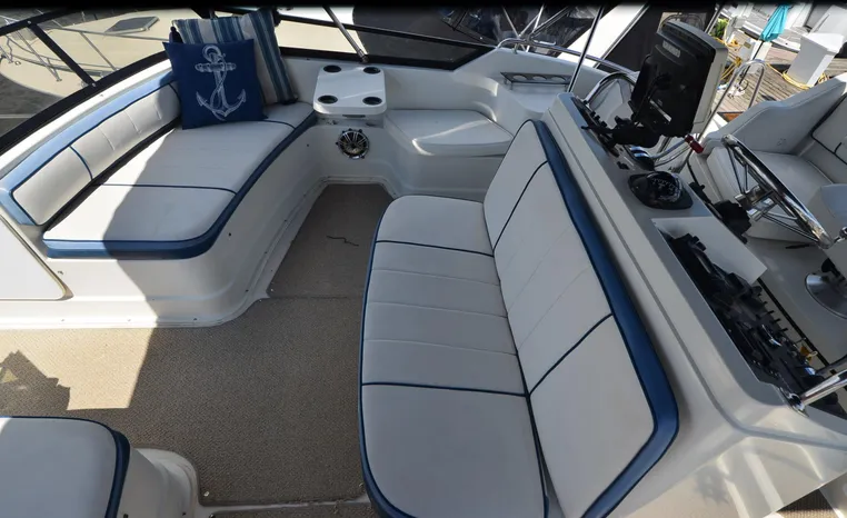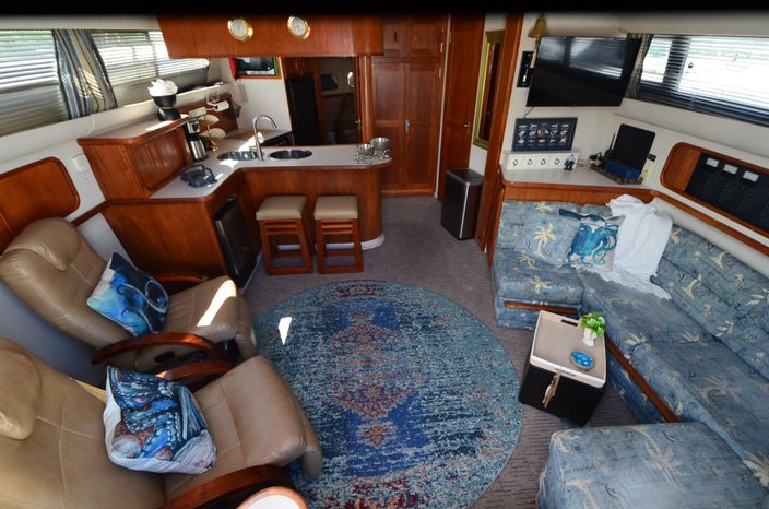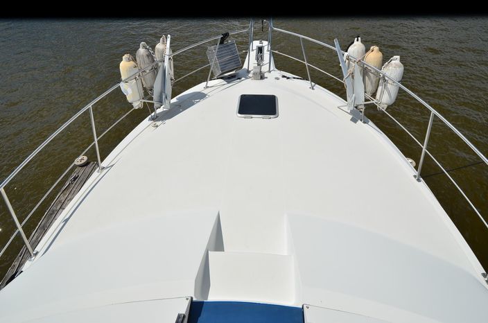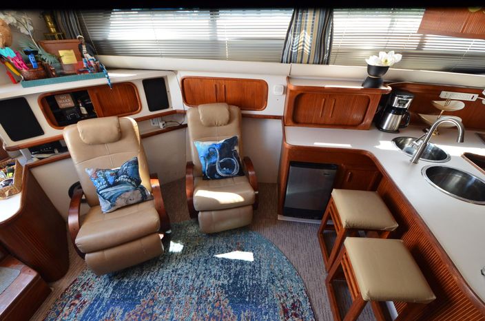 1989 Carver Santego 3867, Twin 340 HP Mercruiser, V-drive, GM 454 CID, 7.4L, raw water cooling, 1226 hours, Kohler 7.5Kw generator, 1739 hours, fly-bridge, single station, Seastar steering, Fireboy auto halon, four batteries, Pro Tech 30 AMP battery charger, dual 30 amp service with two shore power cords, two Cruise Air reverse cycle air conditioning/heating units, electric head, vanity, stall shower, sleeps four, master stateroom forward with island queen berth, beige carpet, light blue upholstery, teak woodwork, convertible sofa, dinette table, Kenwood stereo CD, flat panel TV, water heater, Norcold 12VDC/120VAC refrigerator/freezer, Princess three burner electric stove with oven, Seaward microwave oven, Kenyon VHF marine radio, VHF antenna, Hummingbird GPS, Impulse depth finder, C. Path compass, dual trumpet electric horn, black canvas, bimini top new 15, aft cockpit seat covers, bridge cover, walk through windshield, flybridge carpet, integral bow pulpit, chrome anchor, Good automatic windlass, two fenders, BBQ grill, Bennett trim tabs, transom shower (H/C), integral swim platform with boarding ladder.