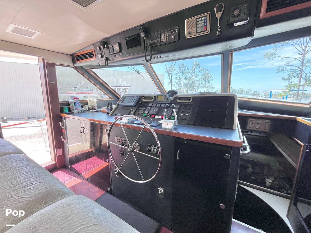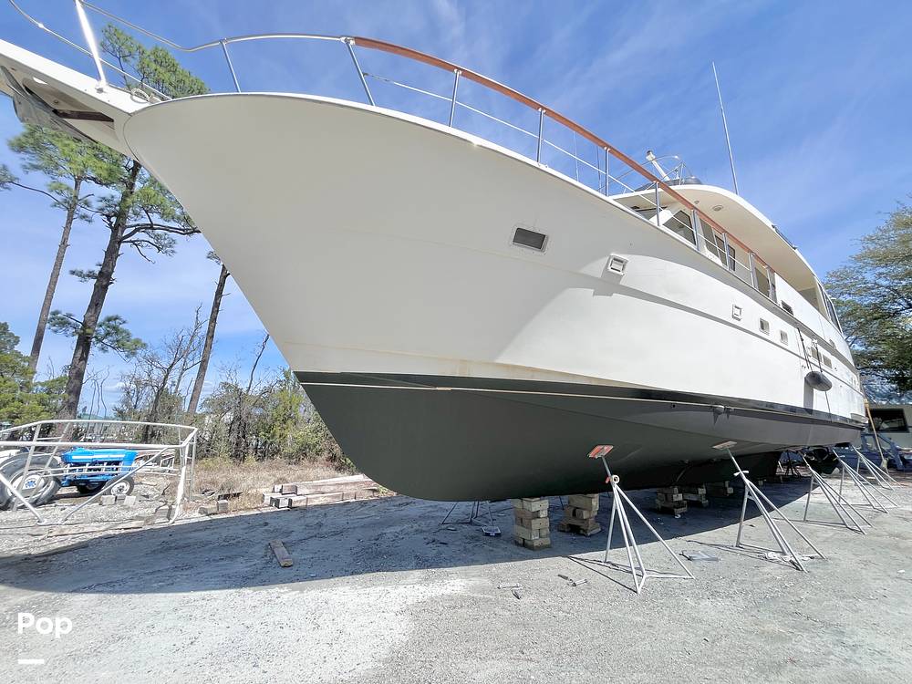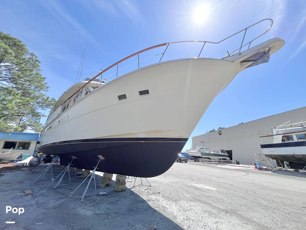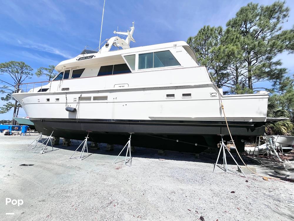 This Hatteras has been used as a cruiser and live-aboard. The boat was photographed on the hard while bottom work and maintenance were being performed. Personal items were in the process of being offloaded to clear the boat for sale.