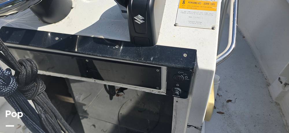 Nice open cockpit layout with 6 rod holders at helm, 2 in the gunwales, and another 5 at transom. Forward casting deck with storage, additional storage in console, and at transom.