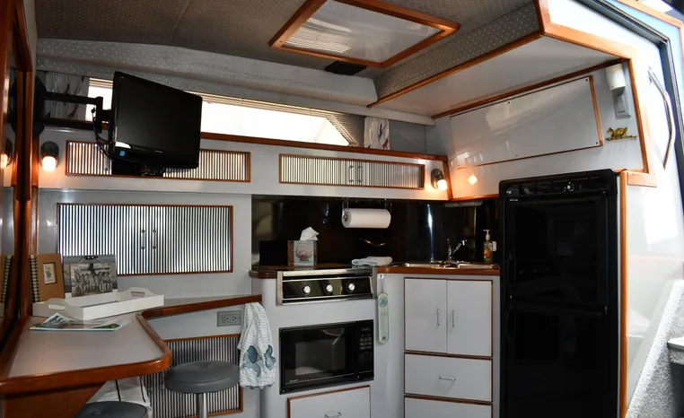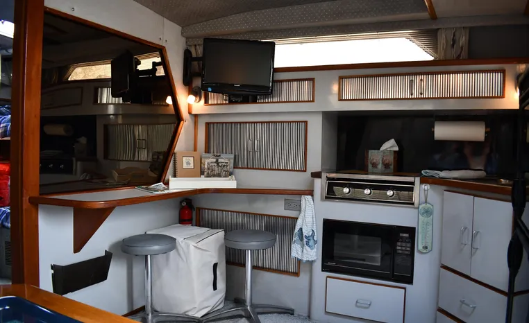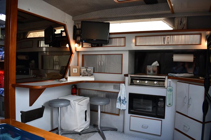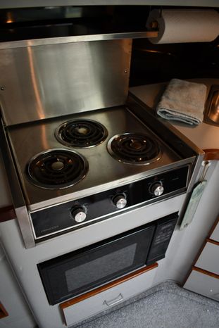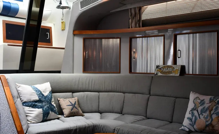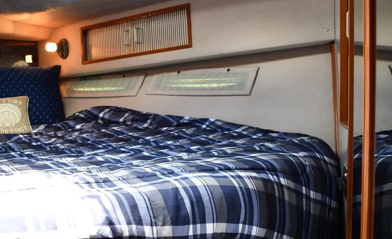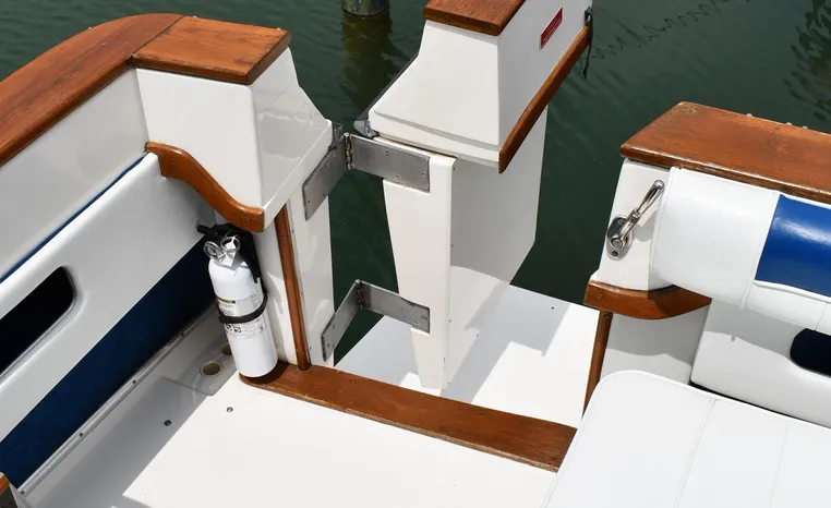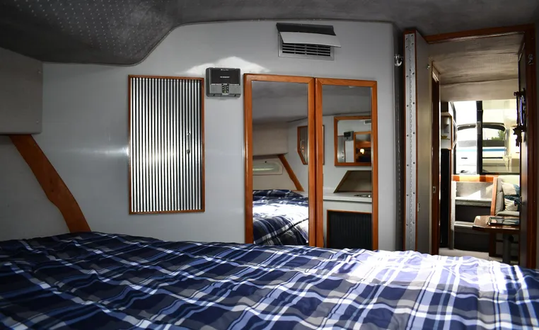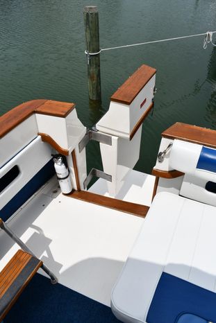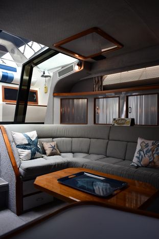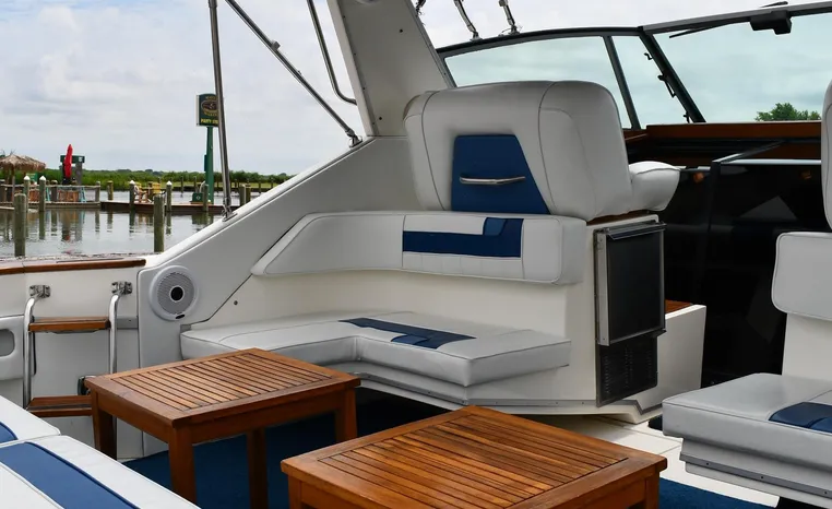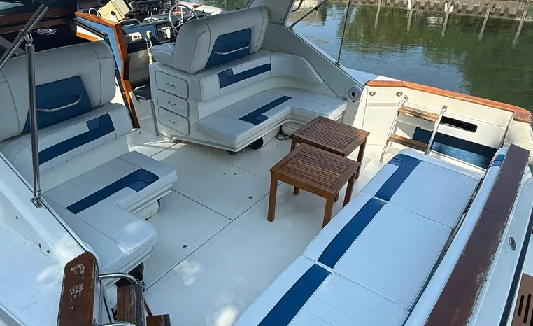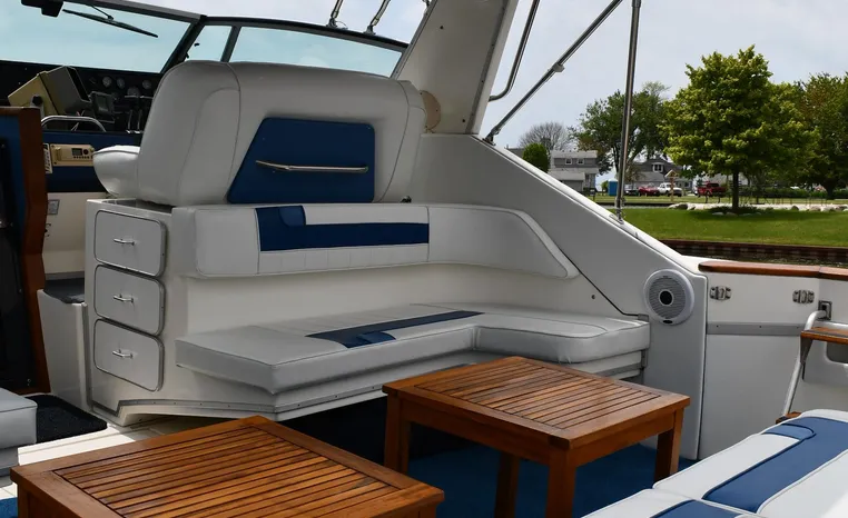 The 390 Express Cruiser turned out to be one of the most popular boats ever built by Sea Ray. First of the big production express boats when she came out in 1984, her sleek lines and European styling--tame by today's design standards--made a lasting impression on the mid-1980's sport boat market. Below, her expansive two-stateroom interior is arranged with a queen berth forward and a combined galley-and-breakfast bar facing the curved settee in the salon. The guest stateroom is unique: it's separated from the salon by a retractable mirrored bulkhead. Slide it away, convert the bunk berths into a sofa, and the area actually becomes part of the main cabin. The 390's interior was updated twice over the years changing from the original wood grain mica to teak in 1986, and to a white-mica/teak-trim decor in 1988. Topside, the single-level cockpit is huge with seating for as many as eight passengers.