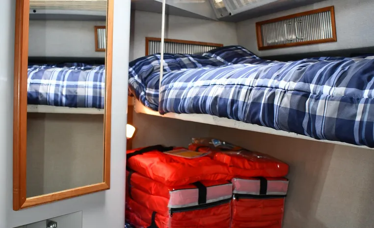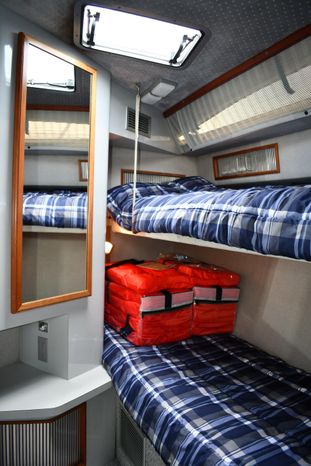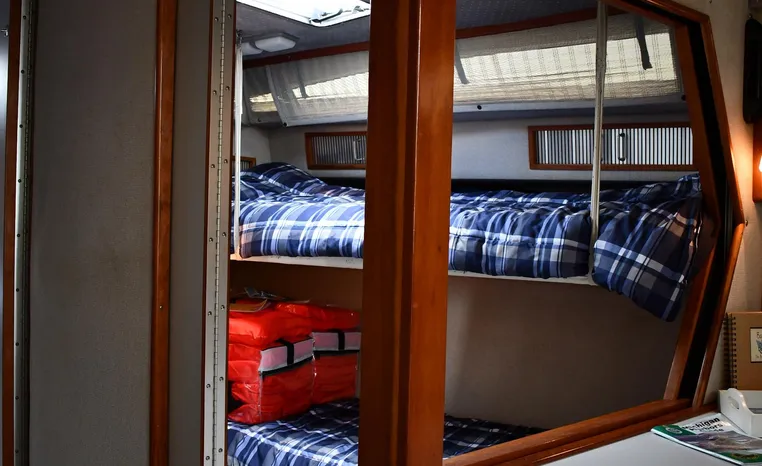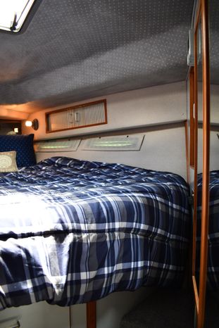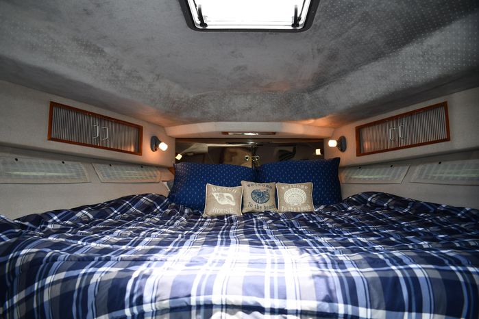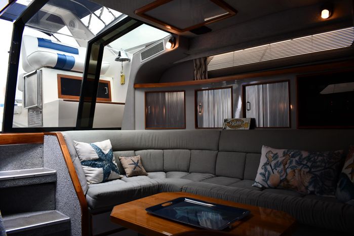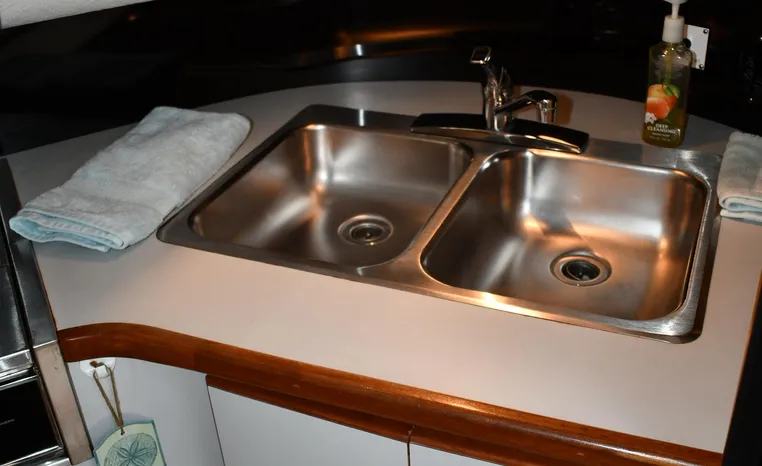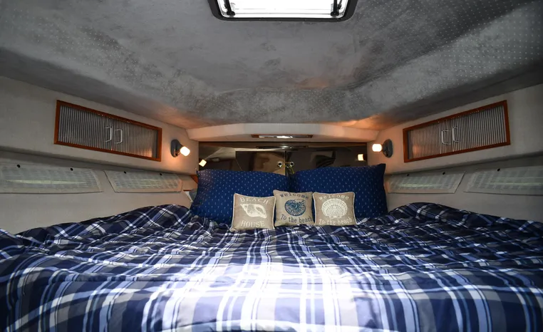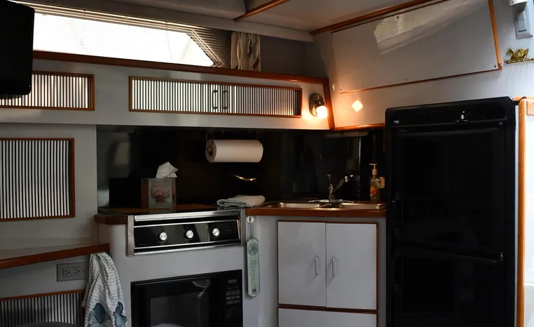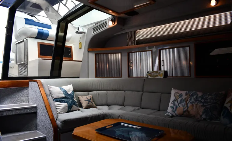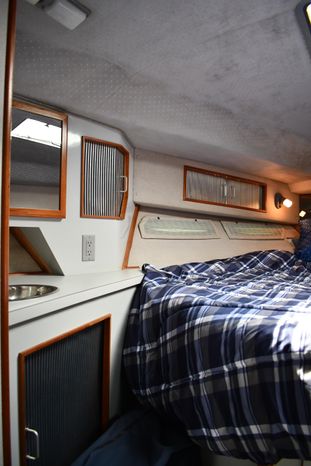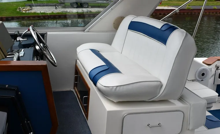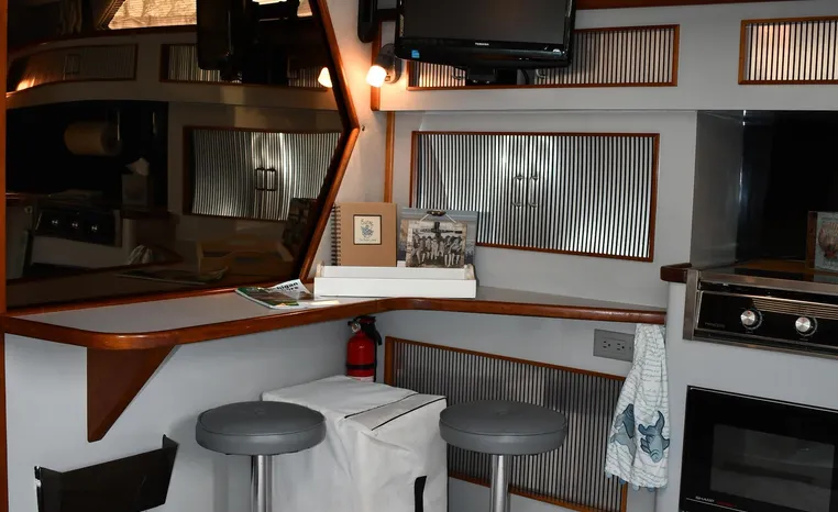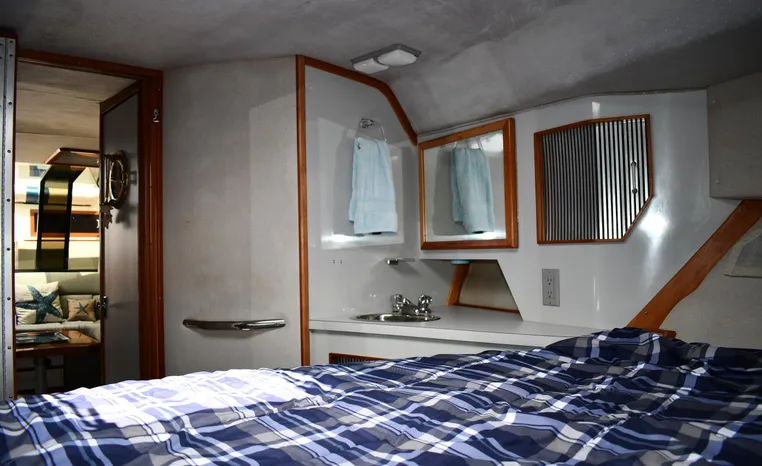 The 390 Express Cruiser turned out to be one of the most popular boats ever built by Sea Ray. First of the big production express boats when she came out in 1984, her sleek lines and European styling--tame by today's design standards--made a lasting impression on the mid-1980's sport boat market. Below, her expansive two-stateroom interior is arranged with a queen berth forward and a combined galley-and-breakfast bar facing the curved settee in the salon. The guest stateroom is unique: it's separated from the salon by a retractable mirrored bulkhead. Slide it away, convert the bunk berths into a sofa, and the area actually becomes part of the main cabin. The 390's interior was updated twice over the years changing from the original wood grain mica to teak in 1986, and to a white-mica/teak-trim decor in 1988. Topside, the single-level cockpit is huge with seating for as many as eight passengers.