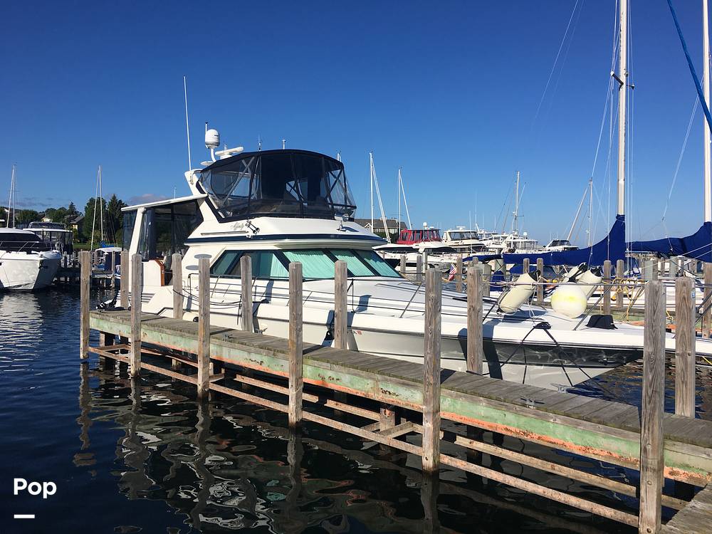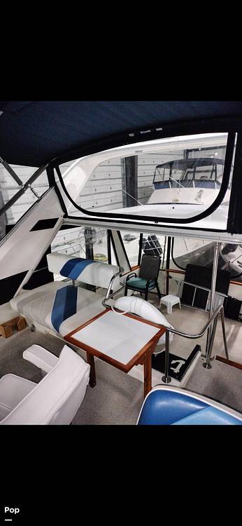 This Sea Ray 440 is unique, has been a Michigan Lake Motor Yacht all its life, it's one of a kind, and stored in a climate heated control facility and cannot be moved at this time but can be visited and inspected. She has been well maintained with original engines that have around 1,100 hours on twin 3208 Caterpillar, which will take you anywhere. One person can handle this motor yacht with its Bow and Stern Thrusters, installed in 2020, as well as up-to-date electronics. The bridge is fully enclosed with new isinglass and a Bimini top