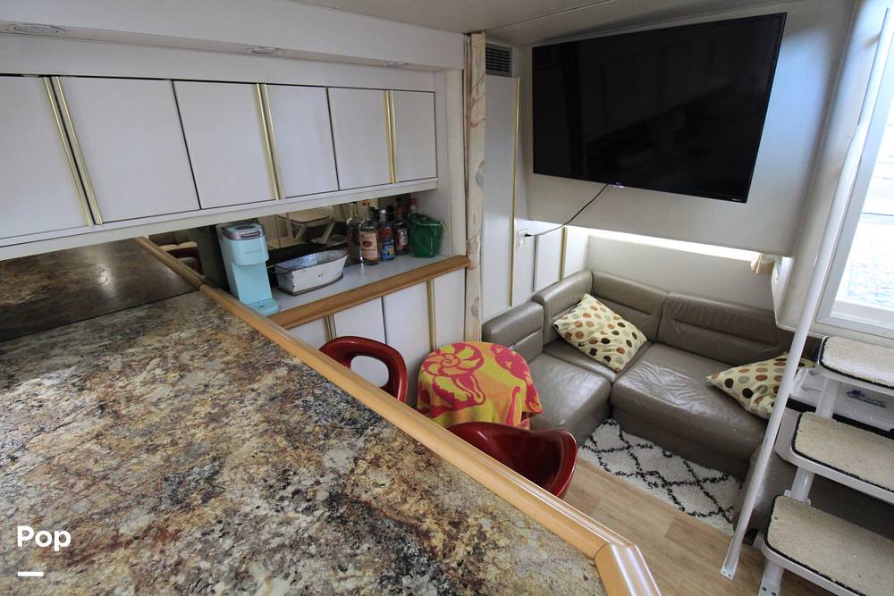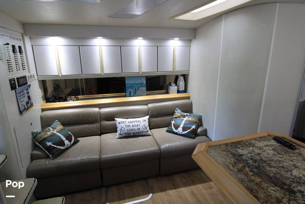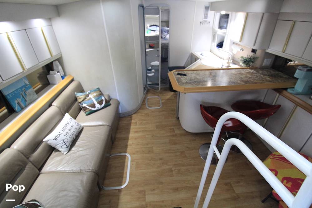 There is a full head with a separate shower as well as a convertible sofa/berth below the cockpit in typical express cruiser style.