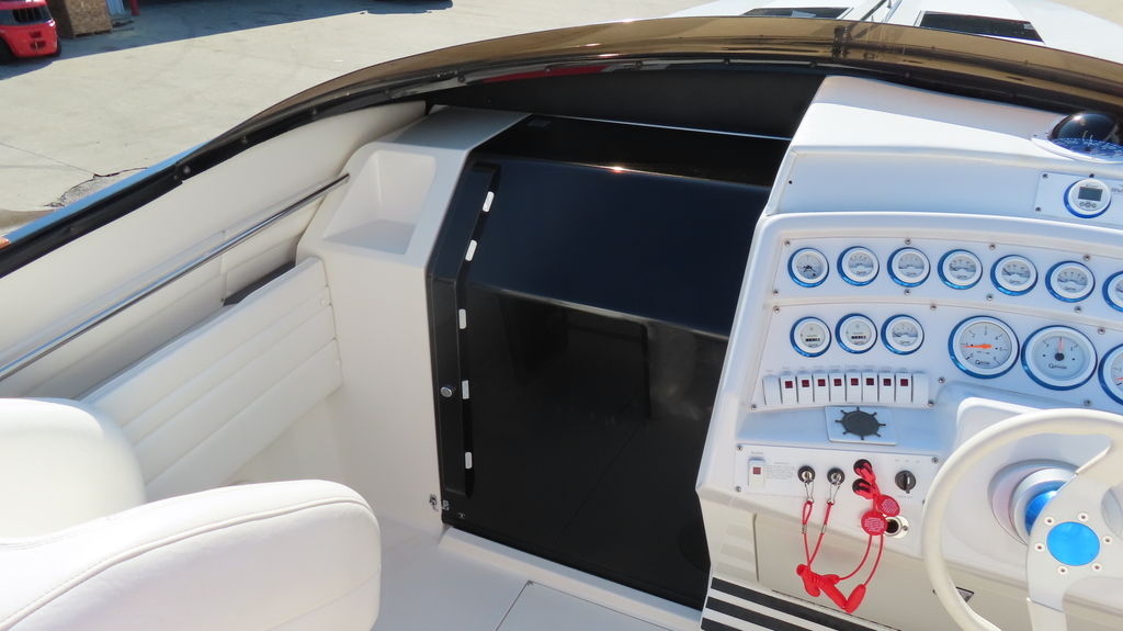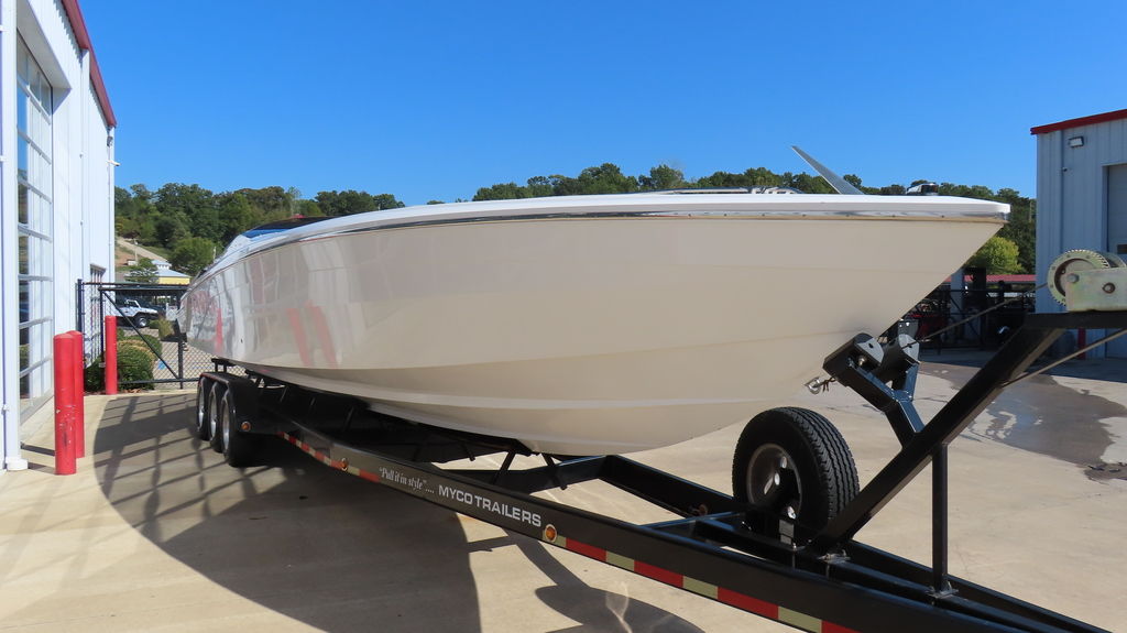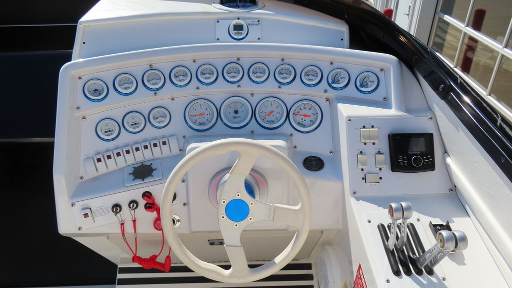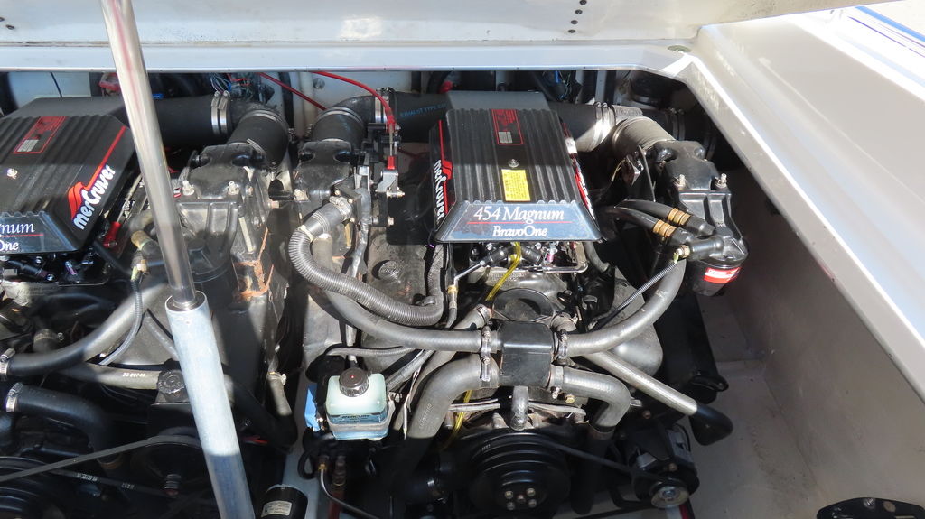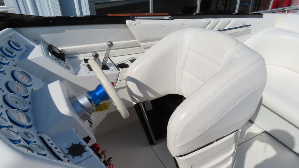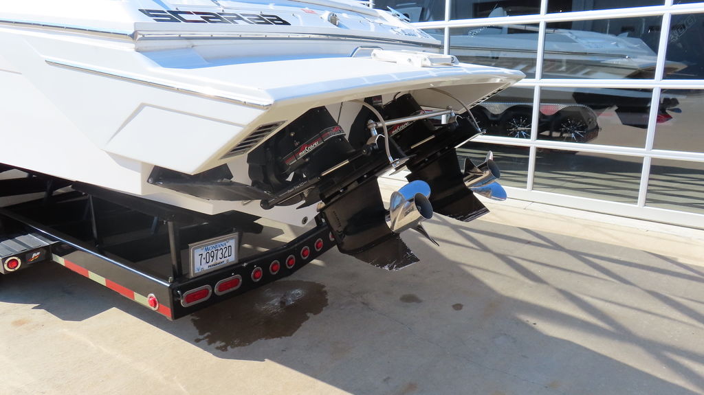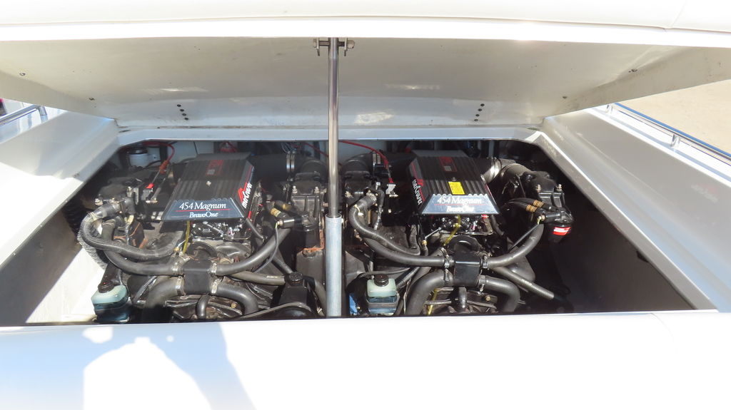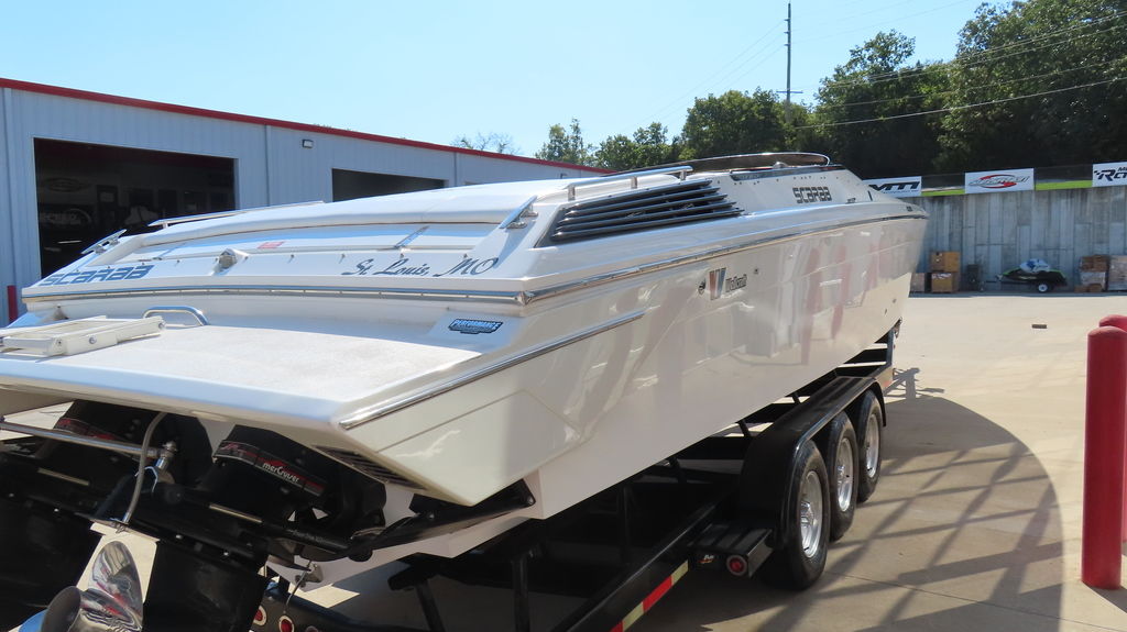 1990 Wellcraft Scarab 38 powered by twin Mercury 454, Bravo 1 drives, kplanes, drive showers, Swim platform, Swim ladder, Gaffrig gauges, Gaffrig controls, Rockford Fosgate stereo, Helm remote, Compass, Halon system, Shore power, Full cabin, Enclosed head, Cooler, no trailer, trailer available