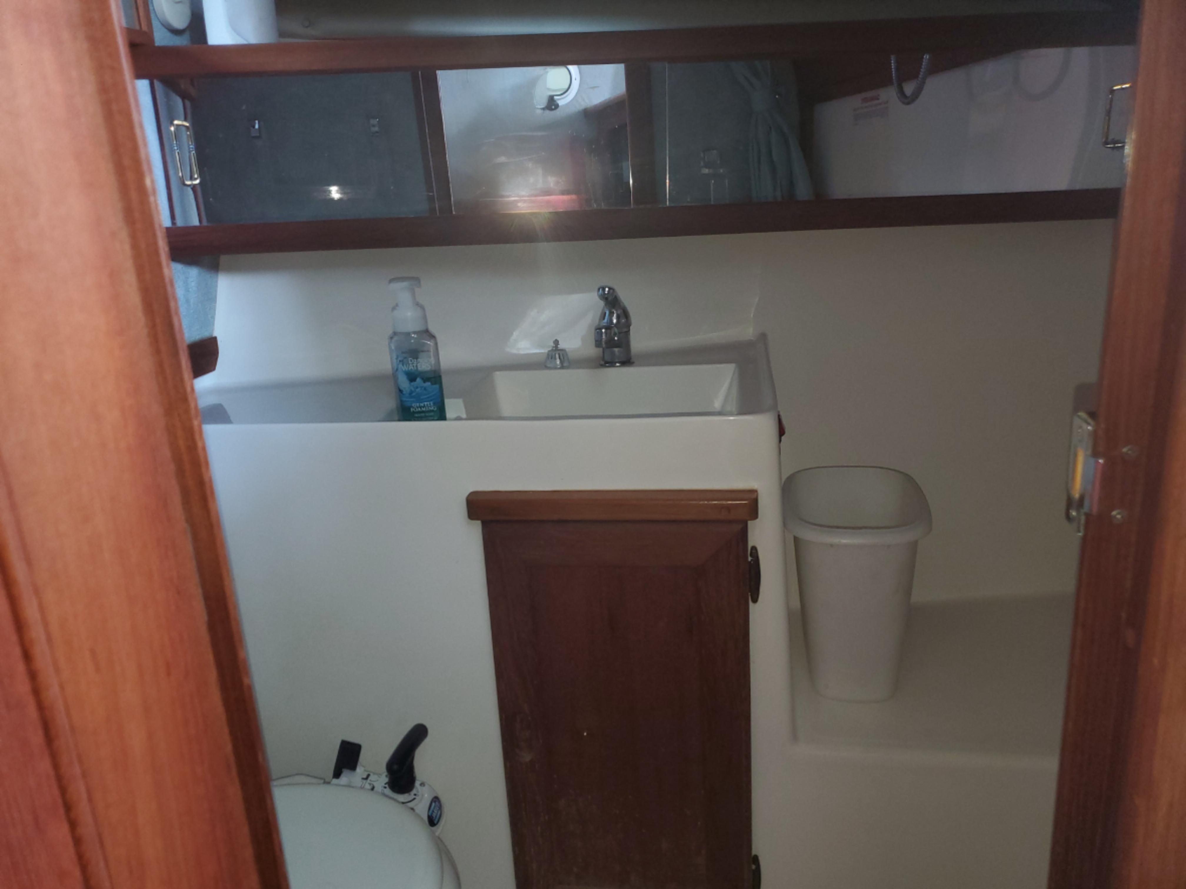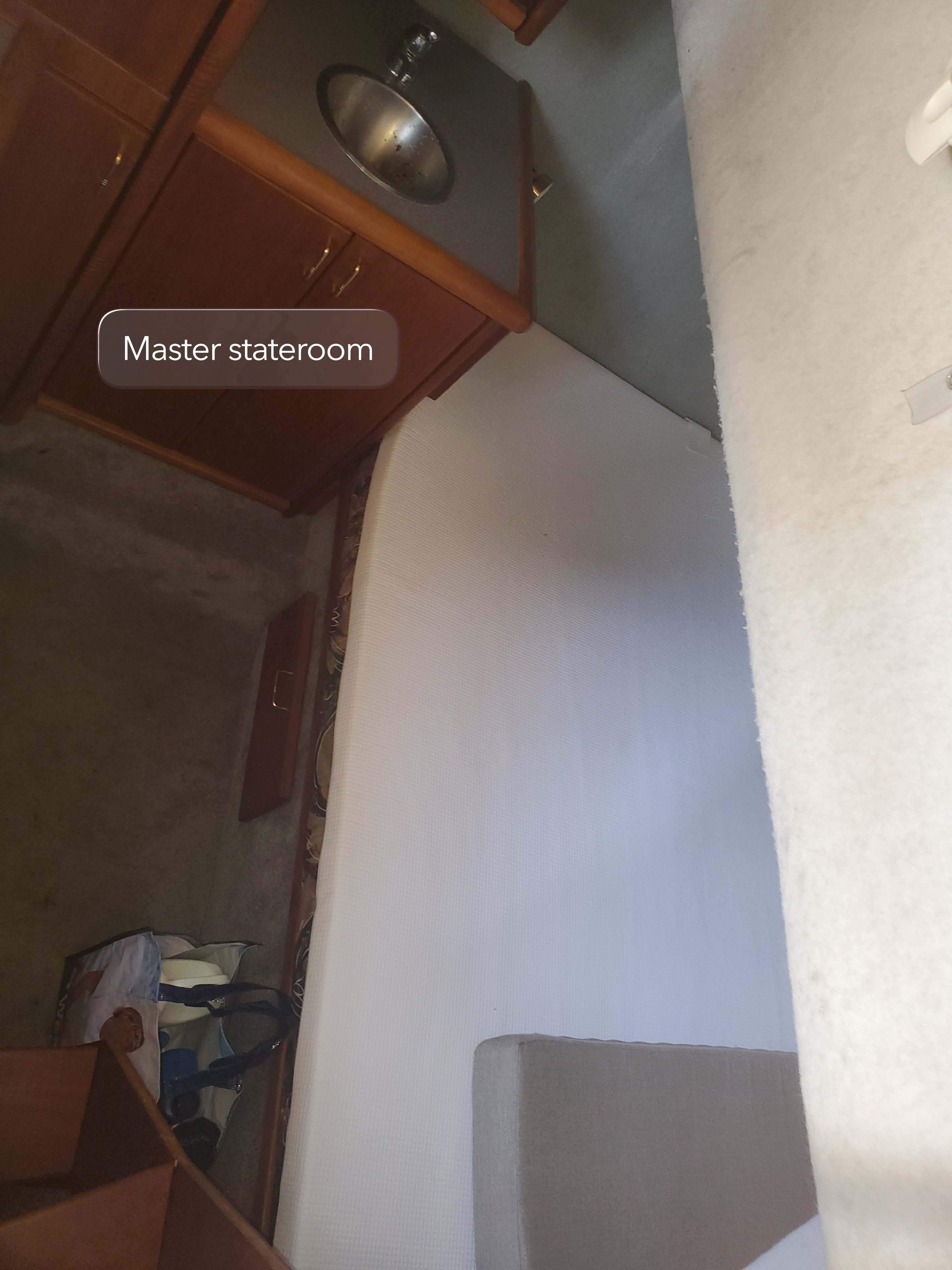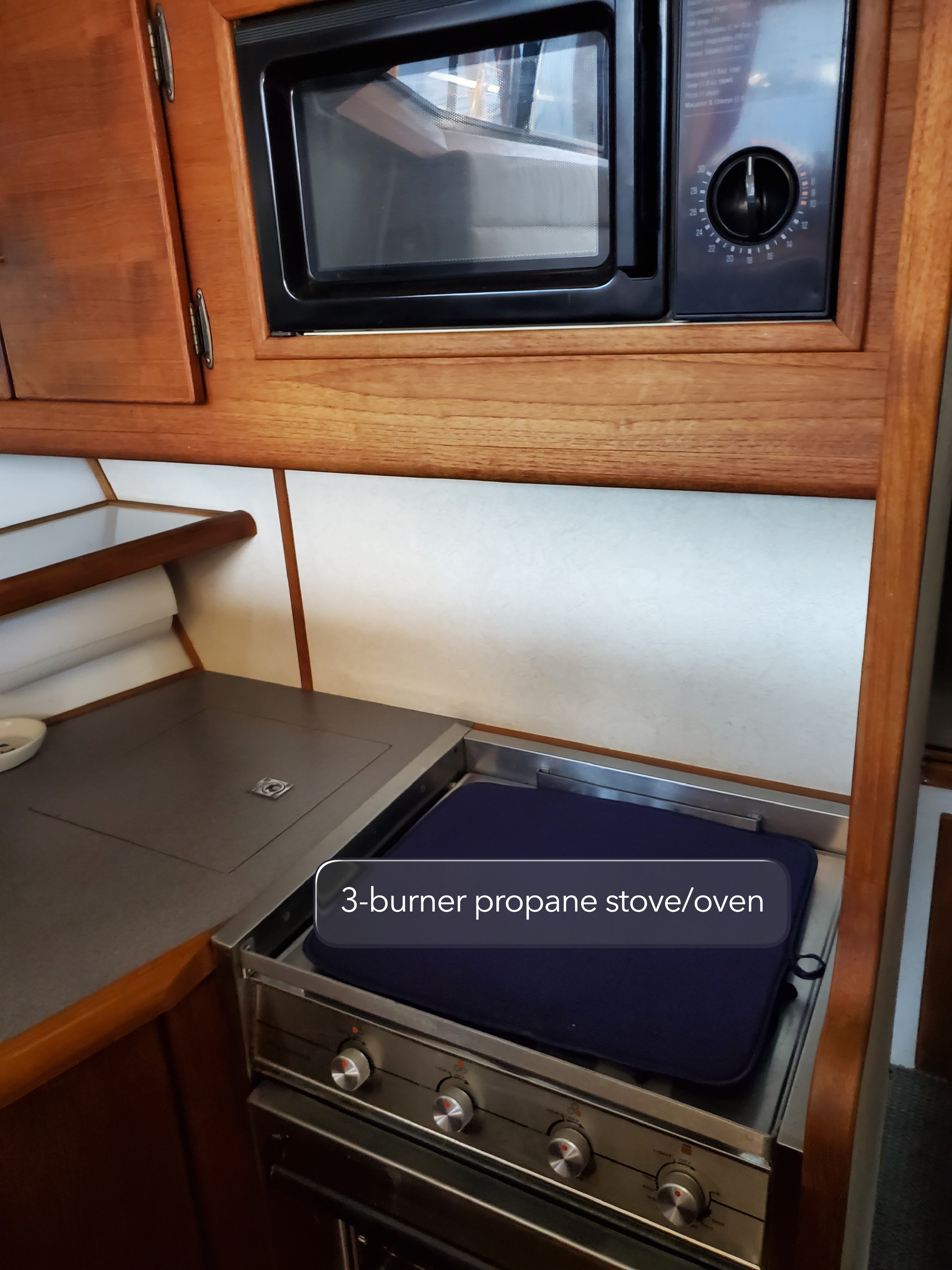 This versatile boat accommodates 6 adults (2 in the v-berth, 2 on the settee, and 2 in the stateroom), or 4+ kiddos and 4 adults (adults in the v-berth and settee and kiddos in the stateroom king bed).