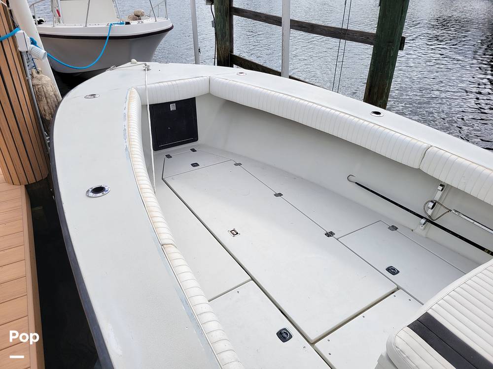 The console has a pass-thru storage compartment, easy access to the electrical panel and a built in seat cooler. Electronics consist of a Humminbird Helix 9, VHF radio and stereo. There are under the gunnel LED lights.