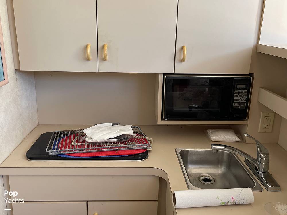 The single-stateroom with queen size bed and a full-size, convertible dinette can sleep four. The galley has a microwave, refrigerator/freezer, and sink.