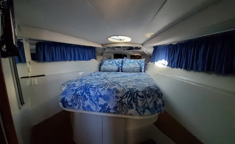 This yacht has been meticulously maintained and updated throughout, reflecting careful ownership and pride of care. The interior is spacious and functional, equipped with a full-size refrigerator and freezer to support longer trips and comfortable onboard living. Power is provided by twin Crusader 7.4L gasoline engines with 1,658 hours, both featuring closed-cooling systems for longevity and dependable performance. Electrical needs are supported by a Westerbeke 15kW generator with 1,358 hours, also closed cooling.