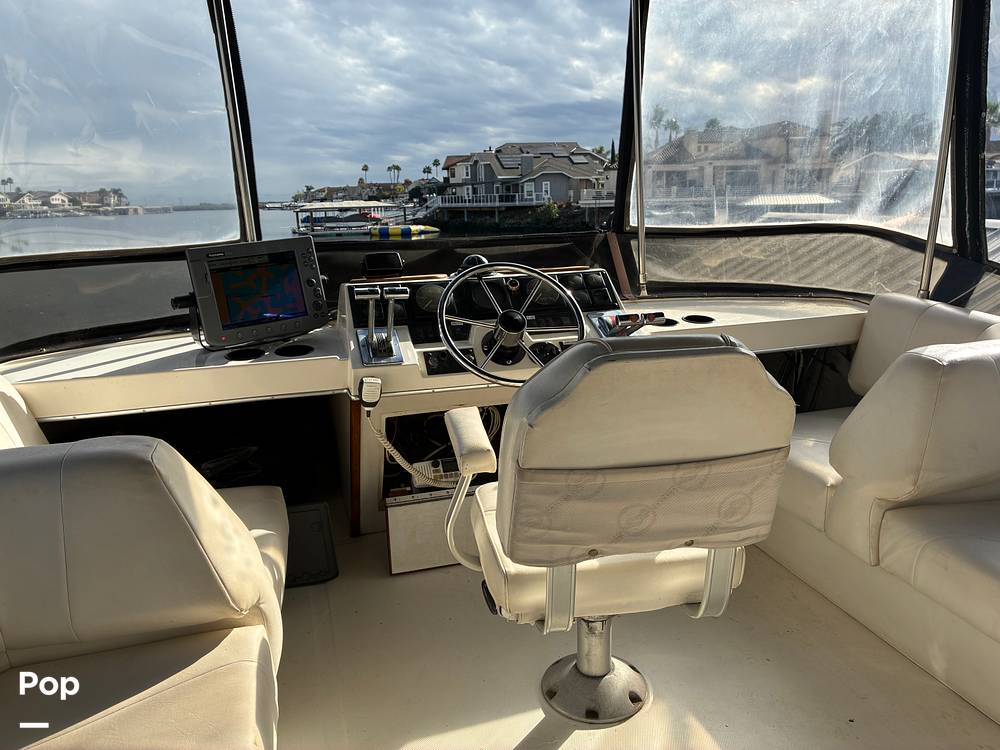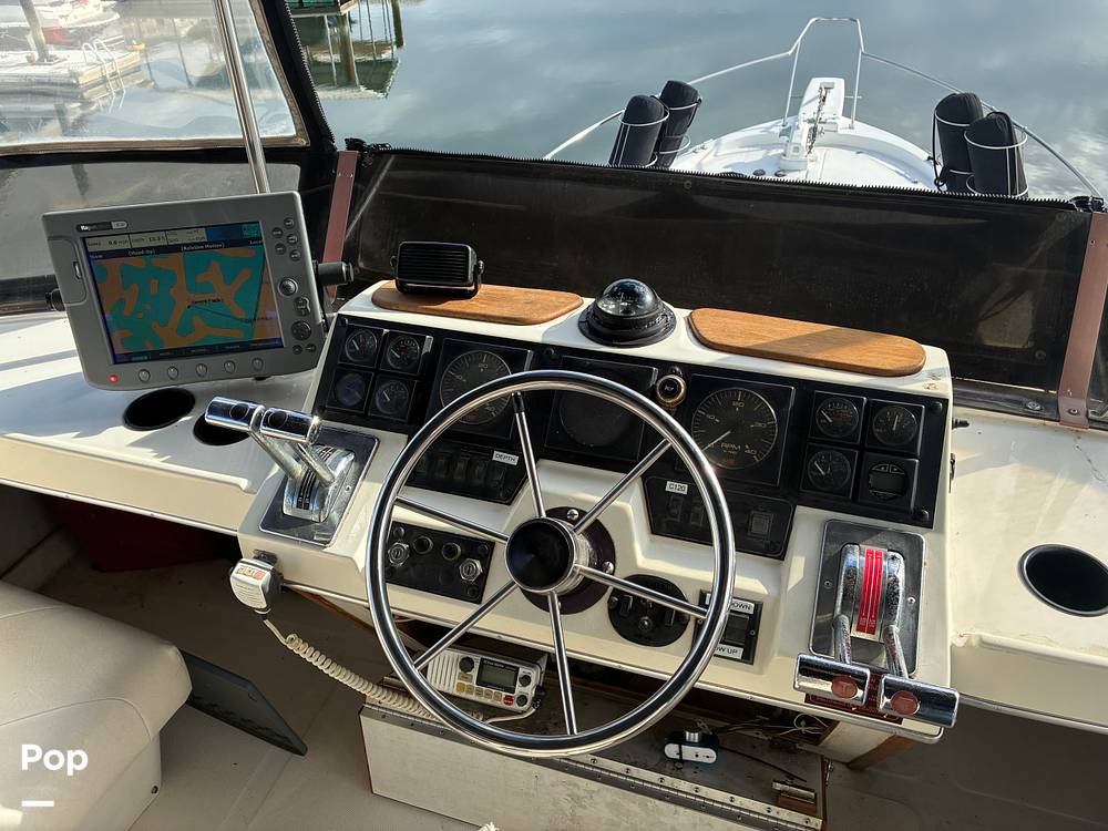 The exterior has been thoughtfully upgraded, including a professionally added swim platform, while the flybridge features custom Isinglass with coverings and the cockpit has mesh screens and full canvas covers, providing protection from the elements without sacrificing visibility. Additional upgrades include Radar, GPS, Xantrex multi-stage 40 amp battery charger, brand new 14k BTU A/C with reverse cycle heat, and an Electro Scan Type I Marine Sanitation System, ensuring modern sanitation standards are met. The large cockpit and flybridge offer excellent spaces for relaxing, entertaining, or enjoying panoramic cruising views.