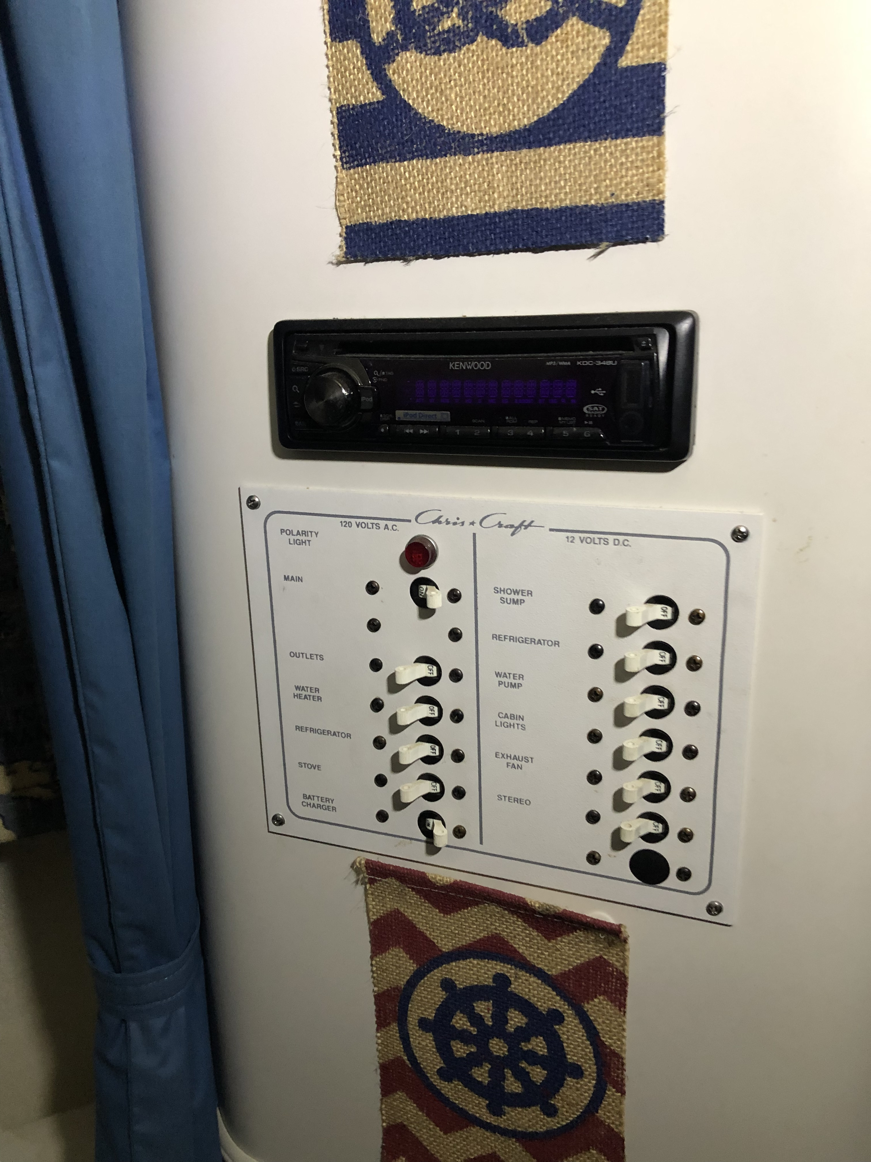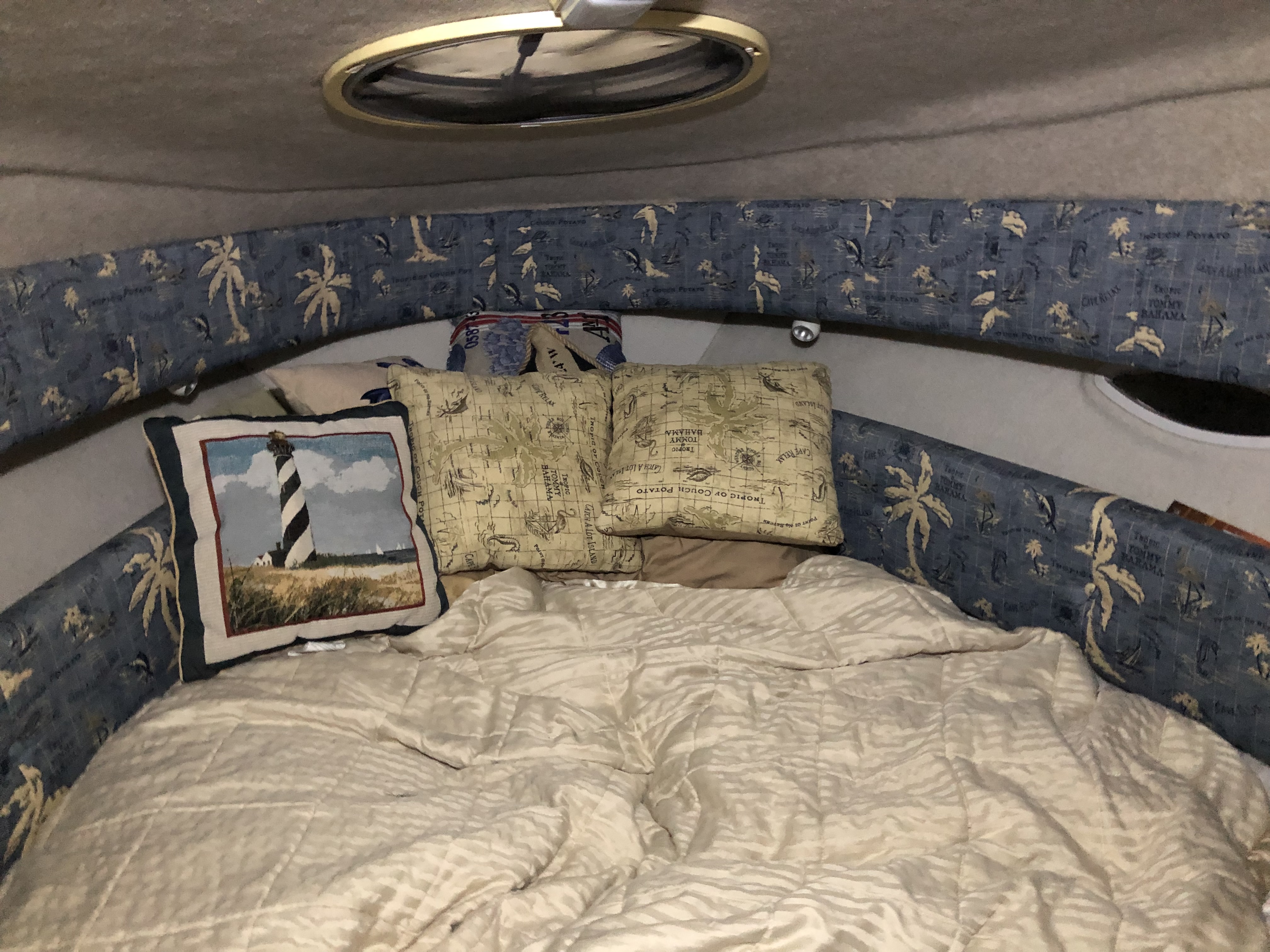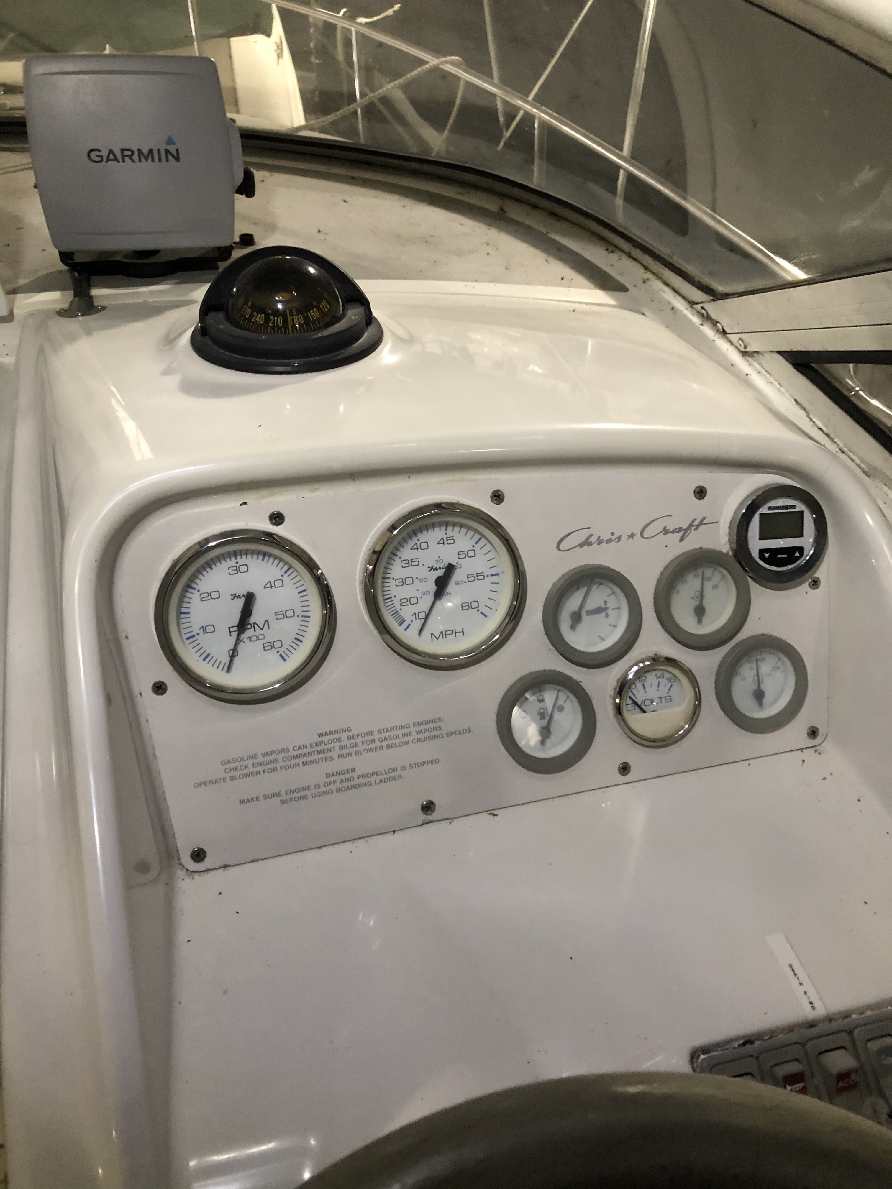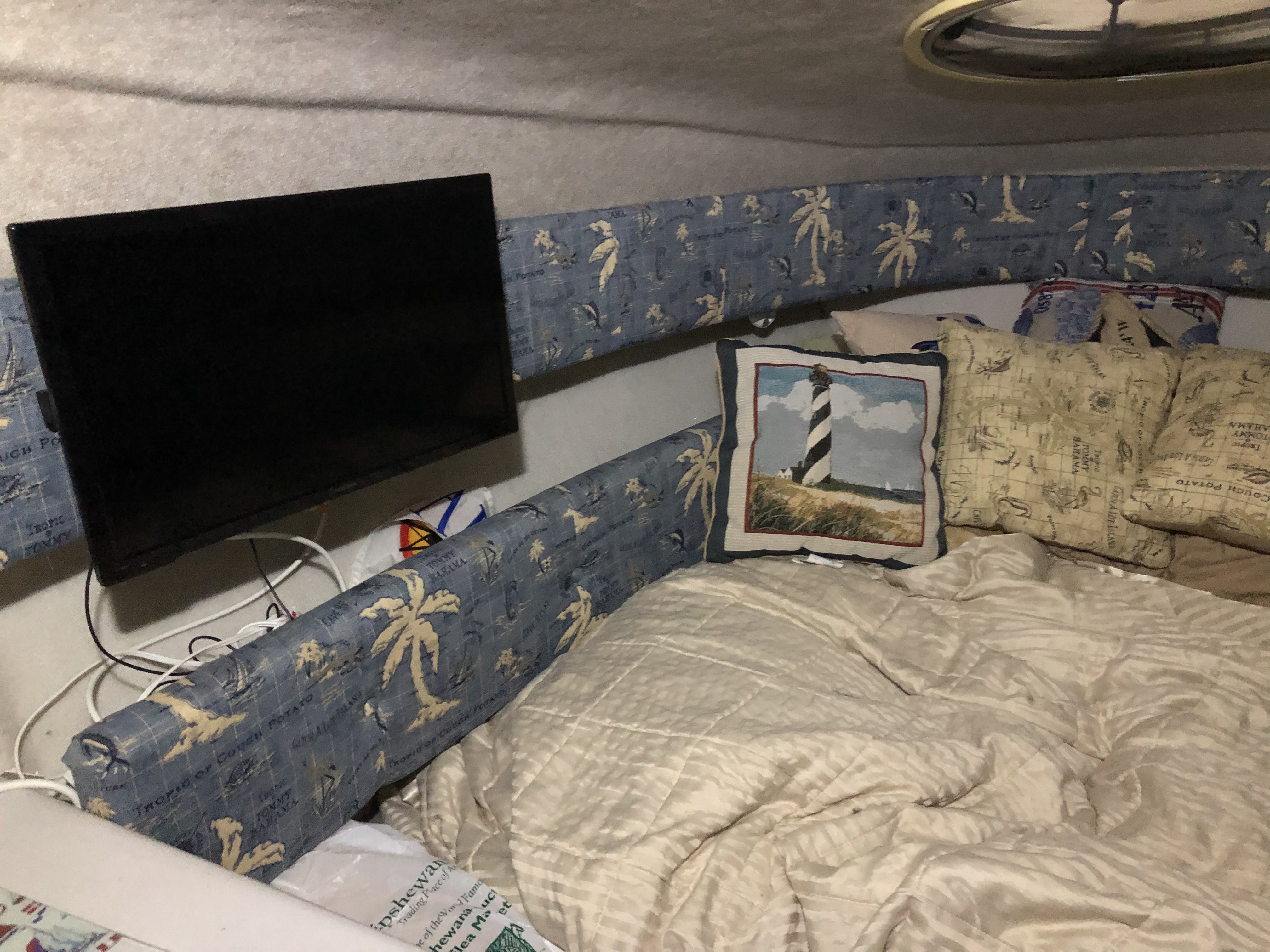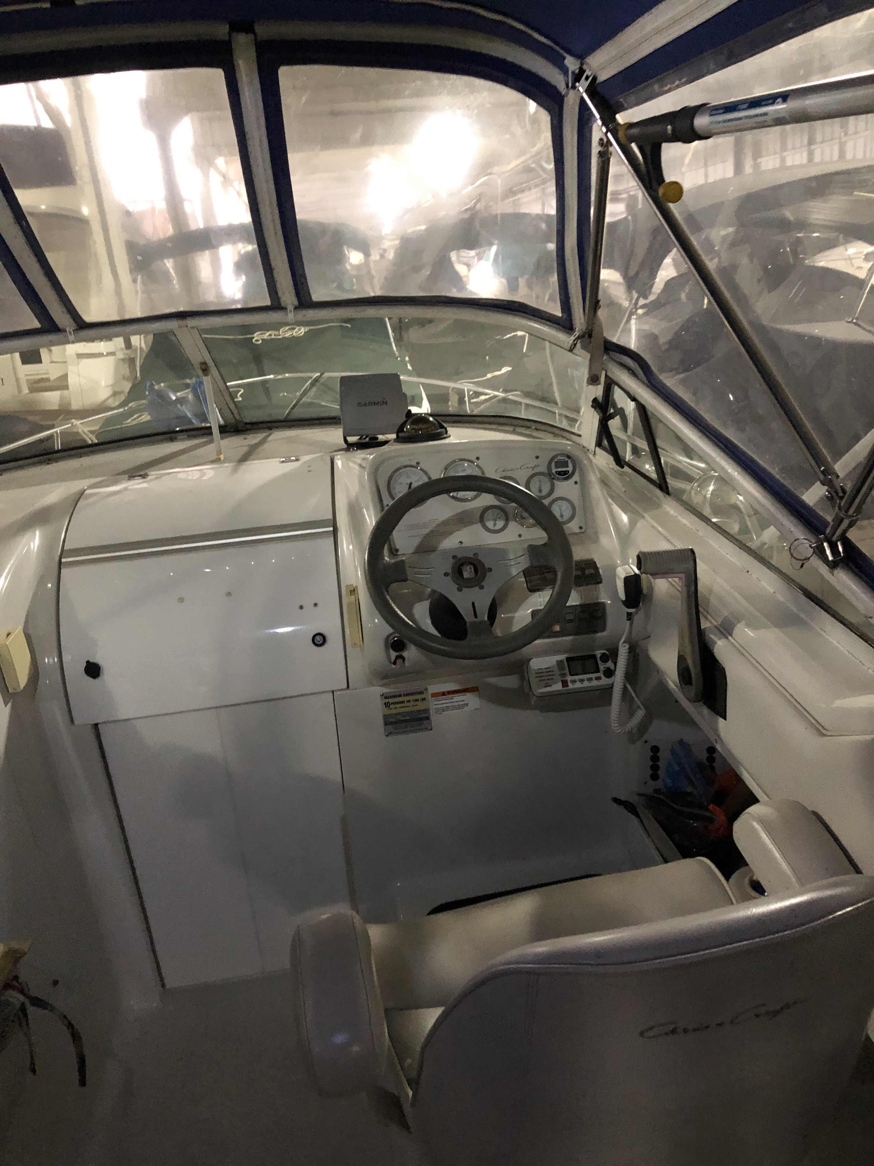 Boat comes with a new ship to shore radio, Garmin GPS, antenna, life vests , mounted flat screen tv, and many assortments.