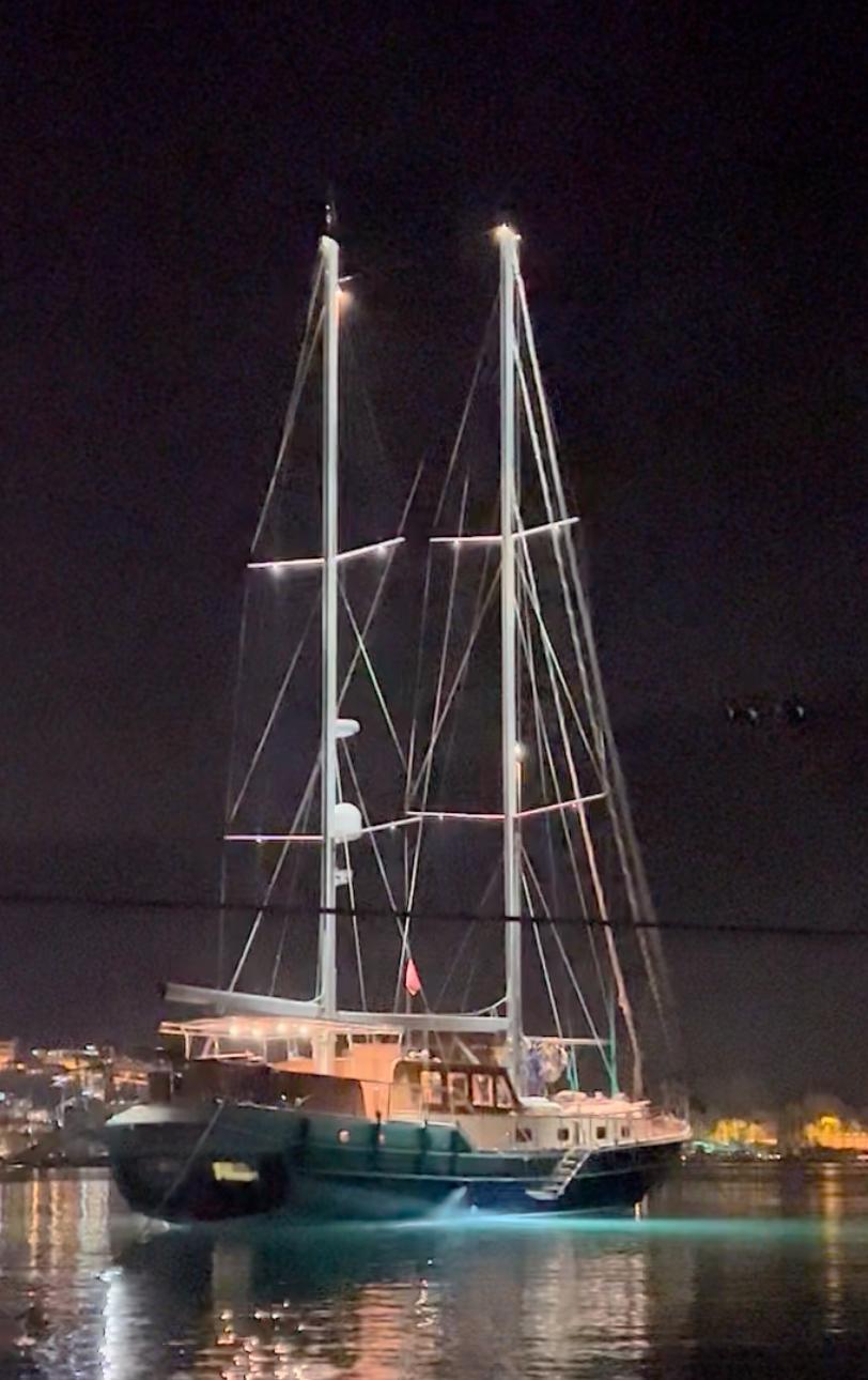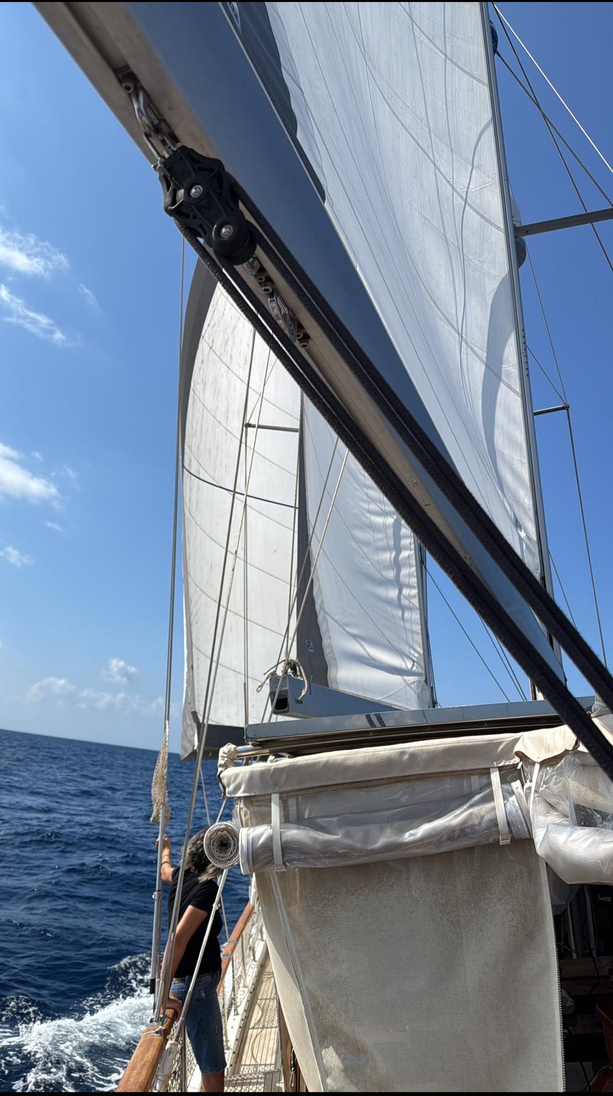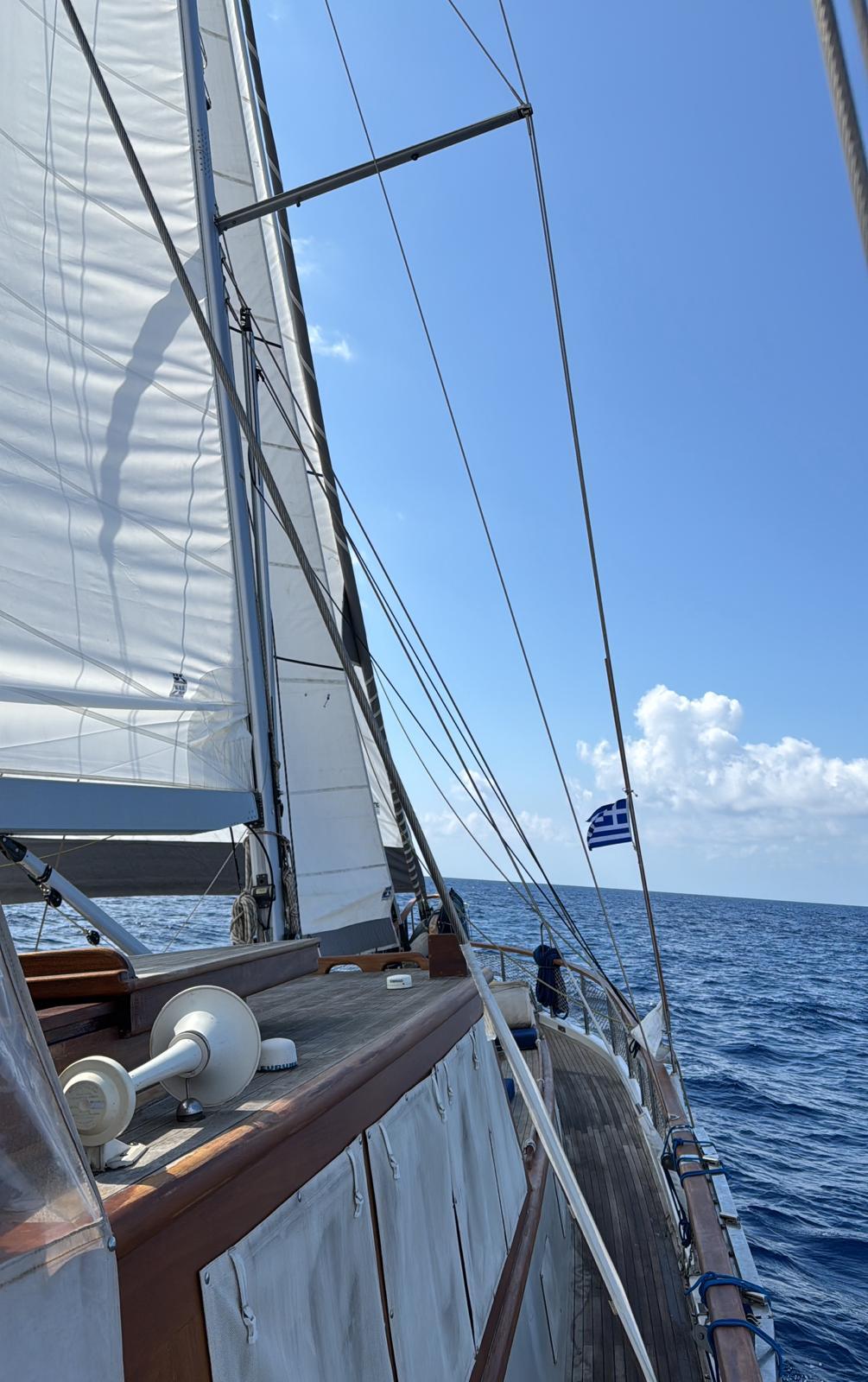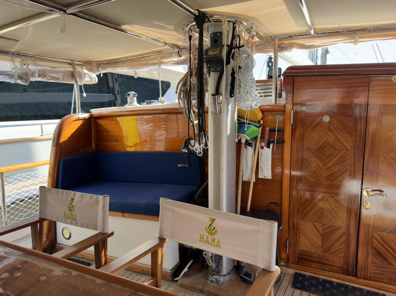 HAMA blends timeless wooden craftsmanship with modern reliability. Her three-layer laminated hull was stripped and recoated in 2022–2023, restoring rich navy gloss and structural integrity. You’ll feel her solid vaka-like stability under sail, whether you’re cruising the Aegean or anchoring in a secluded cove.