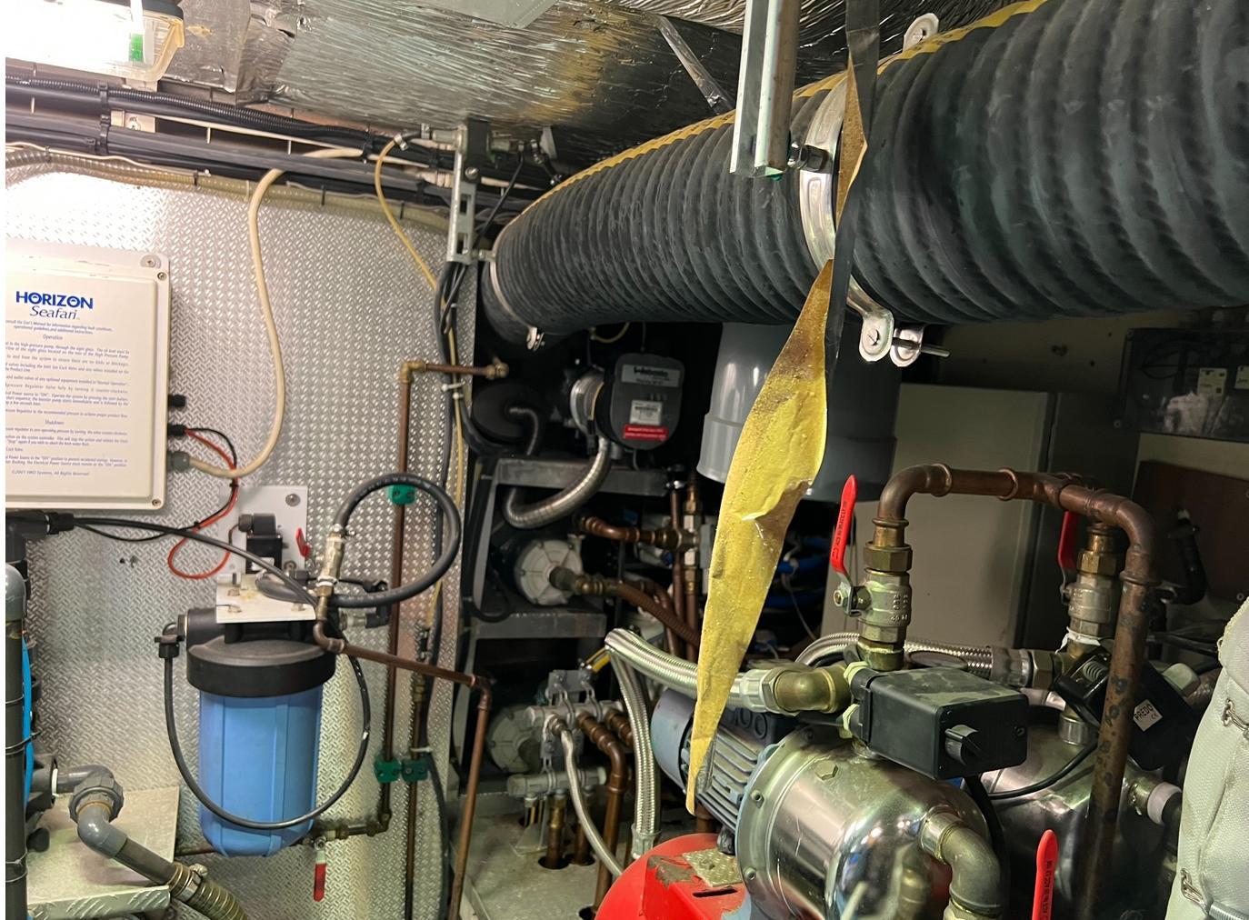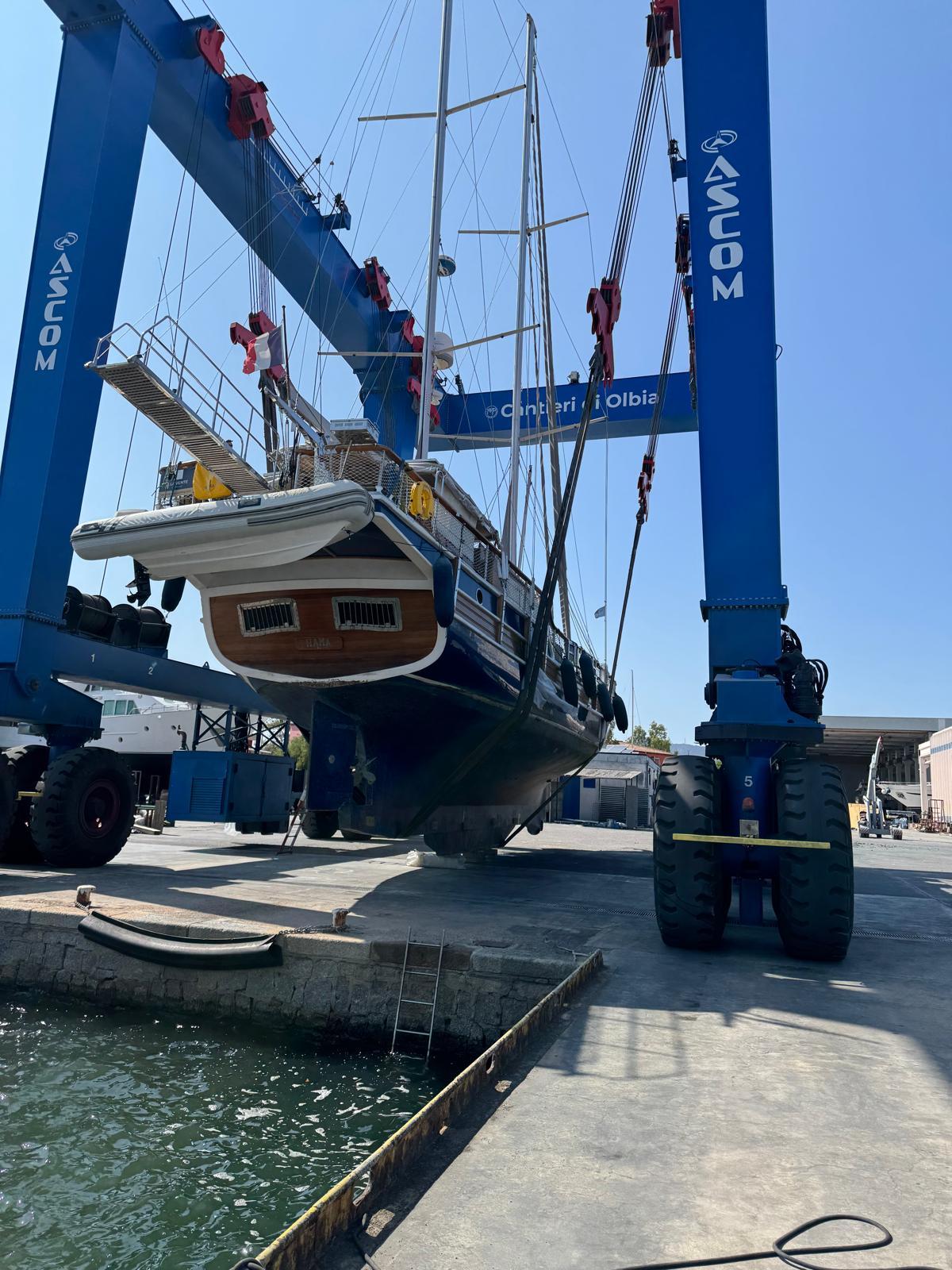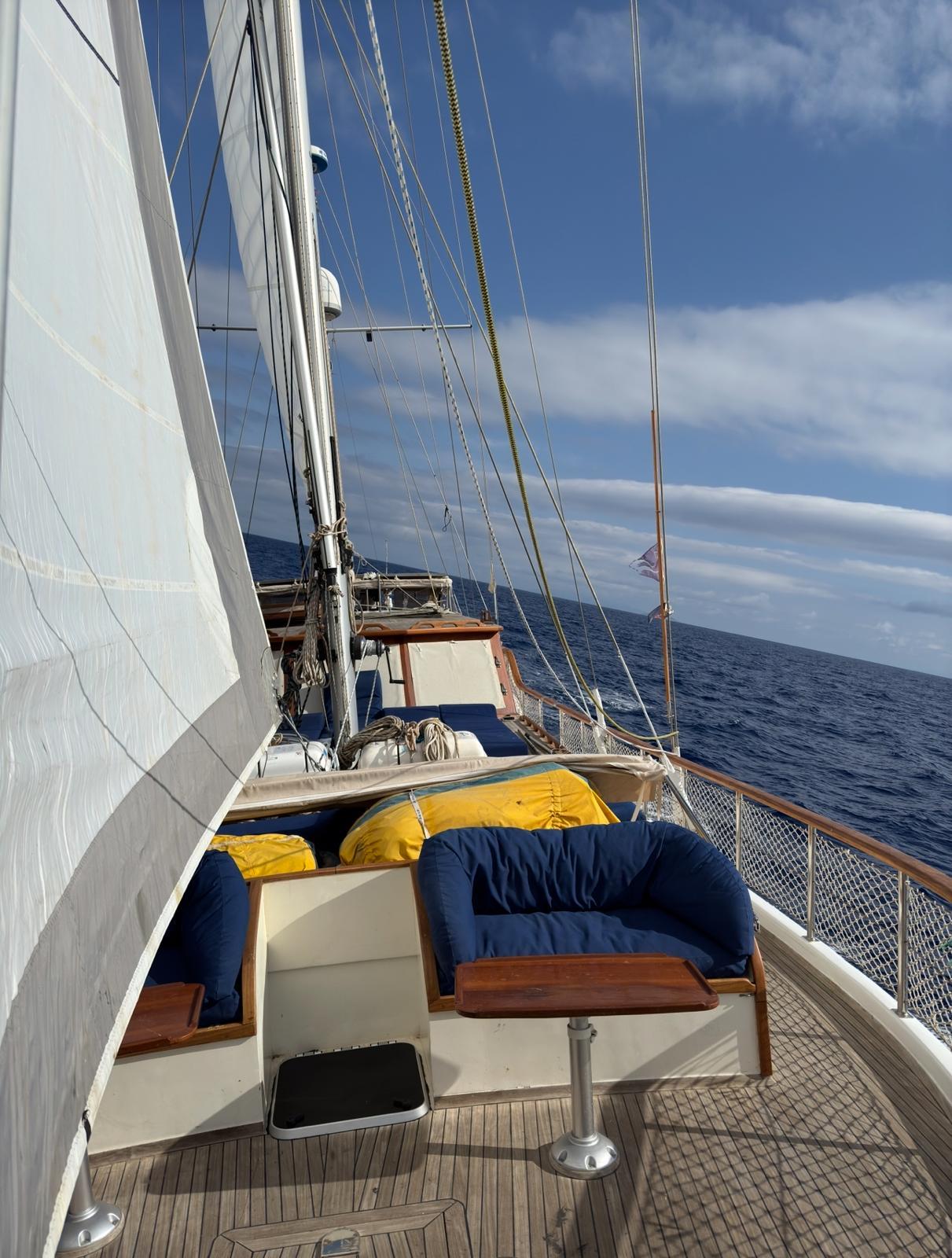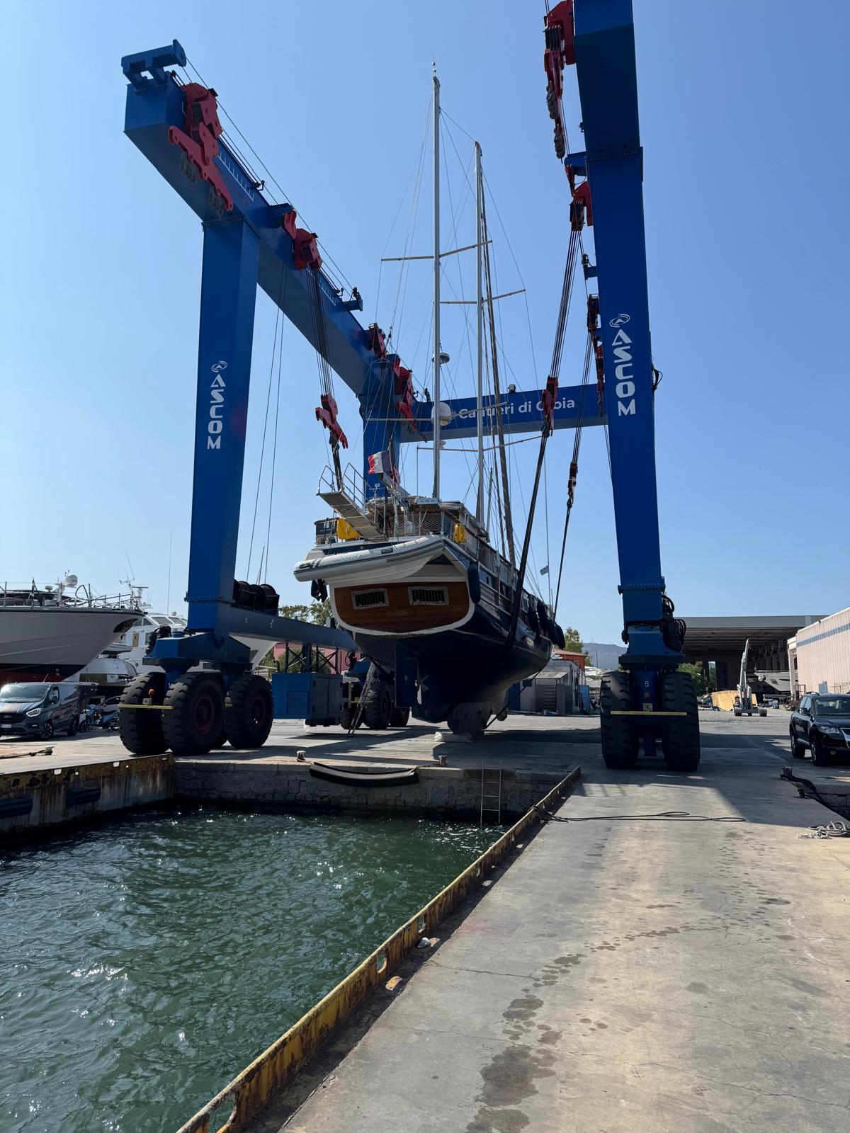 Triple-laminated wood hull (epoxy-coated) refinished 2022–2023 · Stainless steel tanks (4 000 L fresh · 2 000 L black · 2 000 L diesel) · Horizon Safari watermaker (120 L/h) · Webasto AC/heating · Solar panels + Gel batteries to withstand heat · Full refit of plumbing, wiring, rigging, spars + new Harken hydraulic furlers · Spacious teak deck with cream awnings · Saloon helm station · Full galley · Custom wood interiors · Safety systems fully overhauled