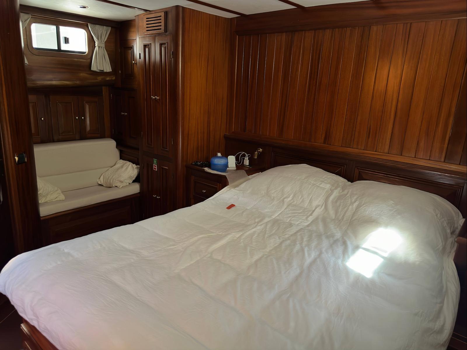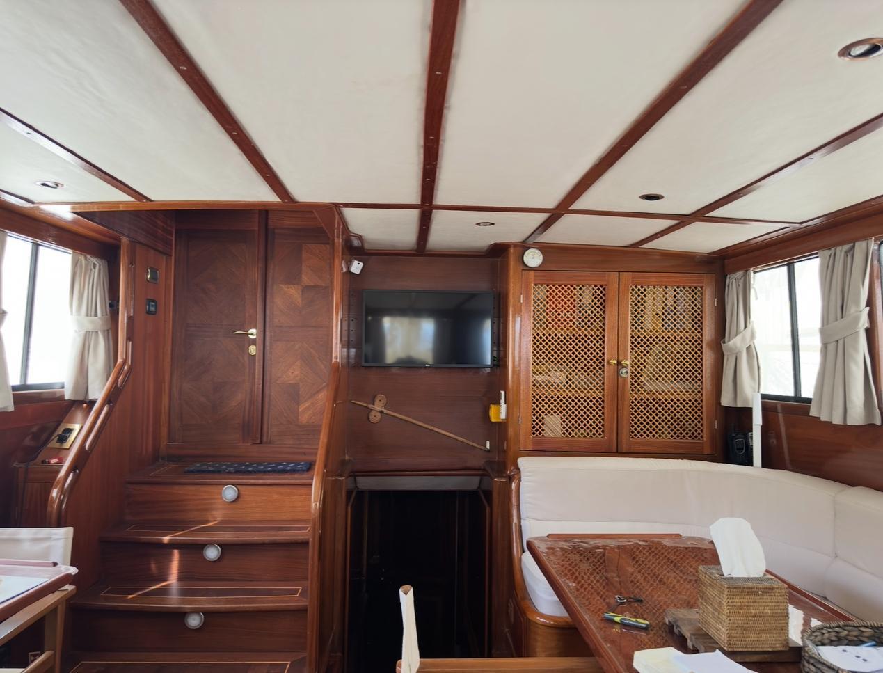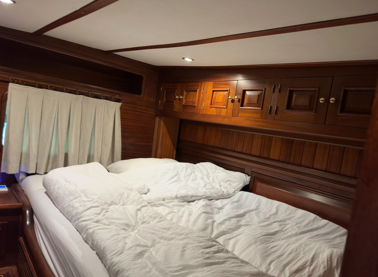 Below deck, fine wood paneling and inlays frame wide windows and breezy cockpits. The large saloon flows to dual helm stations—inside for shelter, outside for the wind in your hair. Air-conditioned cabins, each with ensuite, ensure restful nights. The owner’s and three guest cabins all feature new berths, lighting, and climate control, while a private crew quarter keeps service discreet.