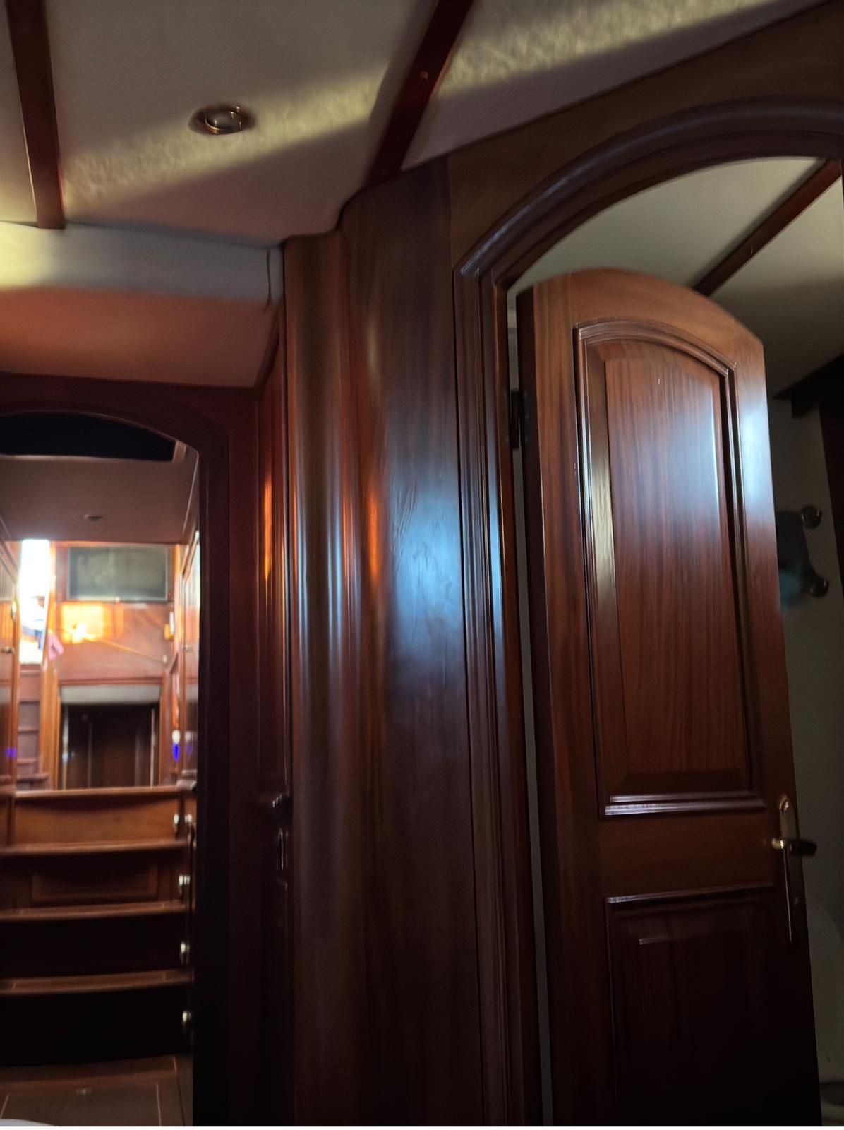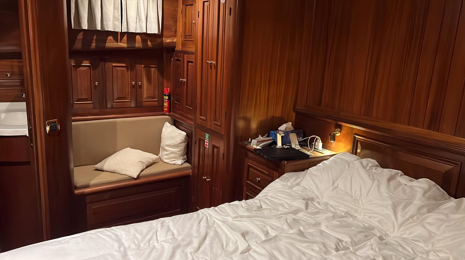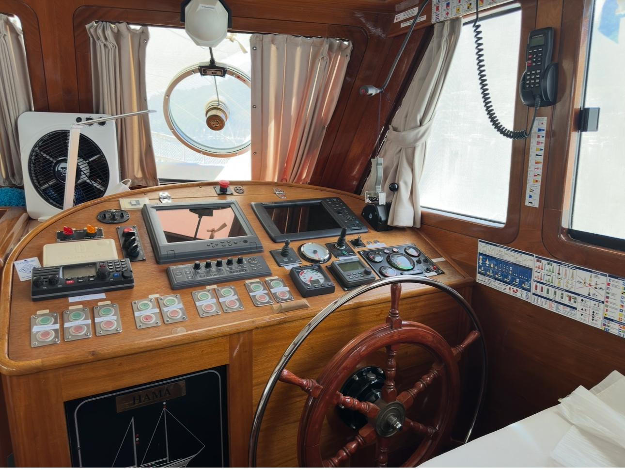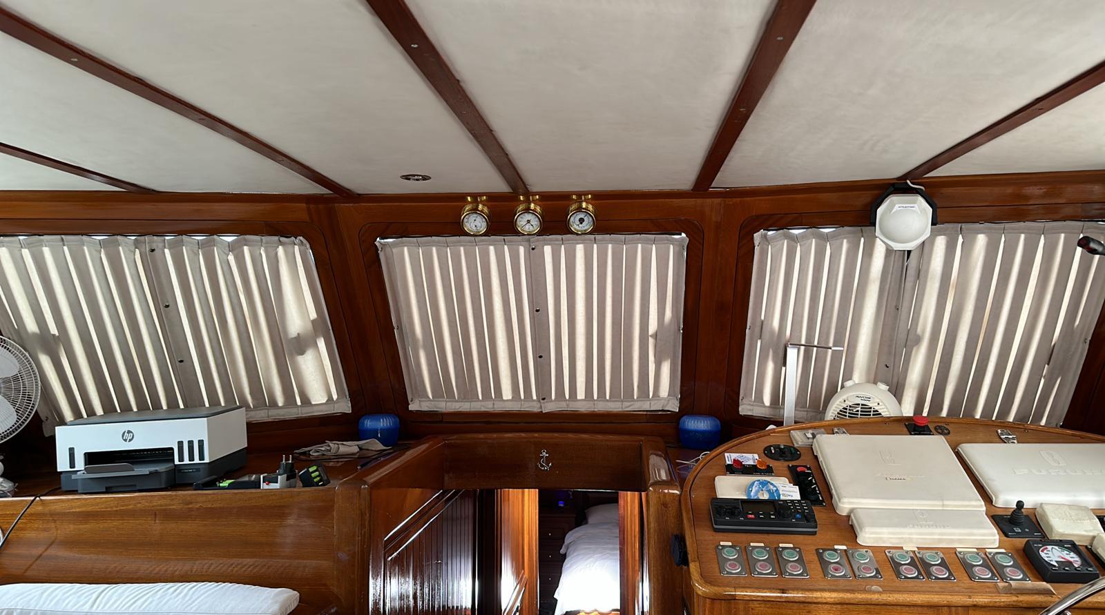 Below deck, fine wood paneling and inlays frame wide windows and breezy cockpits. The large saloon flows to dual helm stations—inside for shelter, outside for the wind in your hair. Air-conditioned cabins, each with ensuite, ensure restful nights. The owner’s and three guest cabins all feature new berths, lighting, and climate control, while a private crew quarter keeps service discreet.
