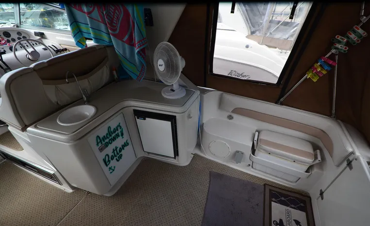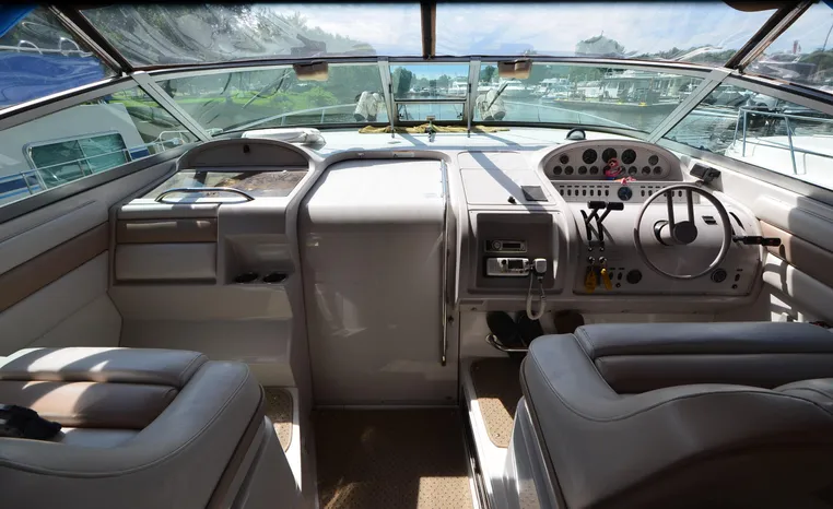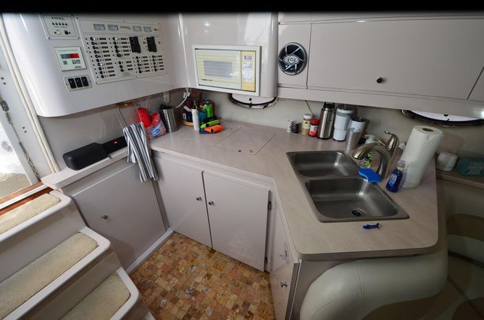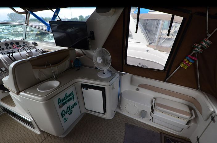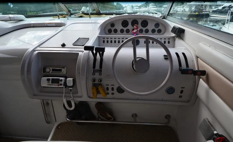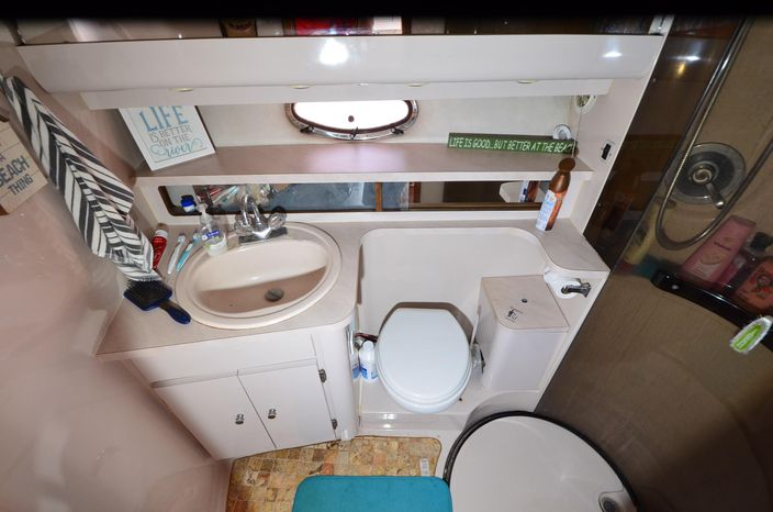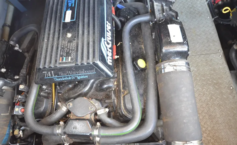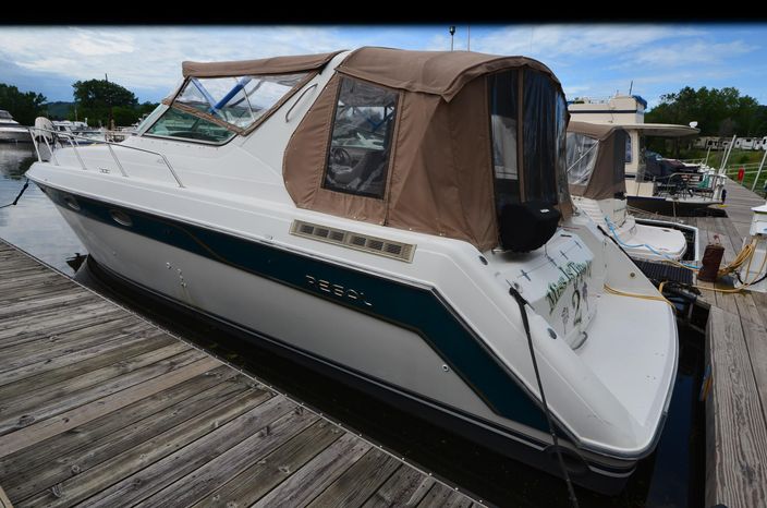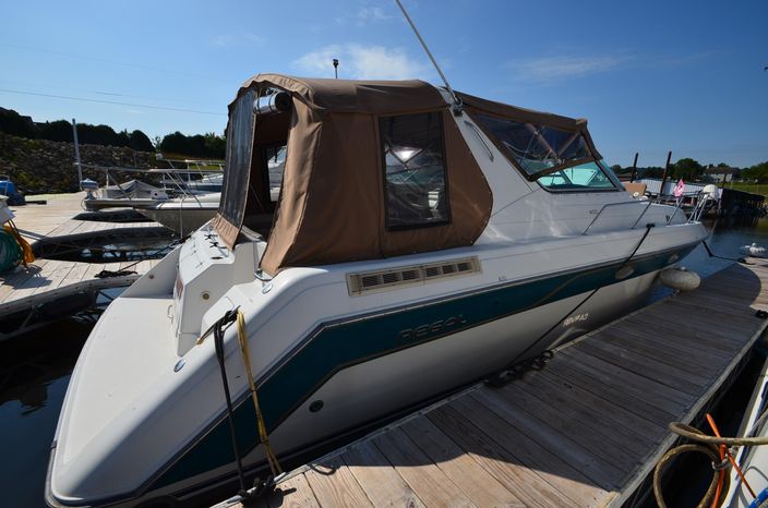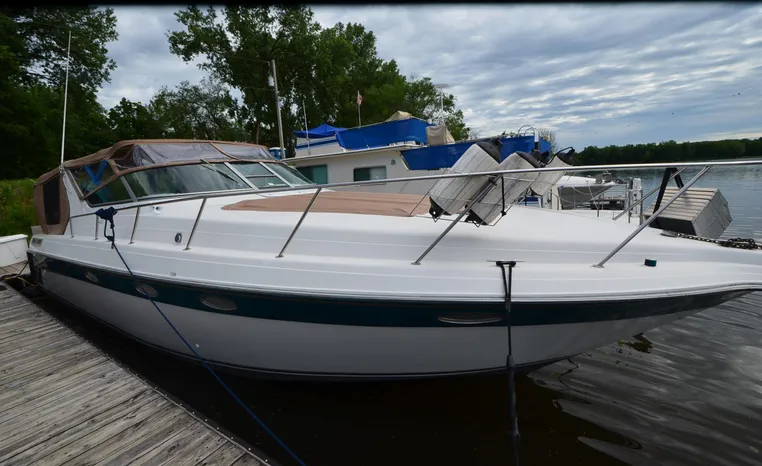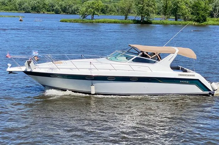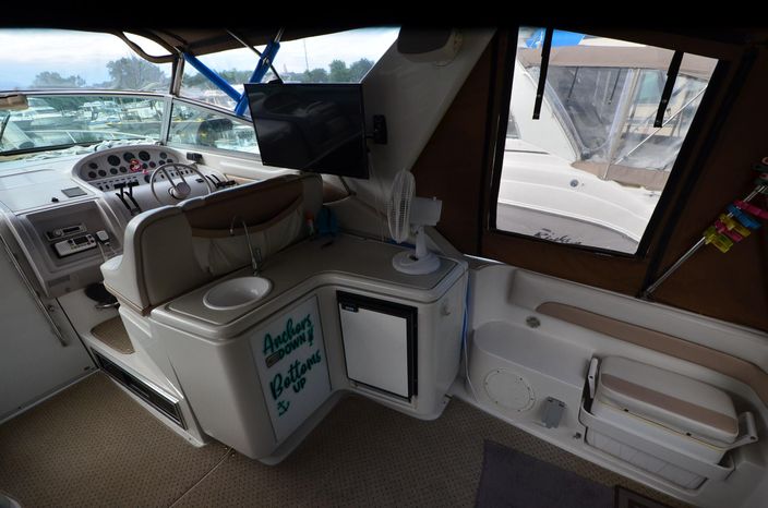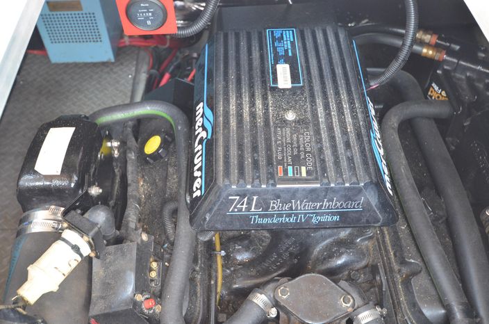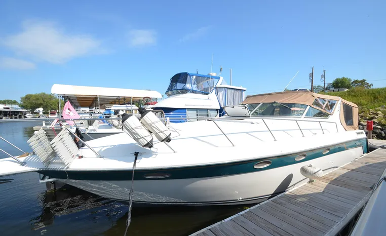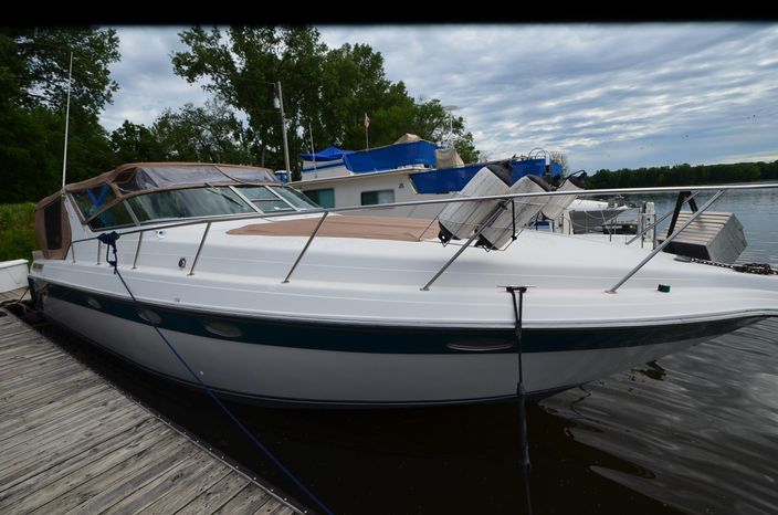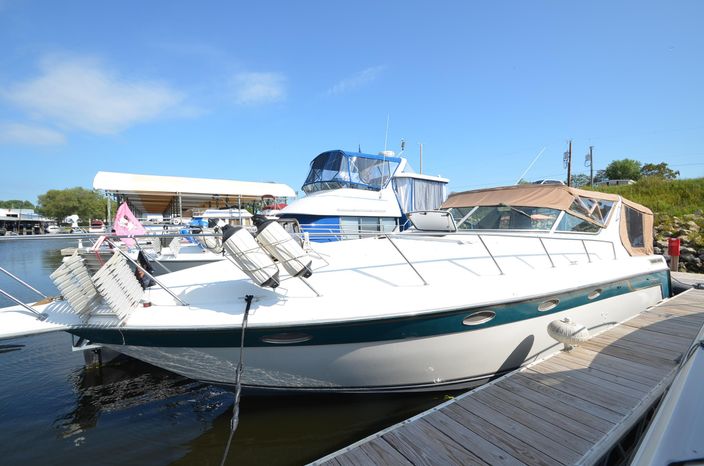 1994 Regal Commodore 400, T-340 HP Mercruiser, GM 454 CID, 7.4L, raw water cooling, 1338 hours, V-drive, Quicksilver 7.5 kw generator, 1962 hours, dual 30amp/125vac electrical service, two shore power cords, five batteries, 50A Professional Mariner battery charger, Marine Air reverse cycle air/heat units, water heater, two Fireboy Zintex carbon monoxide detectors, SeaFyre auto extinguishing system, sleeps six, master stateroom forward with island queen berth, guest stateroom mid-cabin with double berth, off white upholstery, beige carpet, RCA flat screen TV with DVD player, U-shaped convertible dinette sleeps two, double stainless steel sink, Nova Cool 12vdc/115vac refrigerator, two burner Ceran electric stove with cover, Golden microwave oven, electric head new, vanity and stall shower, tan canvas new 2017, bimini and camper top with enclosure and camper screens, Danforth anchor, remote controlled search light, accordion style beaching ladder, four fenders with racks, bow sun cushions new 2018, electronics arch, helm, Boss bluetooth stereo radio, West Marine VHF marine radio, Impulse depth finder, engine synchronizing gauge, double wide helm seat, companion seat, large U-shaped aft bench seat, wet bar w/U-line ice maker (not working), cockpit carpet, transom shower, transom door, pressure dockside water, integral swim platform with boarding ladder, Bennett trim tabs, black bottom paint new 2020.