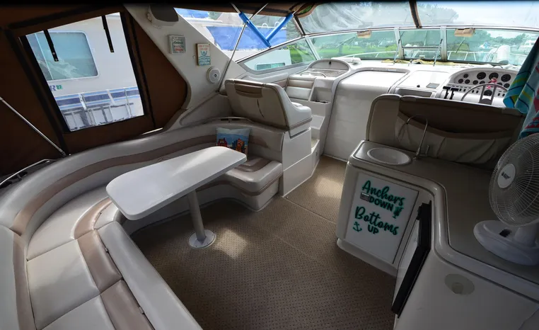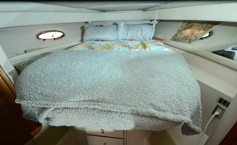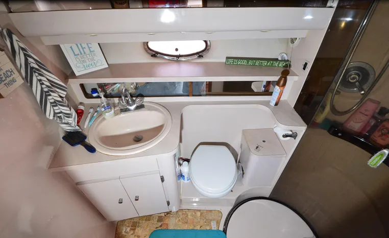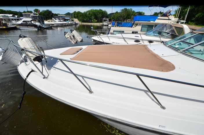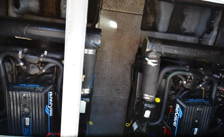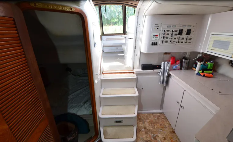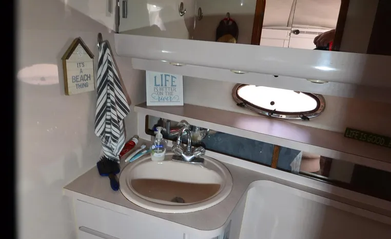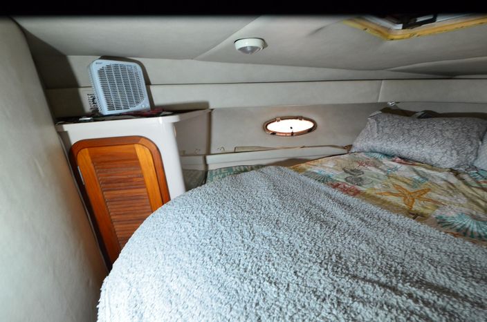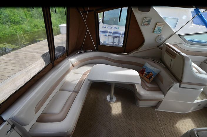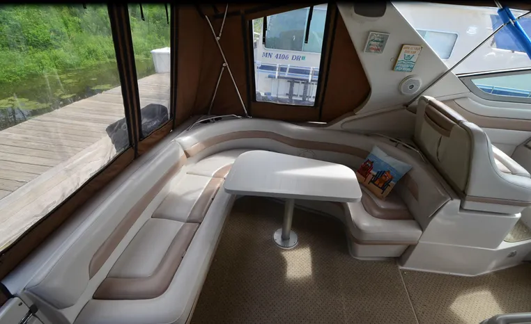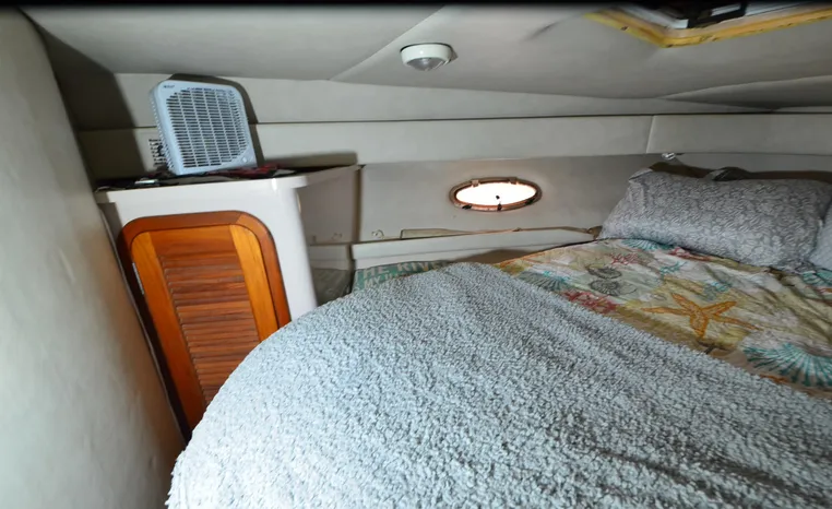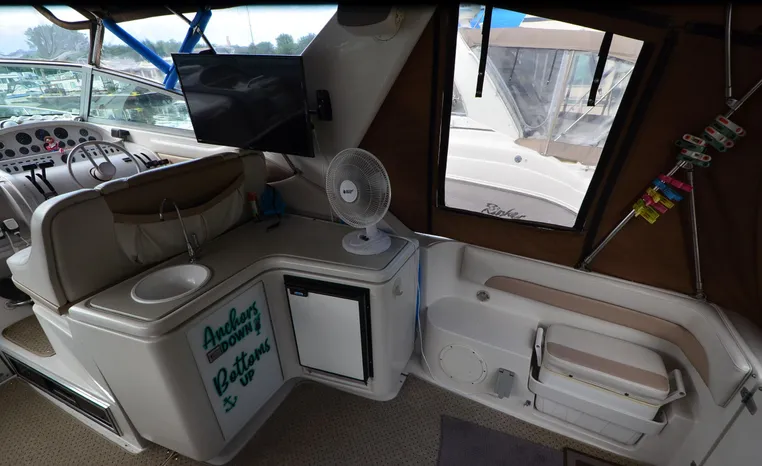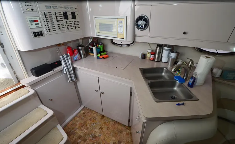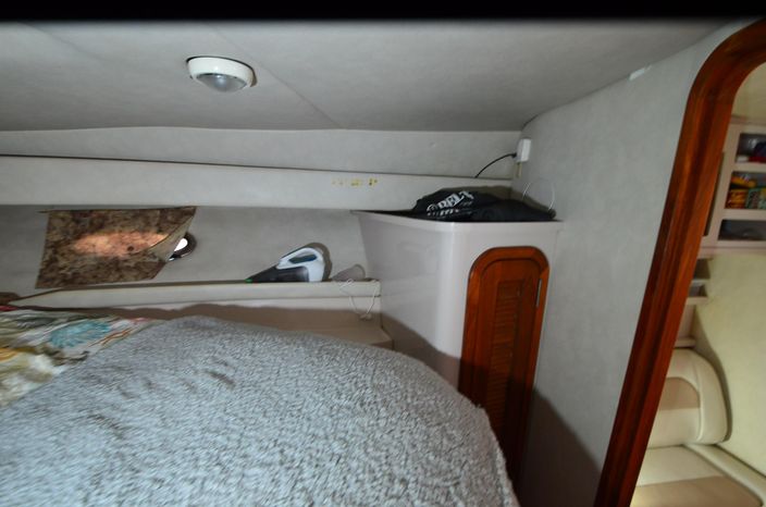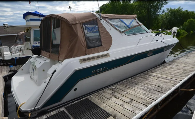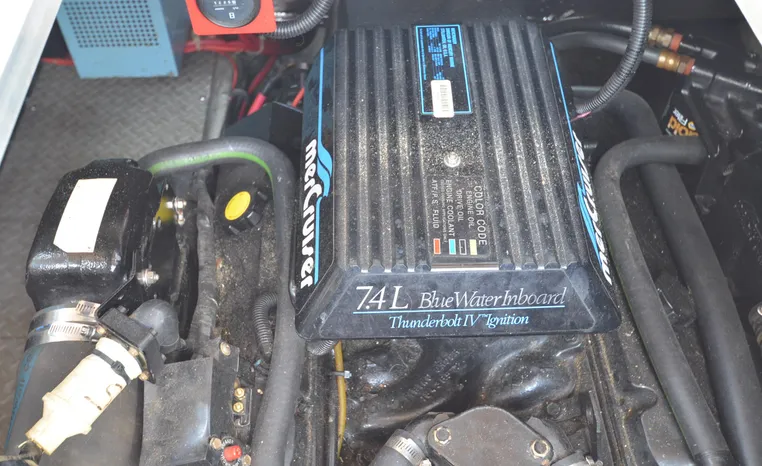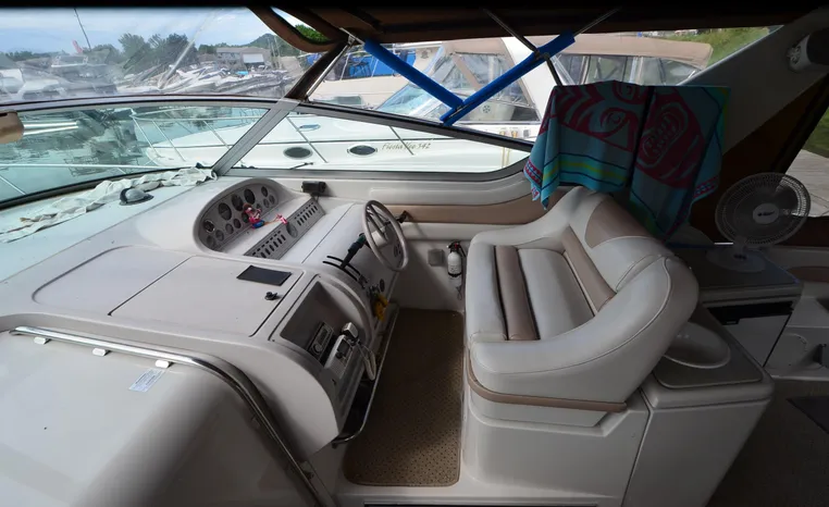 1994 Regal Commodore 400, T-340 HP Mercruiser, GM 454 CID, 7.4L, raw water cooling, 1338 hours, V-drive, Quicksilver 7.5 kw generator, 1962 hours, dual 30amp/125vac electrical service, two shore power cords, five batteries, 50A Professional Mariner battery charger, Marine Air reverse cycle air/heat units, water heater, two Fireboy Zintex carbon monoxide detectors, SeaFyre auto extinguishing system, sleeps six, master stateroom forward with island queen berth, guest stateroom mid-cabin with double berth, off white upholstery, beige carpet, RCA flat screen TV with DVD player, U-shaped convertible dinette sleeps two, double stainless steel sink, Nova Cool 12vdc/115vac refrigerator, two burner Ceran electric stove with cover, Golden microwave oven, electric head new, vanity and stall shower, tan canvas new 2017, bimini and camper top with enclosure and camper screens, Danforth anchor, remote controlled search light, accordion style beaching ladder, four fenders with racks, bow sun cushions new 2018, electronics arch, helm, Boss bluetooth stereo radio, West Marine VHF marine radio, Impulse depth finder, engine synchronizing gauge, double wide helm seat, companion seat, large U-shaped aft bench seat, wet bar w/U-line ice maker (not working), cockpit carpet, transom shower, transom door, pressure dockside water, integral swim platform with boarding ladder, Bennett trim tabs, black bottom paint new 2020.