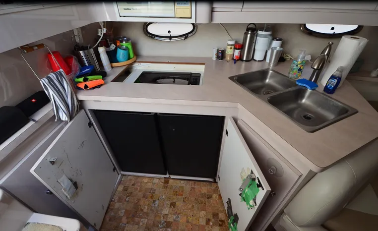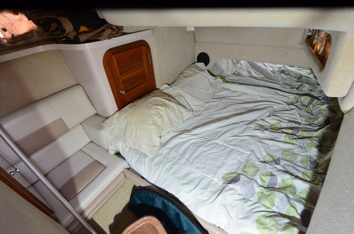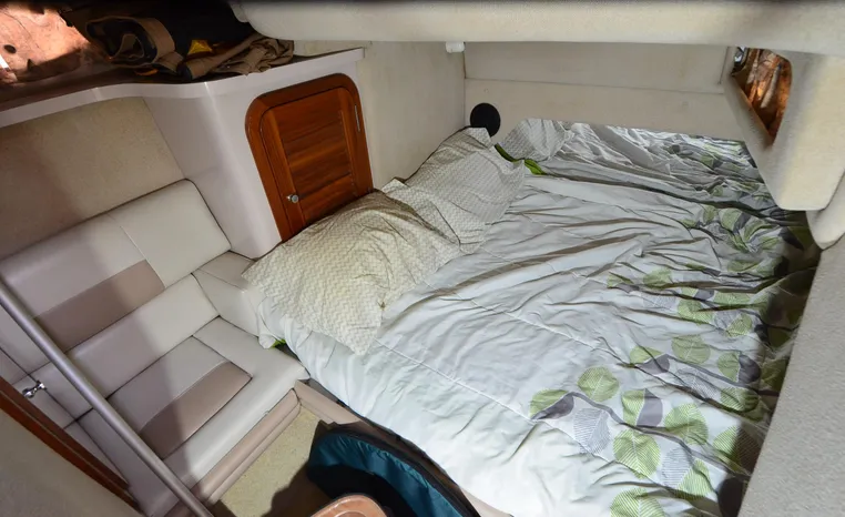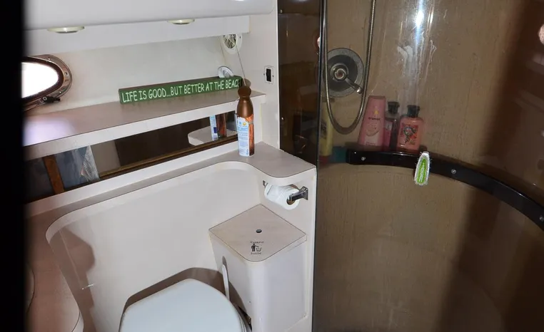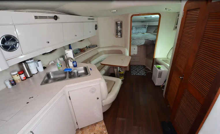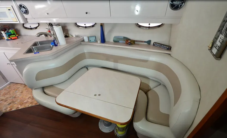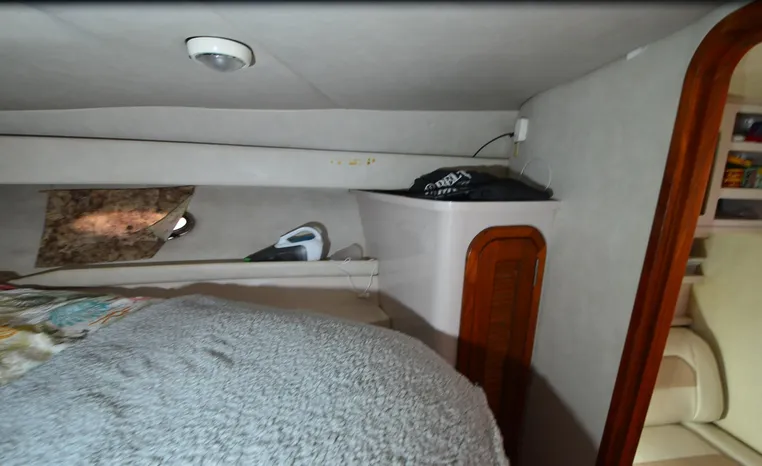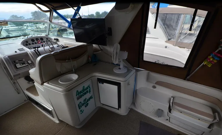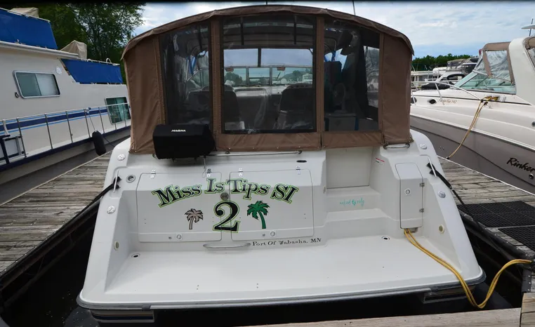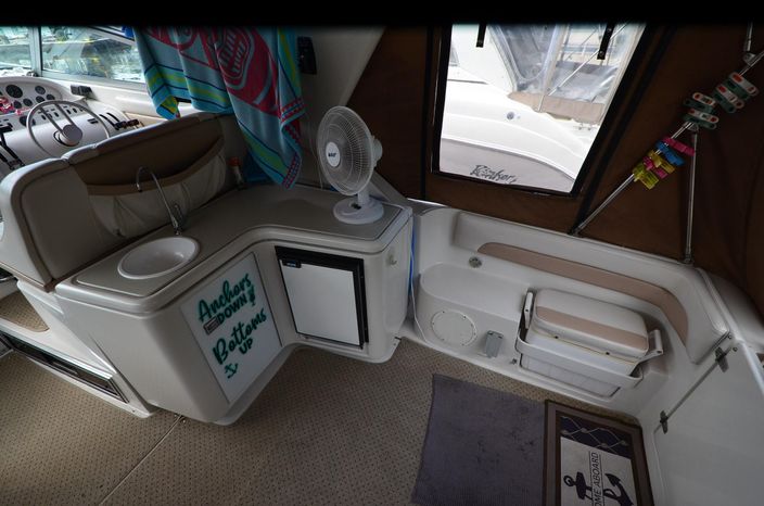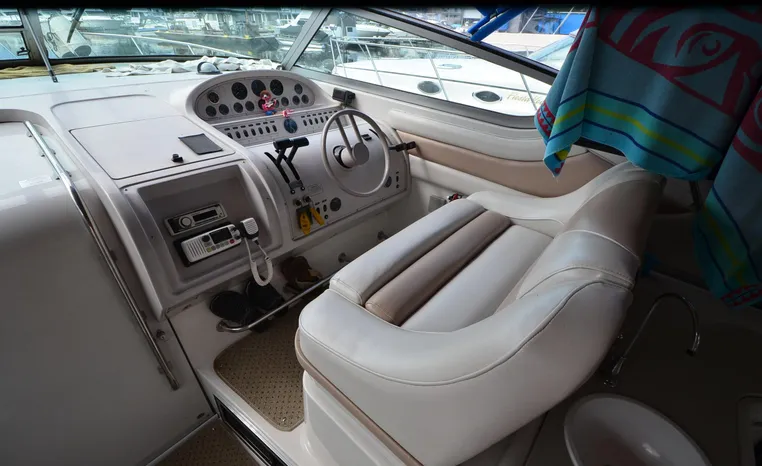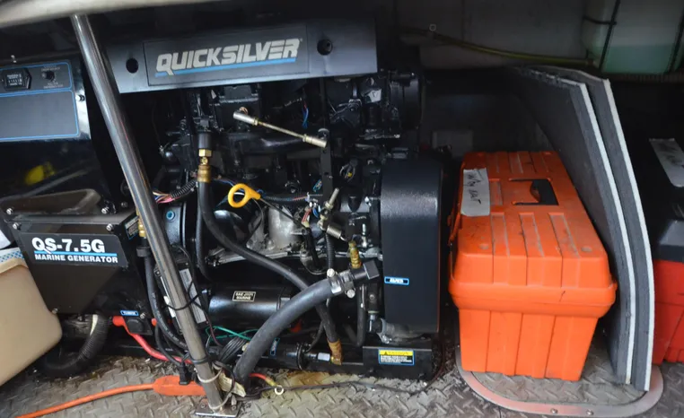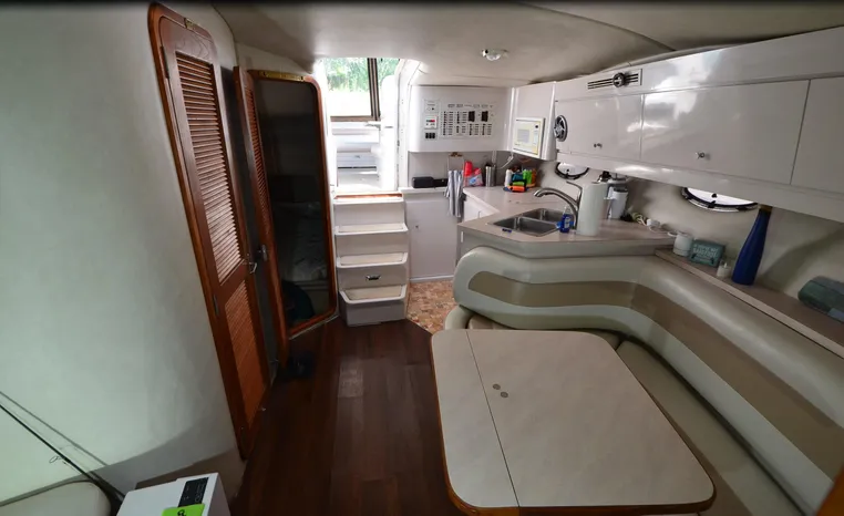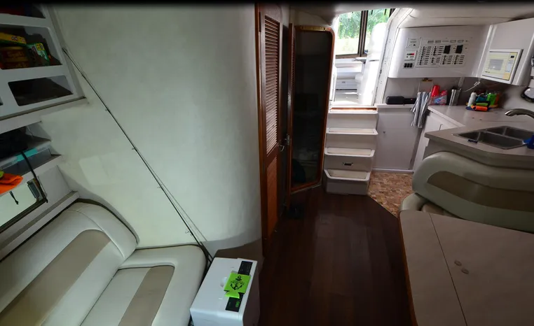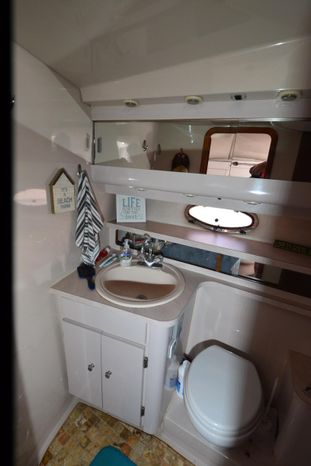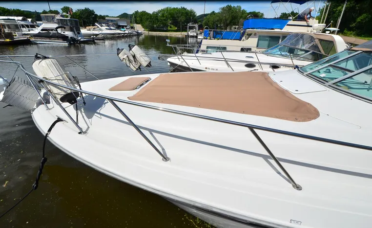 1994 Regal Commodore 400, T-340 HP Mercruiser, GM 454 CID, 7.4L, raw water cooling, 1338 hours, V-drive, Quicksilver 7.5 kw generator, 1962 hours, dual 30amp/125vac electrical service, two shore power cords, five batteries, 50A Professional Mariner battery charger, Marine Air reverse cycle air/heat units, water heater, two Fireboy Zintex carbon monoxide detectors, SeaFyre auto extinguishing system, sleeps six, master stateroom forward with island queen berth, guest stateroom mid-cabin with double berth, off white upholstery, beige carpet, RCA flat screen TV with DVD player, U-shaped convertible dinette sleeps two, double stainless steel sink, Nova Cool 12vdc/115vac refrigerator, two burner Ceran electric stove with cover, Golden microwave oven, electric head new, vanity and stall shower, tan canvas new 2017, bimini and camper top with enclosure and camper screens, Danforth anchor, remote controlled search light, accordion style beaching ladder, four fenders with racks, bow sun cushions new 2018, electronics arch, helm, Boss bluetooth stereo radio, West Marine VHF marine radio, Impulse depth finder, engine synchronizing gauge, double wide helm seat, companion seat, large U-shaped aft bench seat, wet bar w/U-line ice maker (not working), cockpit carpet, transom shower, transom door, pressure dockside water, integral swim platform with boarding ladder, Bennett trim tabs, black bottom paint new 2020.