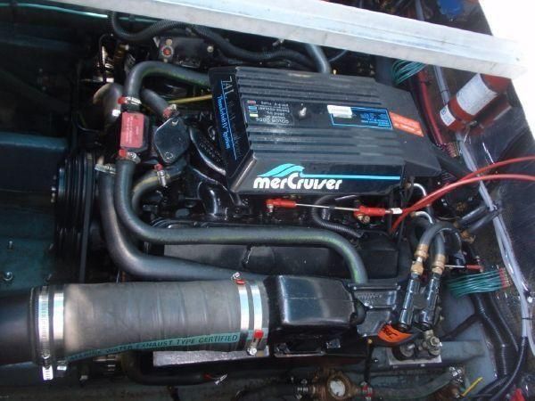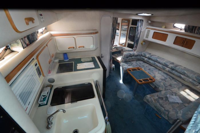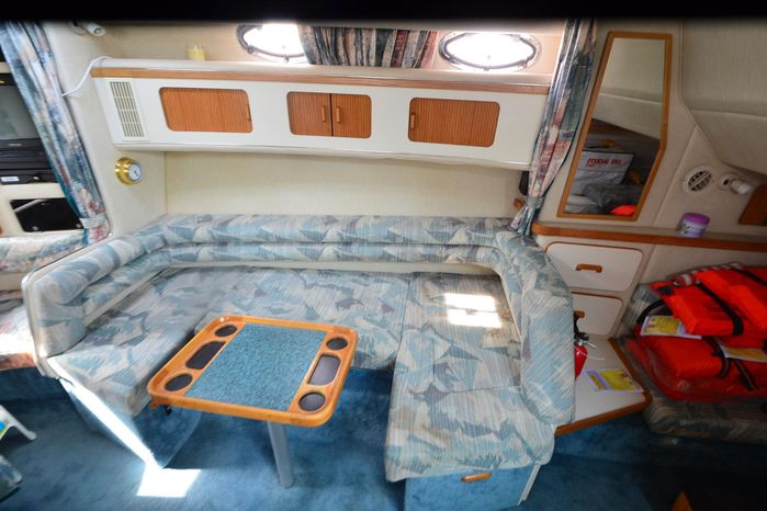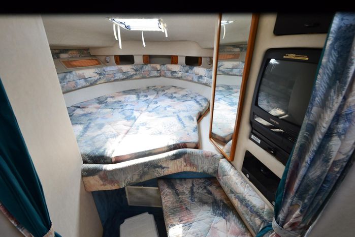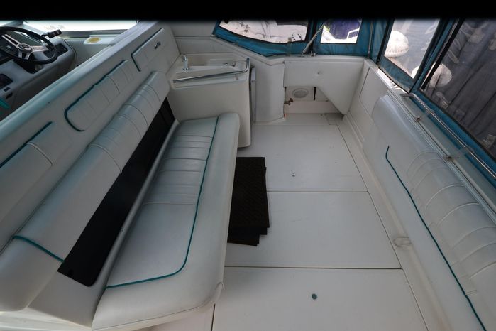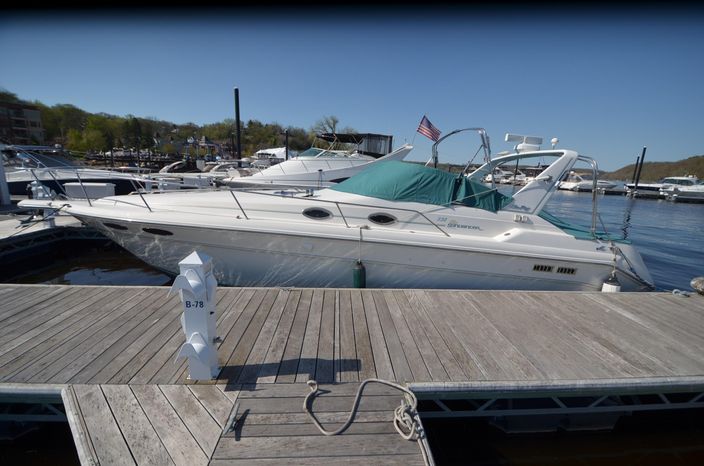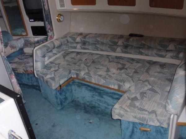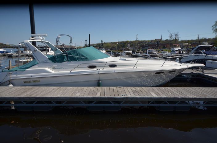 1994 Sea Ray 330 Sundancer, Twin 310 hp Mercruiser, GM 454 CID, 7.4 litre, raw water cooling, V-drive, 950 approx hours, dual 30 amp service, two shore power cords, three batteries, battery charger, battery parallel switch, Marine Air reverse cycle air/heat, ITT Jabsco manual head/shower/vanity, master stateroom forward with offset Queen, guest stateroom mid-cabin double berth, convertible dinette sleeps two, blue carpet, off white vinyl wall covering, Pastel upholstery, Clarion AM/FM stereo/CD, single molded sink, Norcold 12 vdc/120 vac refrigerator/freezer, Kenyon two burner electric stove, microwave oven, VHF marine radio, depth finder, ITT Jabsco head, Danforth anchor, four fenders, six lines, three windshield wipers, bimini top with enclosure, aft enclosure with screens, mooring cover, electronics arch, Bennett trim tabs, integral swim platform with boarding ladder, transom door.