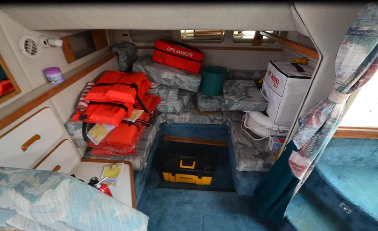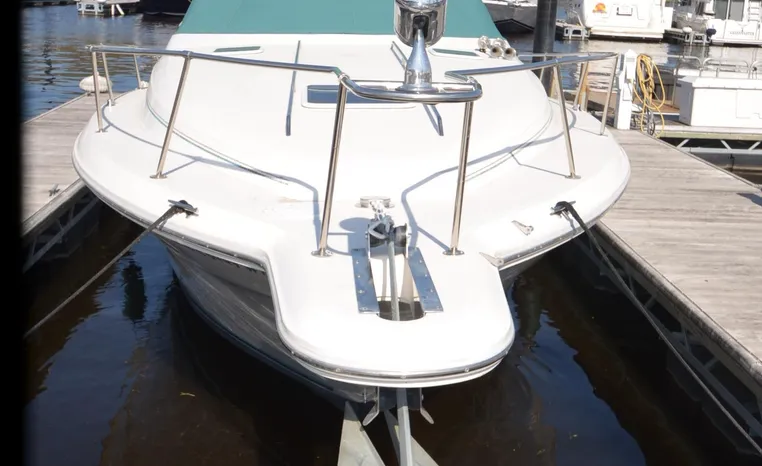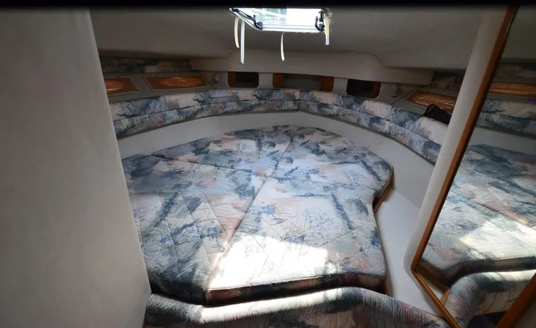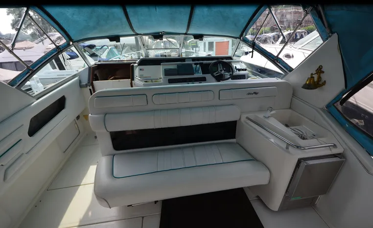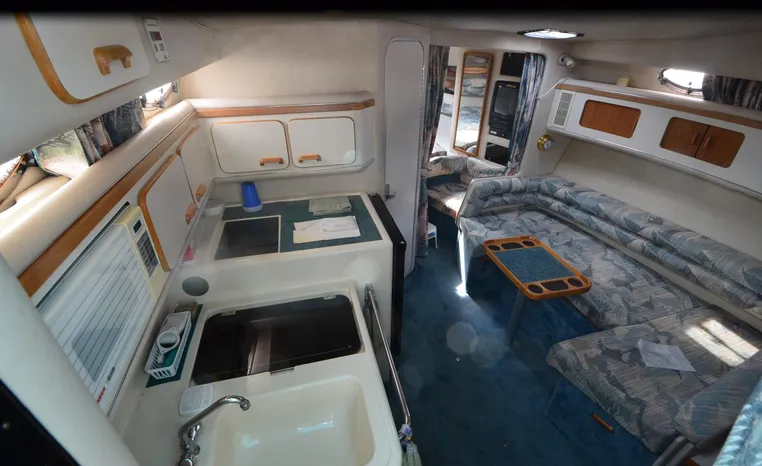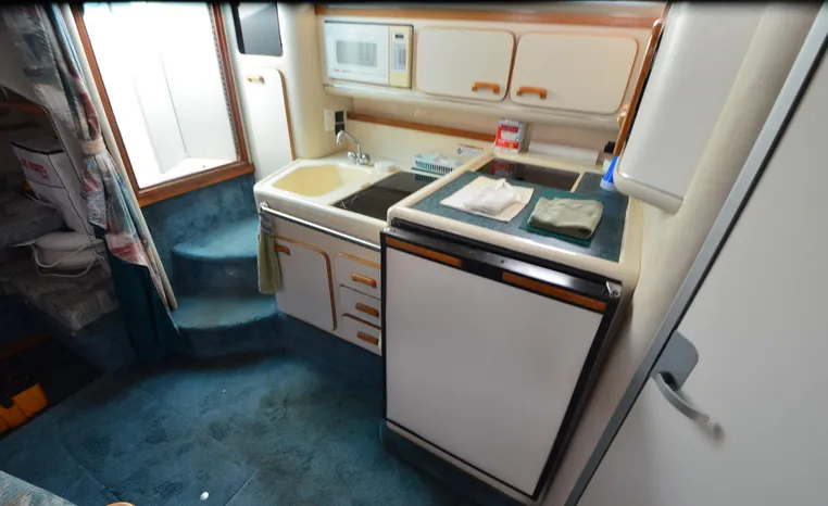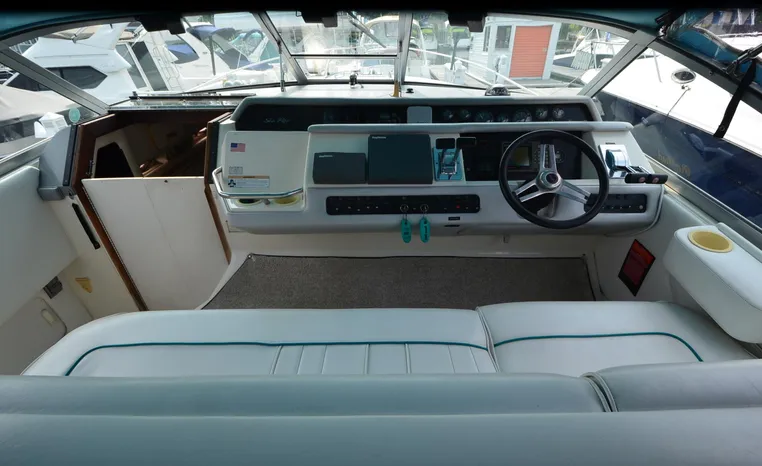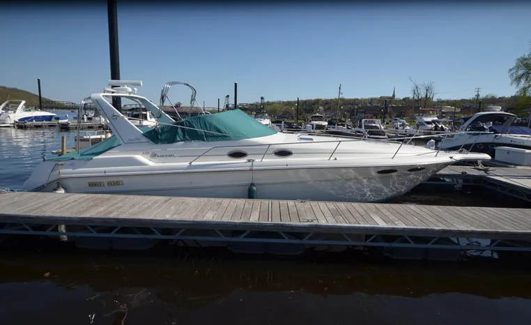 1994 Sea Ray 330 Sundancer, Twin 310 hp Mercruiser, GM 454 CID, 7.4 litre, raw water cooling, V-drive, 950 approx hours, dual 30 amp service, two shore power cords, three batteries, battery charger, battery parallel switch, Marine Air reverse cycle air/heat, ITT Jabsco manual head/shower/vanity, master stateroom forward with offset Queen, guest stateroom mid-cabin double berth, convertible dinette sleeps two, blue carpet, off white vinyl wall covering, Pastel upholstery, Clarion AM/FM stereo/CD, single molded sink, Norcold 12 vdc/120 vac refrigerator/freezer, Kenyon two burner electric stove, microwave oven, VHF marine radio, depth finder, ITT Jabsco head, Danforth anchor, four fenders, six lines, three windshield wipers, bimini top with enclosure, aft enclosure with screens, mooring cover, electronics arch, Bennett trim tabs, integral swim platform with boarding ladder, transom door.