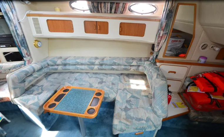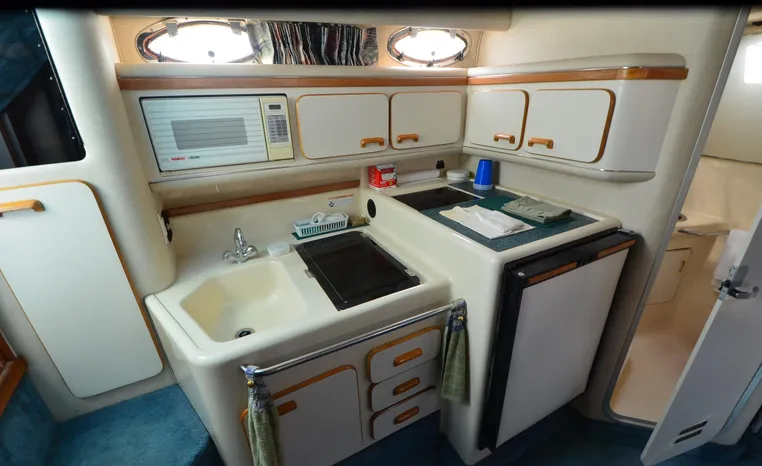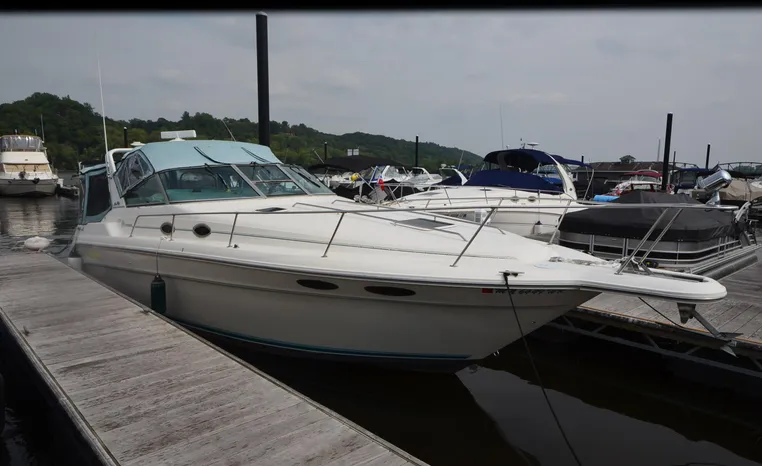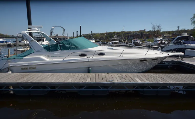 1994 Sea Ray 330 Sundancer, Twin 310 hp Mercruiser, GM 454 CID, 7.4 litre, raw water cooling, V-drive, 950 approx hours, dual 30 amp service, two shore power cords, three batteries, battery charger, battery parallel switch, Marine Air reverse cycle air/heat, ITT Jabsco manual head/shower/vanity, master stateroom forward with offset Queen, guest stateroom mid-cabin double berth, convertible dinette sleeps two, blue carpet, off white vinyl wall covering, Pastel upholstery, Clarion AM/FM stereo/CD, single molded sink, Norcold 12 vdc/120 vac refrigerator/freezer, Kenyon two burner electric stove, microwave oven, VHF marine radio, depth finder, ITT Jabsco head, Danforth anchor, four fenders, six lines, three windshield wipers, bimini top with enclosure, aft enclosure with screens, mooring cover, electronics arch, Bennett trim tabs, integral swim platform with boarding ladder, transom door.