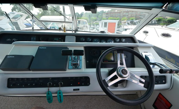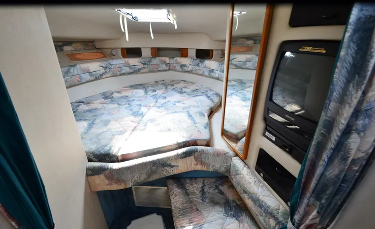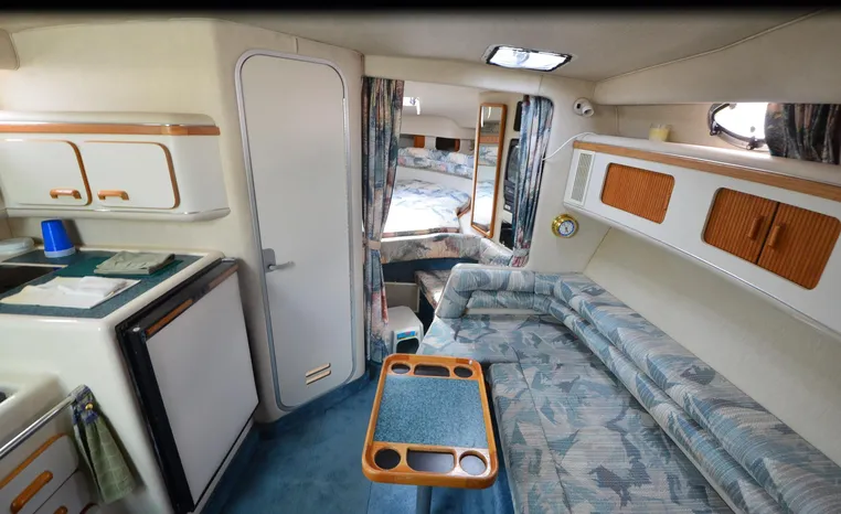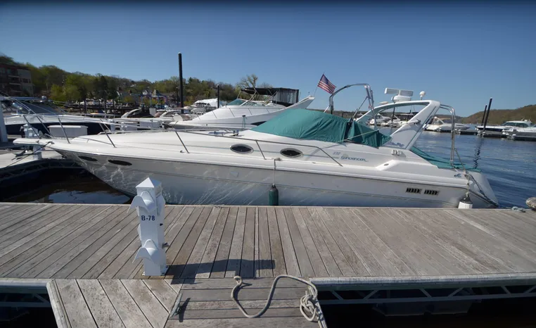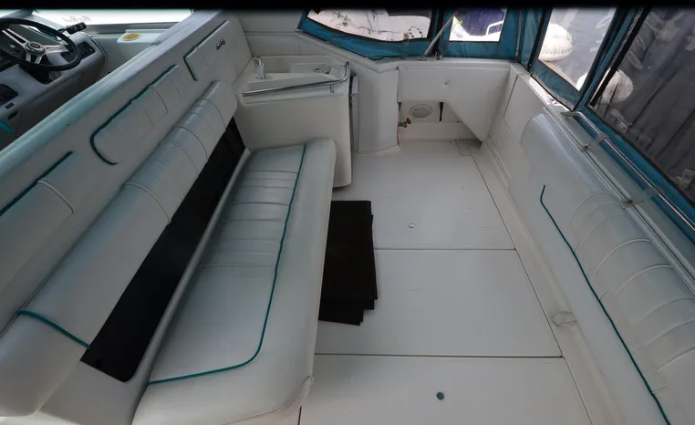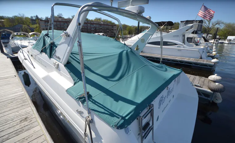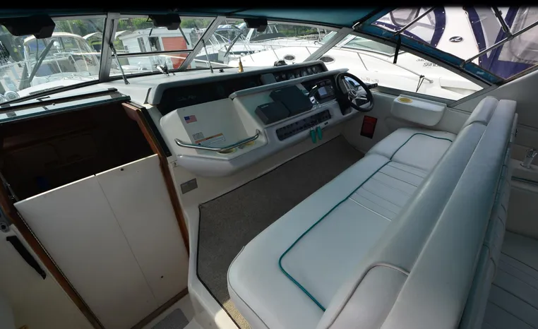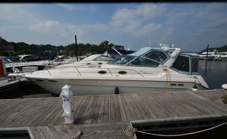 1994 Sea Ray 330 Sundancer, Twin 310 hp Mercruiser, GM 454 CID, 7.4 litre, raw water cooling, V-drive, 950 approx hours, dual 30 amp service, two shore power cords, three batteries, battery charger, battery parallel switch, Marine Air reverse cycle air/heat, ITT Jabsco manual head/shower/vanity, master stateroom forward with offset Queen, guest stateroom mid-cabin double berth, convertible dinette sleeps two, blue carpet, off white vinyl wall covering, Pastel upholstery, Clarion AM/FM stereo/CD, single molded sink, Norcold 12 vdc/120 vac refrigerator/freezer, Kenyon two burner electric stove, microwave oven, VHF marine radio, depth finder, ITT Jabsco head, Danforth anchor, four fenders, six lines, three windshield wipers, bimini top with enclosure, aft enclosure with screens, mooring cover, electronics arch, Bennett trim tabs, integral swim platform with boarding ladder, transom door.