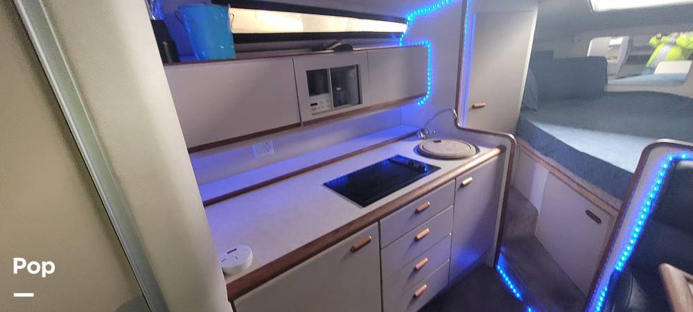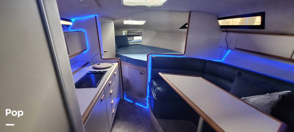 The cabin has Blue Access lighting and a dining table with seating for enjoying a meal out on the water or dockside. The Galley has a sink, stove top burner, and a built-in coffee maker. There is a rear aft cabin bed which can be used for seating or storage.