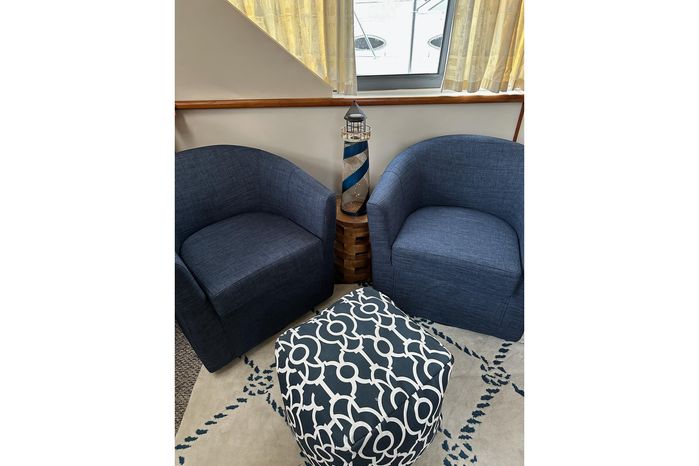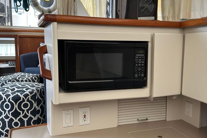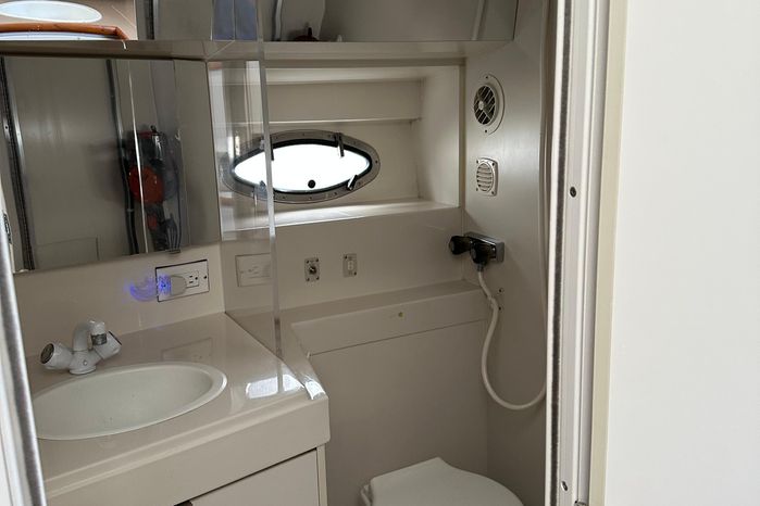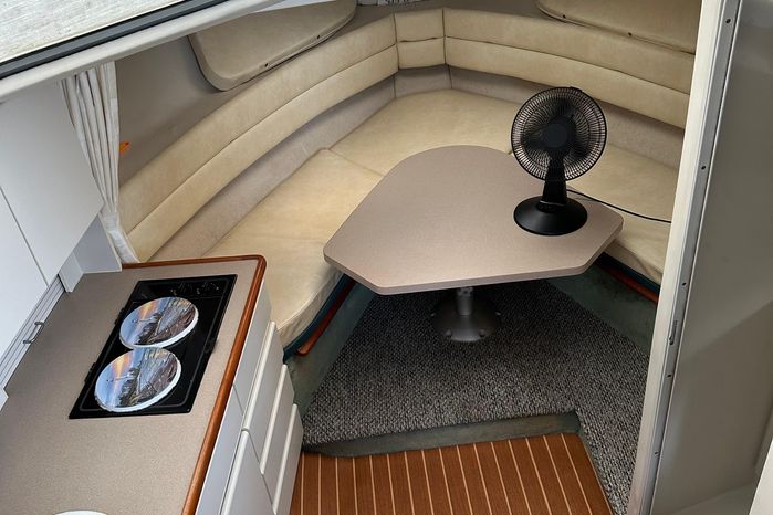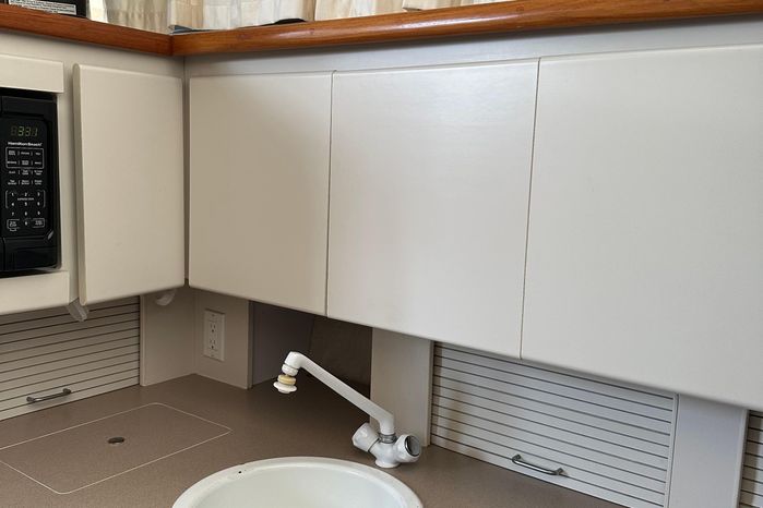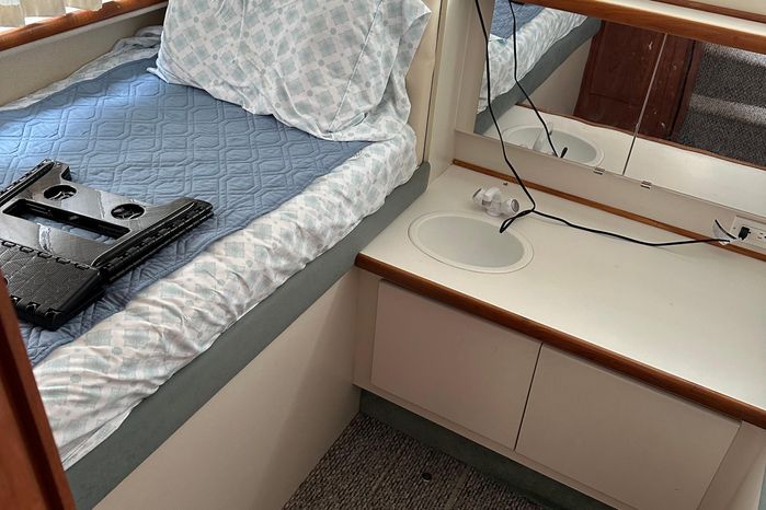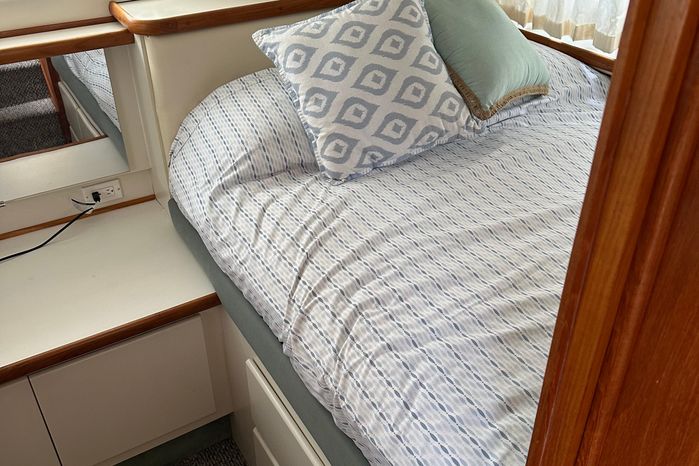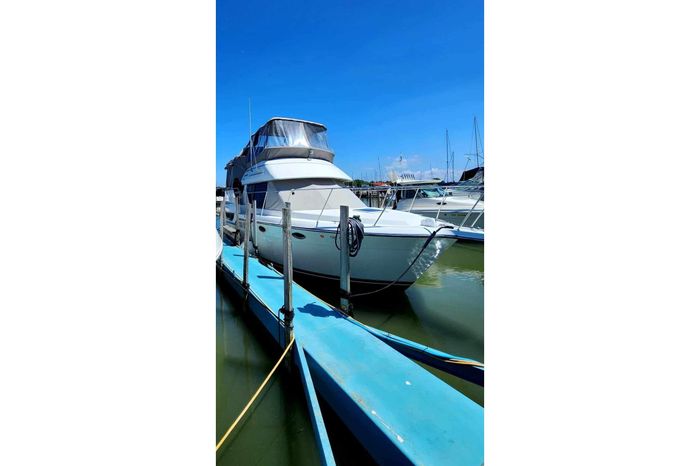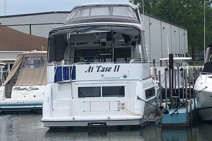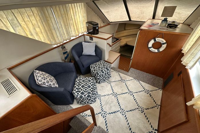 Popular aft-cabin cruiser with wide beam offered big-boat dreams in relatively small hull. Interior highlights include aft stateroom with double and single berths, comfortable salon, convertible dinette, full galley. Lower helm was optional. Large windows provide panoramic outside views. Modified-V hull delivers capable open-water ride.