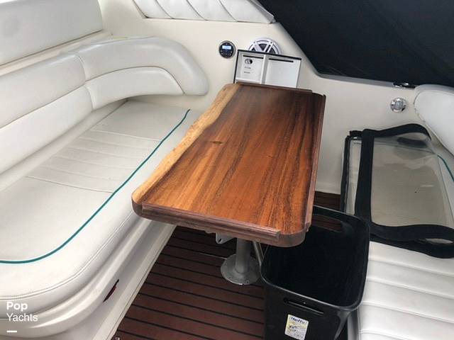 Entering the boat from the stern you'll board on the large swim platform with swim ladder and enter to port through the transom swing gate. Once aboard you'll see a settee for 6 to starboard offset by a wet bar up with plenty of storage.