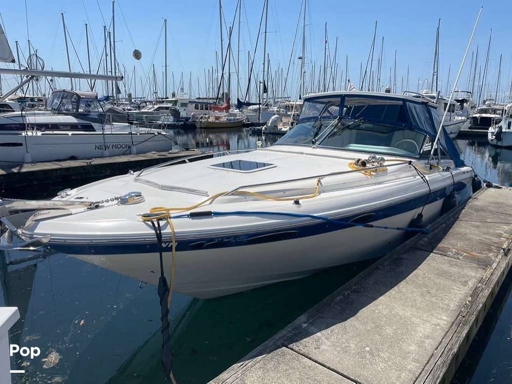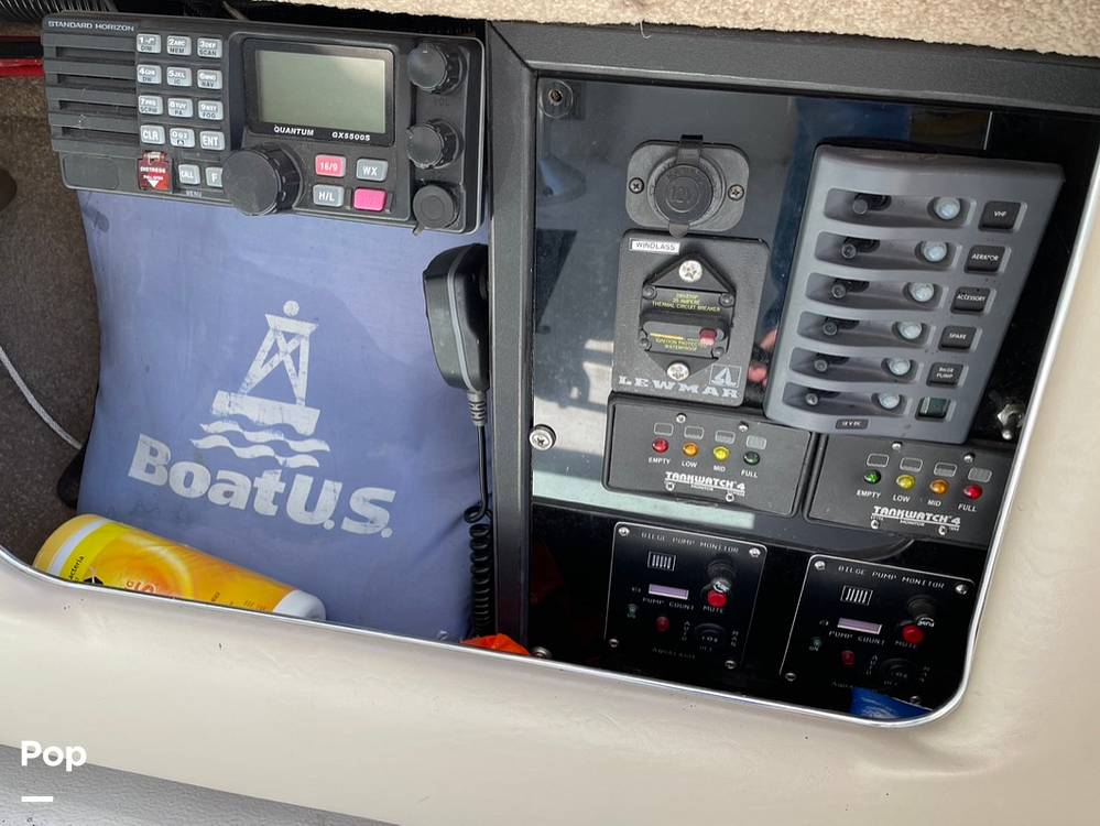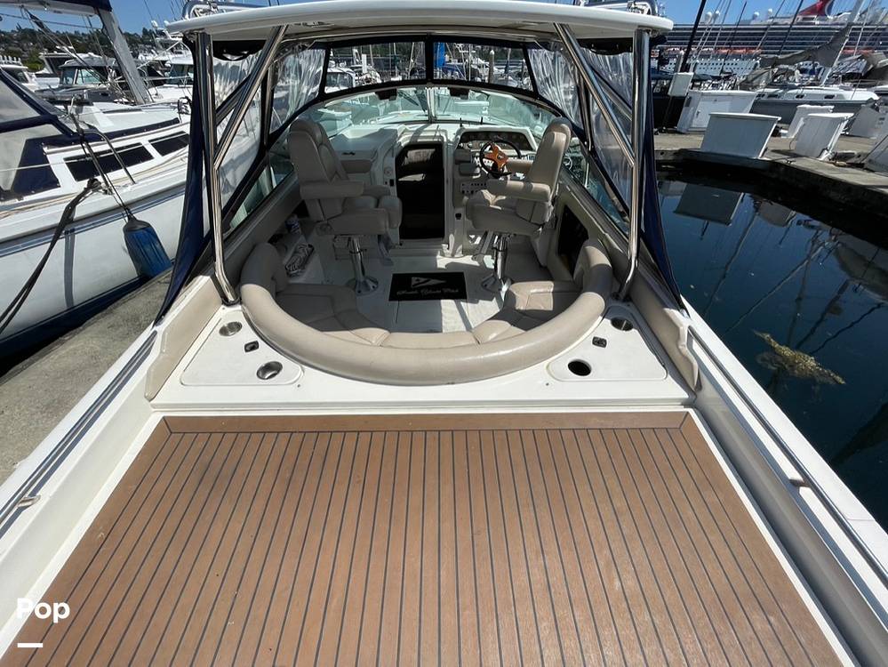 The wraparound seating provides plenty of room for guests, making this an ideal boat for entertaining. The helm is well-appointed with easy-to-read gauges and controls, offering a commanding view. A well-positioned wet bar ensures refreshments are always within reach.