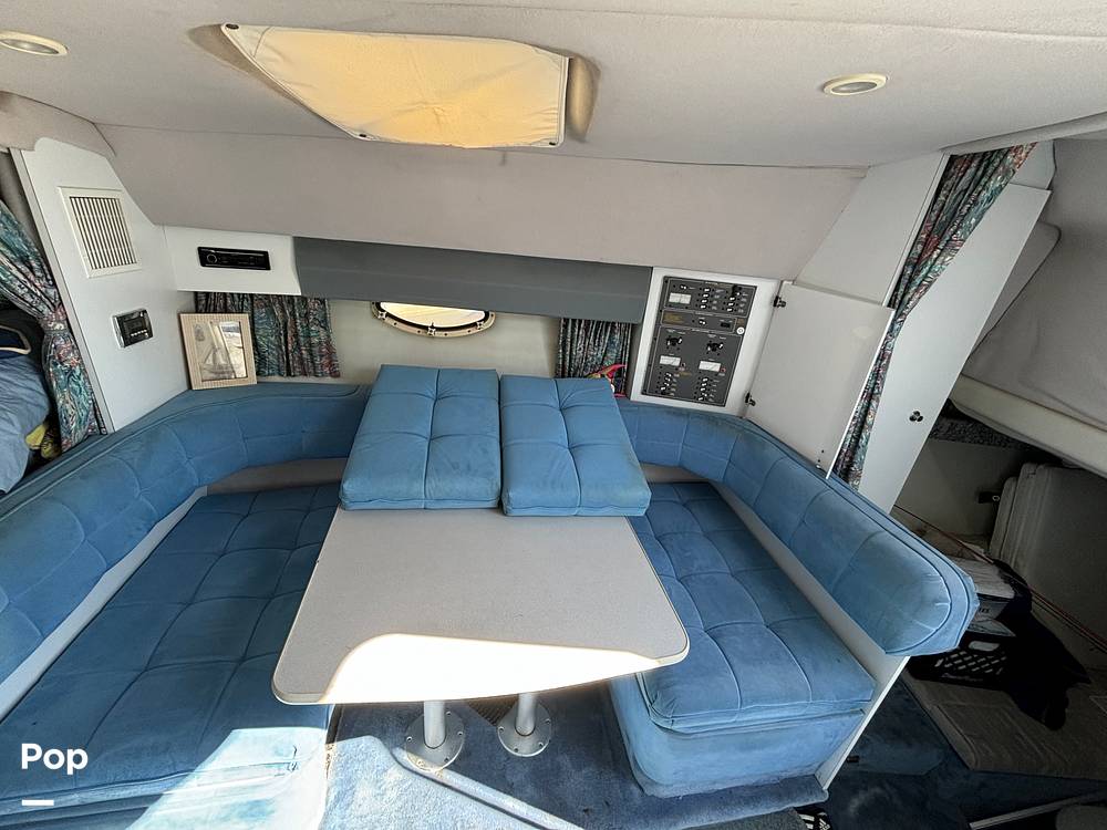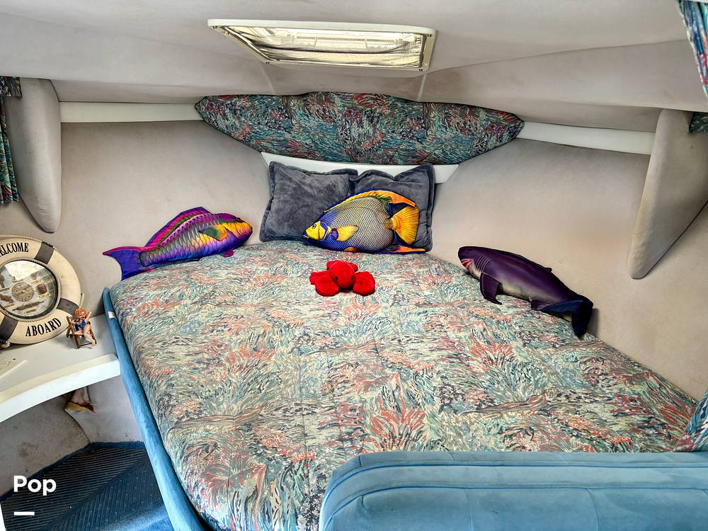Features include a spacious cockpit with U-shaped seating, wet bar, full camper canvas, and swim platform. The cabin sleeps six comfortably with a forward and aft berth and convertible dinette, full galley with fridge, microwave, and cooktop, plus enclosed head with shower.