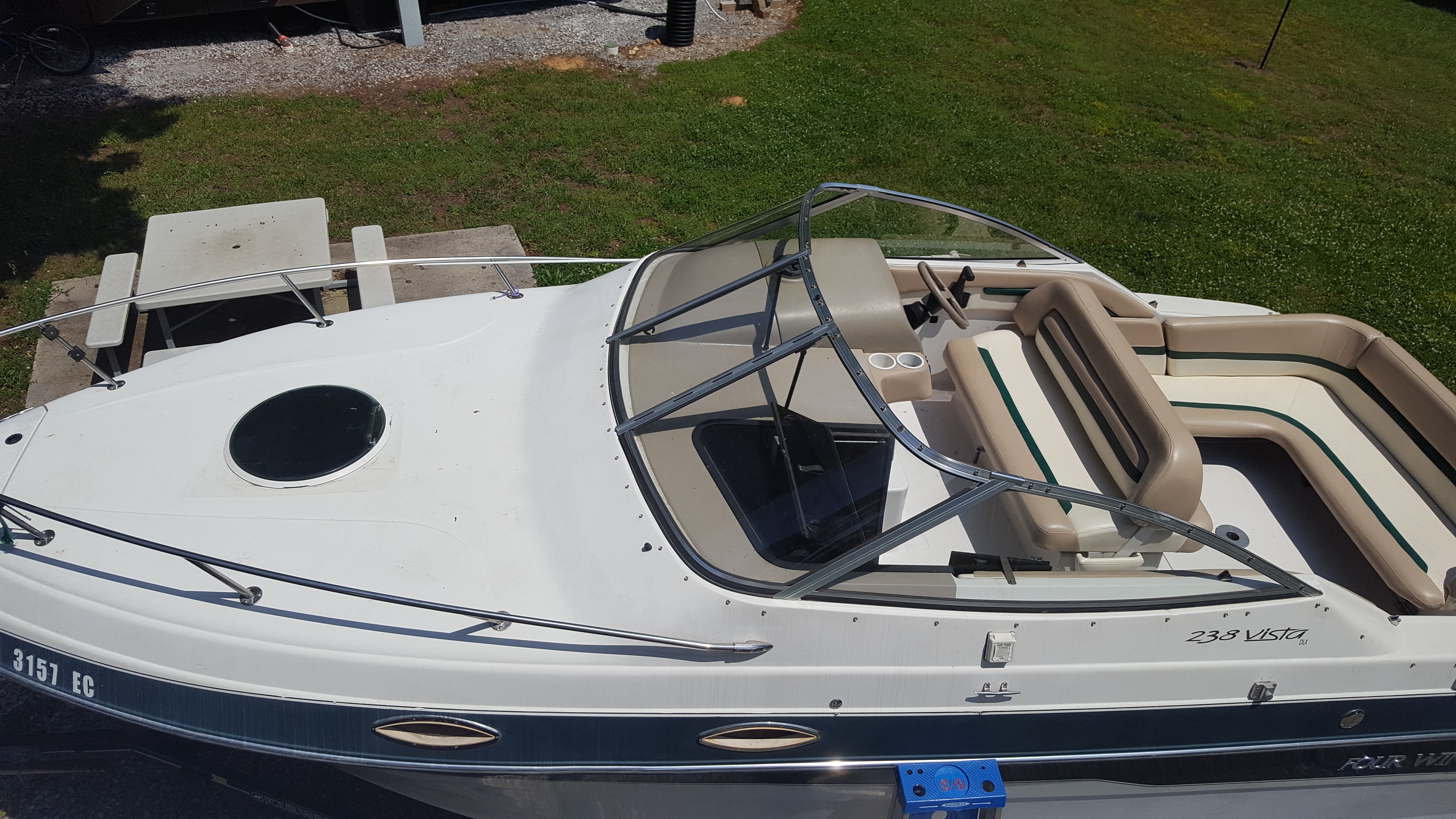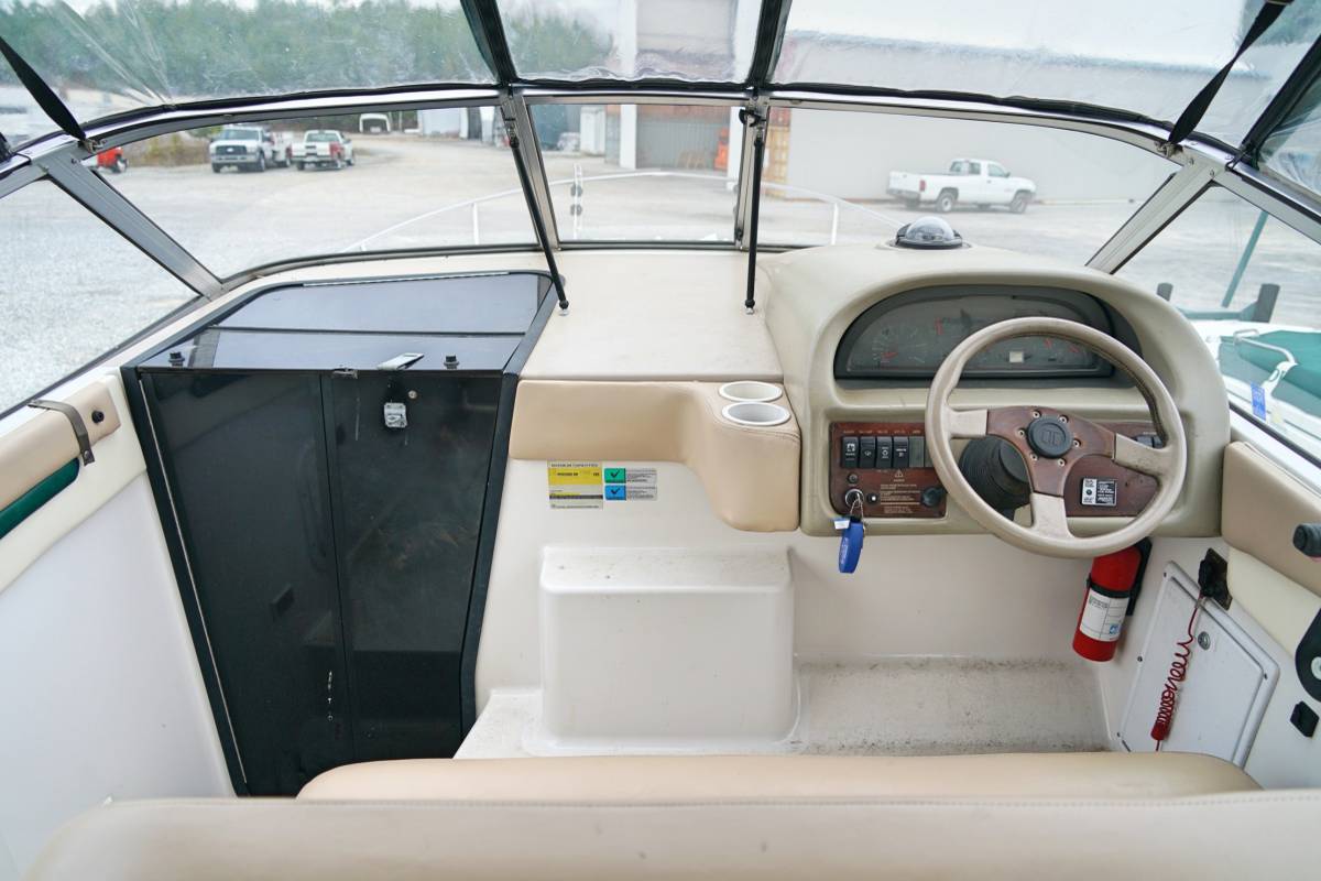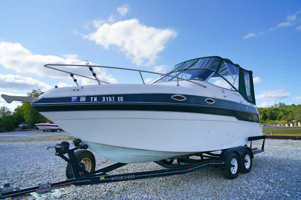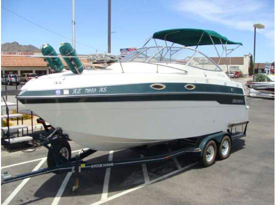 Volvo Penta stern drive with a 5.8 Liter Fuel injection (5.8FSi, 351cubic inches, wow) engine with reverse spin dual-stainless steel props which can generate 300hp to pull skiers and such. Included, Power Trim, Swim Deck with Ladder, Walk through Windshield to the Bow, Four Port Light Openings with Screens, Bow Rail, Trim Tabs, Bow Hatch, Depth Finder, VHF Radio/w Antenna , Wood Grain Dash Helm Panel, Shore Power System, Two Electrical AC outlets (one GFI) for charging cell phones or running an air pump to blowup inflatables. Navigation Compass, Sport Tilt Steering Wheel, Power Steering, Dual Battery System with 4 way switch, Battery Charger, Air Conditioning/Heat pump, Stove, Galley Sink/Faucet, Microwave, Coffee Maker, TV/VCR, Stereo w/four speakers, Refrigerator, Four Internal Fans to keep you cool, extra storage under the seats, Inside/Outside Showers, Head (toilet), Hot Water Heater, Fresh and Black Water Tanks, Fresh Water shore system, Black Tank Maceration Discharge System, Anchor Bow Storage/Pulpit, Two Fire Extinguishers, Sleeps Six. Comes with Boat Trailer and Spare Tire, Bimini Top, Bridge Enclosure and one helm/aft boat cover, one full length (26 feet) boat cover. * Fresh Water only * Length Over all is 26' (L.O.A) Near New Impeller Near New Gimbal Bearing. Near New Bilge Pump Near New Seats Near New Alternator Near New Tires on Trailer Near New Batteries (two)