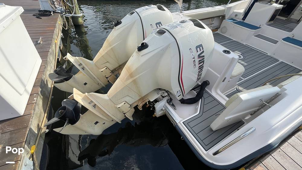 Power comes from twin Evinrude E-TEC 200 HP HO outboards with about 1,500 hours and power heads replaced in 2018 at 864 hours, offering strong and performance.