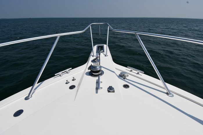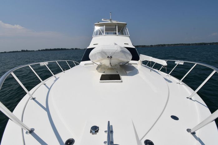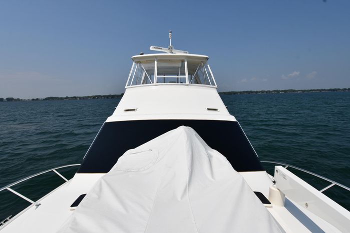 Replacing the popular 55 Super Sport in 1991, the 53 Super Sport was built on an all-new Ocean hull design with a sharper entry and slightly increased transom deadrise. The hull changes makethe Ocean 53 a generally better headsea boat than her predecessor with a notably drier ride. Several floorplans were offered over the years, and while three-stateroom layouts have been the most popular, a two-stateroom, galley-down version with a dinette delivers an extremely spacious salon. Although the deckhouse dimensions are slightly smaller than the 55 Super Sport model she replaced, there’s plenty of room for entertaining, and the luxurious furnishings and teak woodwork create a very inviting atmosphere. A transom door was standard in the cockpit, and the fish box was repositioned behind the chair for improved access to the rudder posts. Competitively priced, additional features include a factory hardtop, a well-arranged engine-room, and cockpit controls.