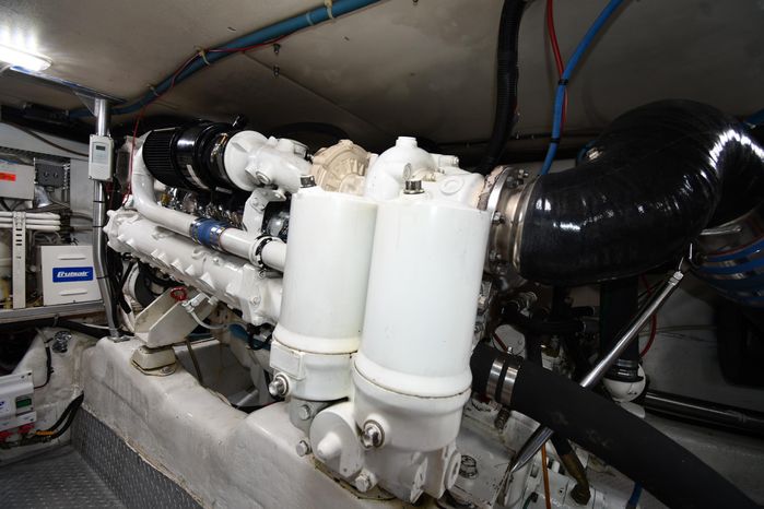 Features Twin MAN D2840 LE401 820-hp Diesel Engine's with 1990 original hours (Note Aft Deck Controls to Starboard - 2000 hour maintenance records on file Feb '25). Notable features include but are not limited to the following: Air-Conditioning & Heat (4-Units - Includes Bridge AC/Heat), (2) Head's (NEW Raritan Electric-Flush) w/Vanity/Sink/Stall-Shower's, Central Vacuum System, Washer / Dryer, Onan 12.5-kw Generator w/2180-hours, Windlass Anchor, Complete Electronics Package (Icom VHF Marine Radio's, Garmin 8622 Color / TouchScreen Display w/Radar/GPS/Chartplotter/Sounder - JL-Audio / Fusion Control - Secondary Garmin 10" MFD Overhear, Robertson AP 300X Autopilot, Starlink Internet, AIS Receiver / Transponder), Custom Aft Deck Awning (Tubular Aluminum w/Stamoid-Top), Bow-Davit w/Avon 11' Tender Tender & Mercury 20-hp Motor, and MUCH more!