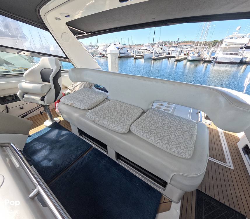 At 50 feet, it offers a lavish cockpit with abundant seating/day bed, a wet bar, and easy access to the swim platform for water activities. Below deck, you'll find a beautifully appointed salon with an open layout, two staterooms with private heads, a full galley, and plenty of storage for longer trips. The expansive salon is an inviting, grand area with plush Ultraleather sofas, nearly 7 feet of headroom, and a built-in TV setup.