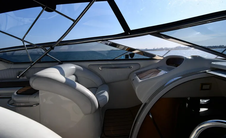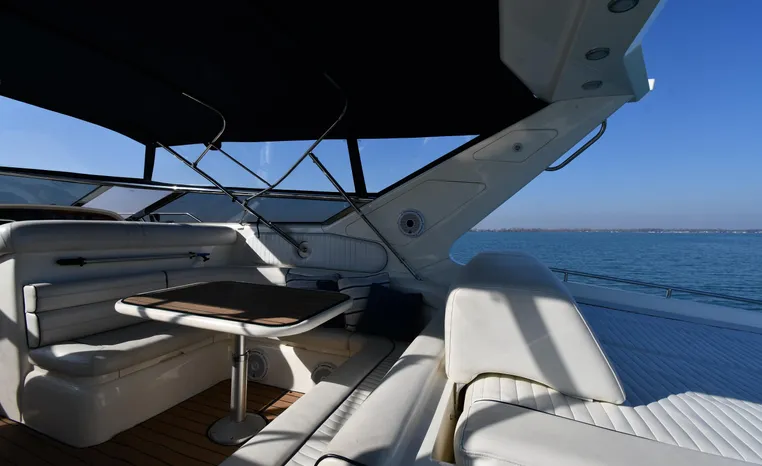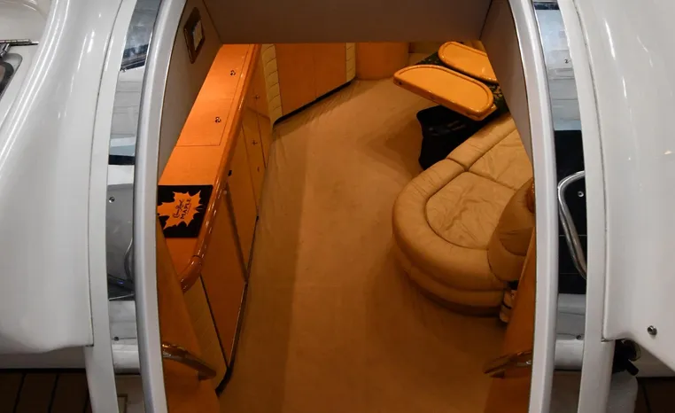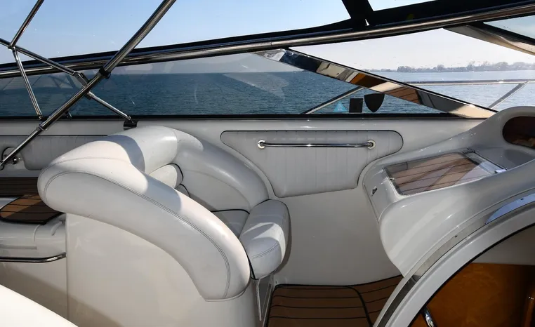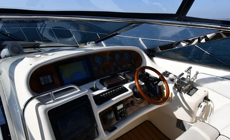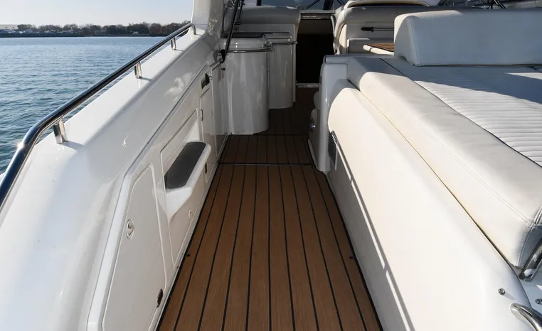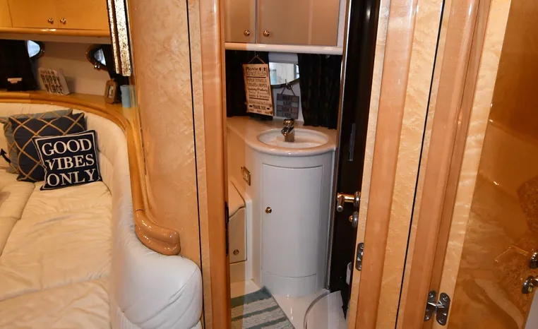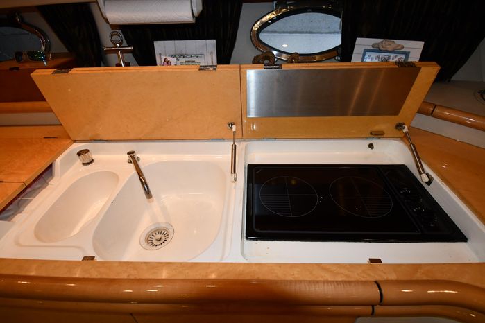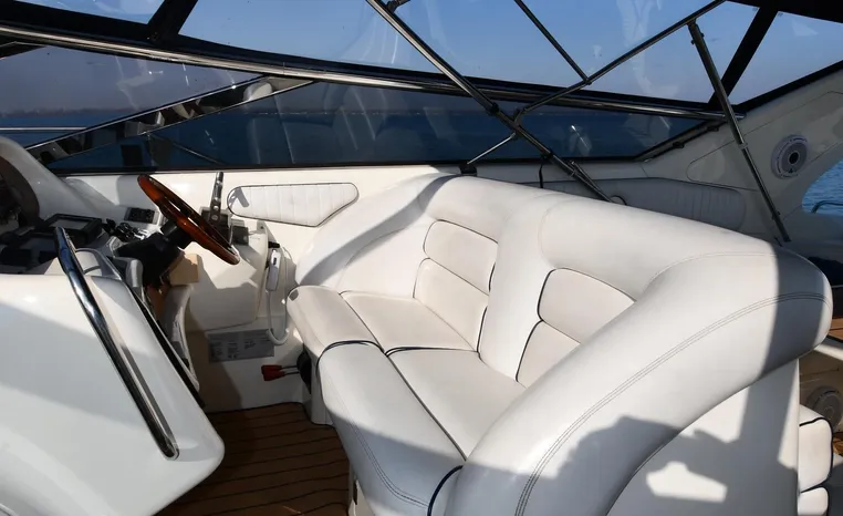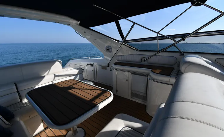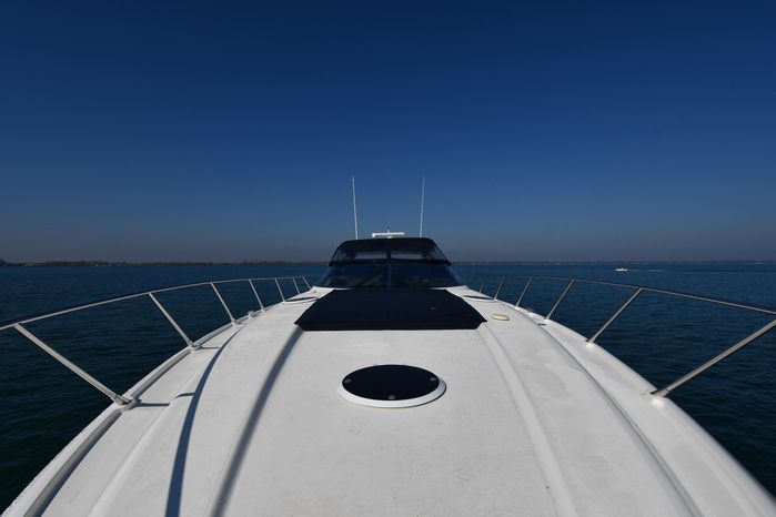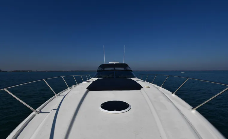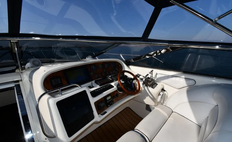 A popular model, the Camargue 55 helped define the Sunseeker reputation in this country for aggressive styling, luxurious accommodations, and exciting open-water performance. The Camargue was an impressive yacht when she came out in 1994 with deck and cabin accommodations that could only be described as opulent. The spacious cockpit, which consumes about half of the boat’s length, provides seating for three at the helm along with a mid-cockpit dinette and a huge aft sun lounge. Beneath the sun lounge is a garage for a tender or jet bike with an electric winch for launch and recovery. Below deck, the Camargue’s three- stateroom interior was updated in 1995 when a curved galley and dinette replaced the original U-shaped galley and dinette. In both configurations, the blend of high-gloss cherry woodwork, expensive galley appliances, and plush furnishings can only be described as lush. Additional features include a teak cockpit sole, bow storage locker, radar arch, and a hot/cold transom shower. Among several diesel options, twin 760hp 8V92 Detroits cruise the 55 Camargue in the high 20s and reach 30+ knots top.