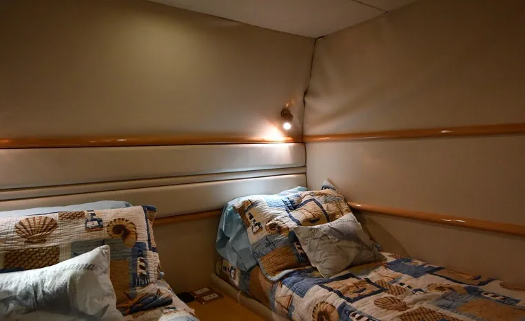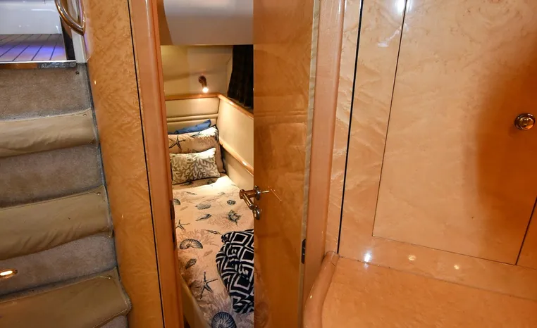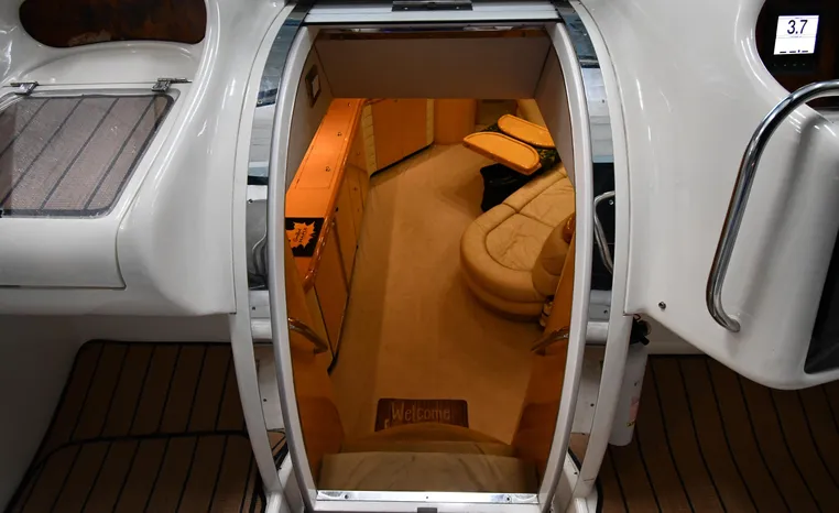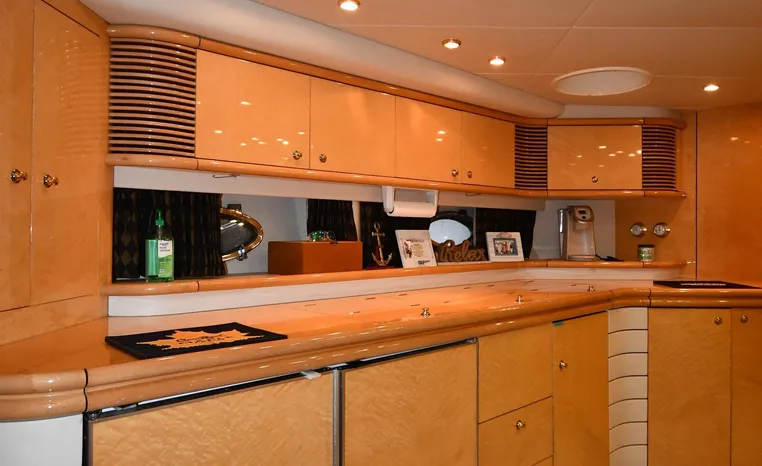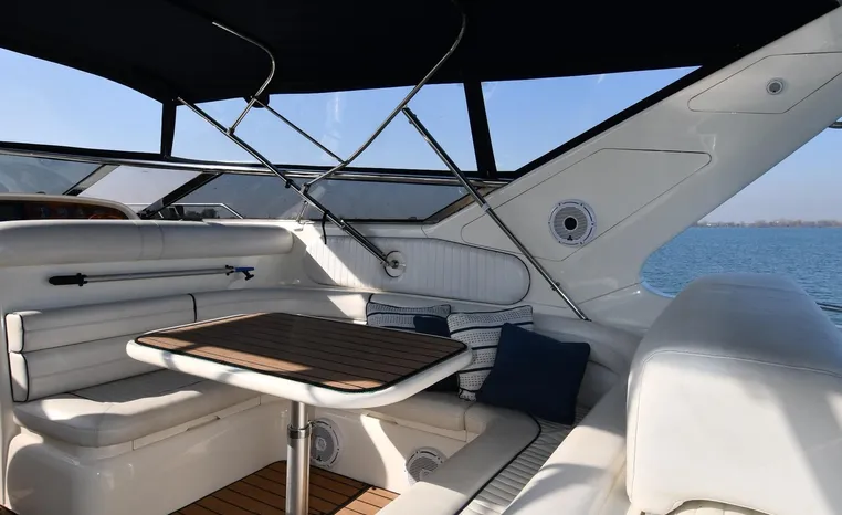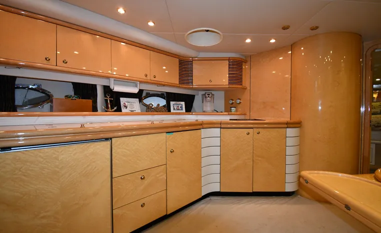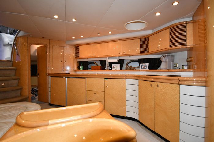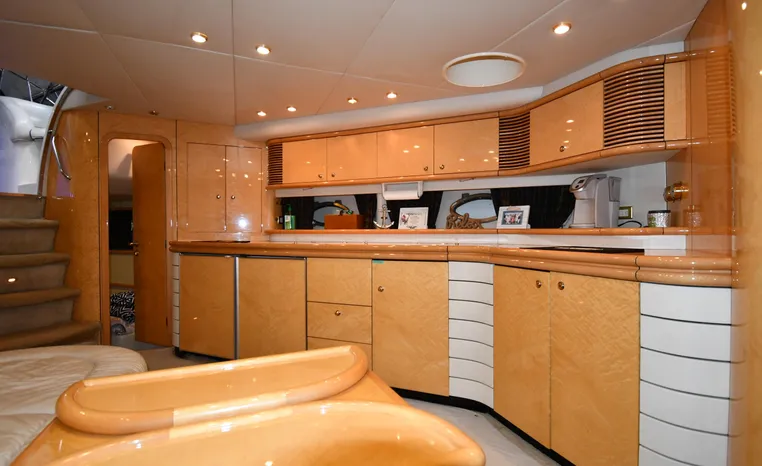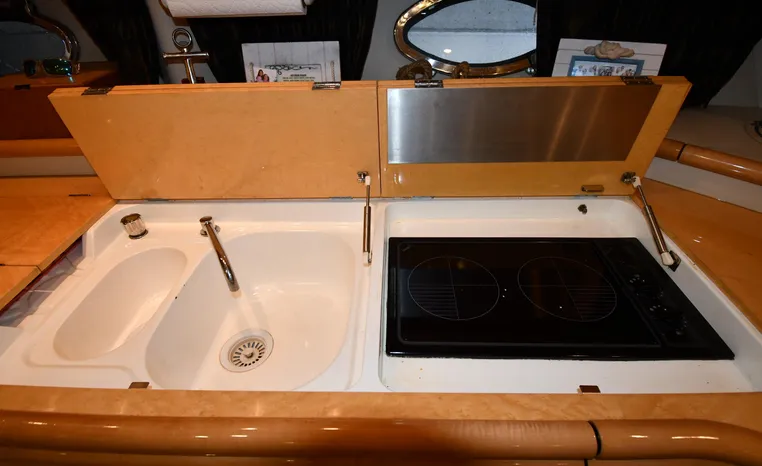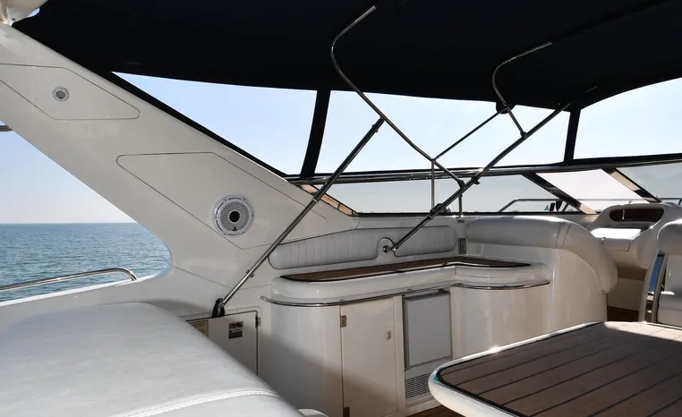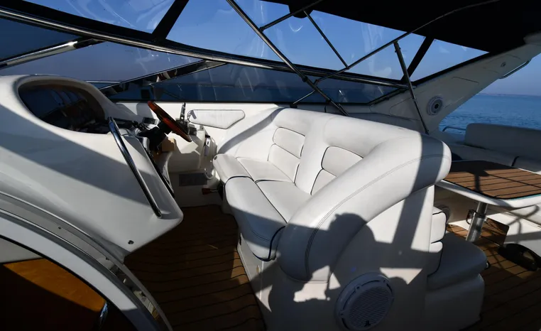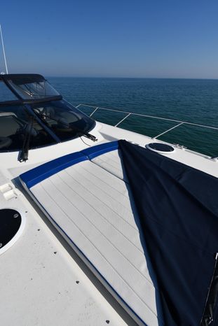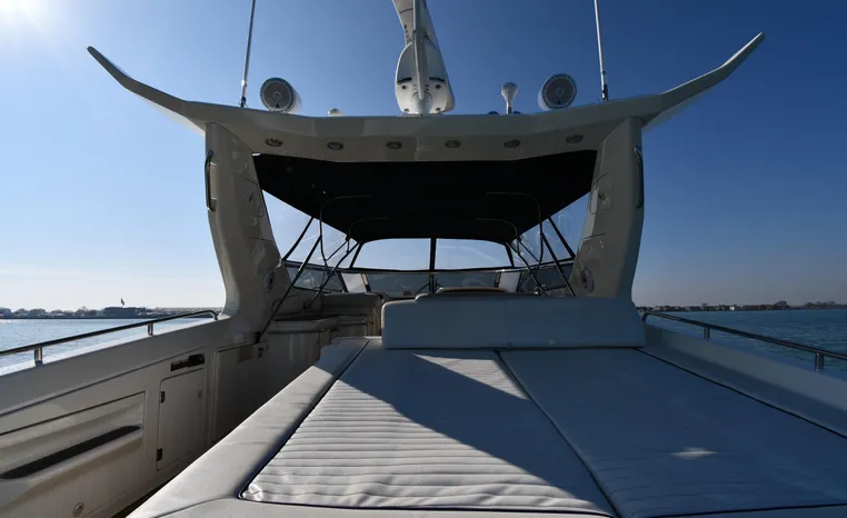 A popular model, the Camargue 55 helped define the Sunseeker reputation in this country for aggressive styling, luxurious accommodations, and exciting open-water performance. The Camargue was an impressive yacht when she came out in 1994 with deck and cabin accommodations that could only be described as opulent. The spacious cockpit, which consumes about half of the boat’s length, provides seating for three at the helm along with a mid-cockpit dinette and a huge aft sun lounge. Beneath the sun lounge is a garage for a tender or jet bike with an electric winch for launch and recovery. Below deck, the Camargue’s three- stateroom interior was updated in 1995 when a curved galley and dinette replaced the original U-shaped galley and dinette. In both configurations, the blend of high-gloss cherry woodwork, expensive galley appliances, and plush furnishings can only be described as lush. Additional features include a teak cockpit sole, bow storage locker, radar arch, and a hot/cold transom shower. Among several diesel options, twin 760hp 8V92 Detroits cruise the 55 Camargue in the high 20s and reach 30+ knots top.