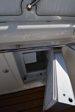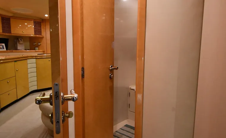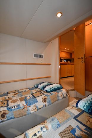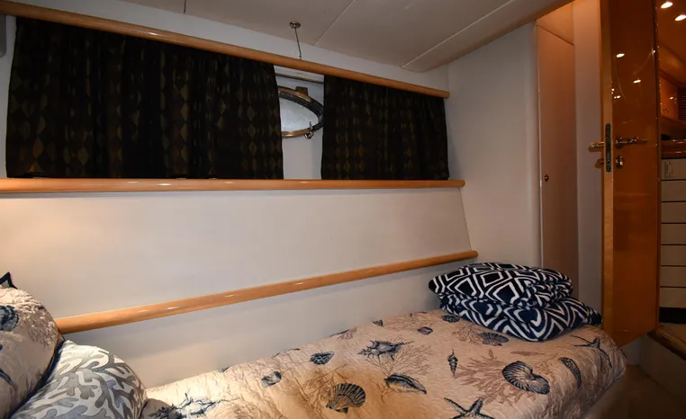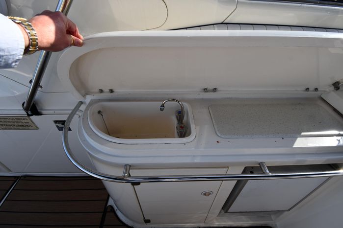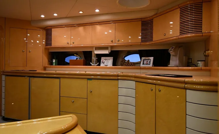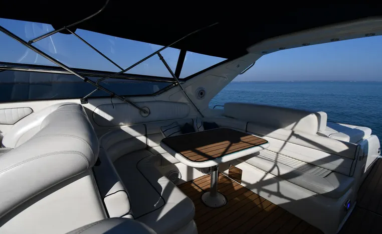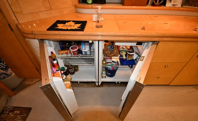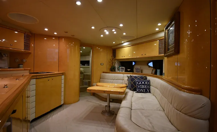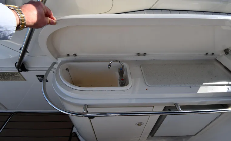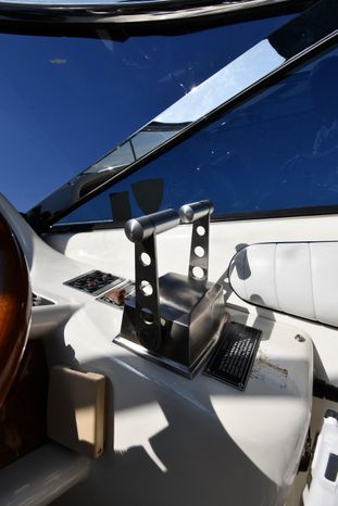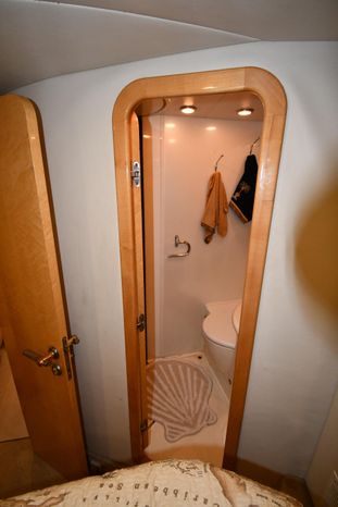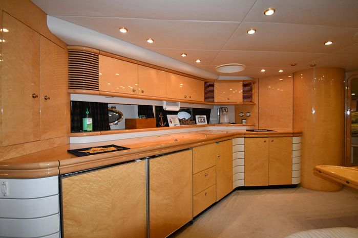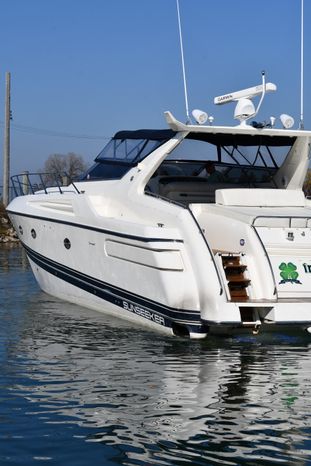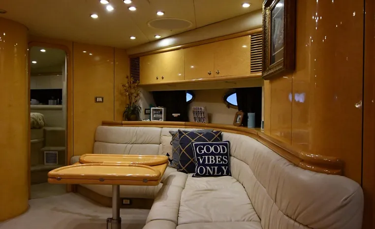 A popular model, the Camargue 55 helped define the Sunseeker reputation in this country for aggressive styling, luxurious accommodations, and exciting open-water performance. The Camargue was an impressive yacht when she came out in 1994 with deck and cabin accommodations that could only be described as opulent. The spacious cockpit, which consumes about half of the boat’s length, provides seating for three at the helm along with a mid-cockpit dinette and a huge aft sun lounge. Beneath the sun lounge is a garage for a tender or jet bike with an electric winch for launch and recovery. Below deck, the Camargue’s three- stateroom interior was updated in 1995 when a curved galley and dinette replaced the original U-shaped galley and dinette. In both configurations, the blend of high-gloss cherry woodwork, expensive galley appliances, and plush furnishings can only be described as lush. Additional features include a teak cockpit sole, bow storage locker, radar arch, and a hot/cold transom shower. Among several diesel options, twin 760hp 8V92 Detroits cruise the 55 Camargue in the high 20s and reach 30+ knots top.