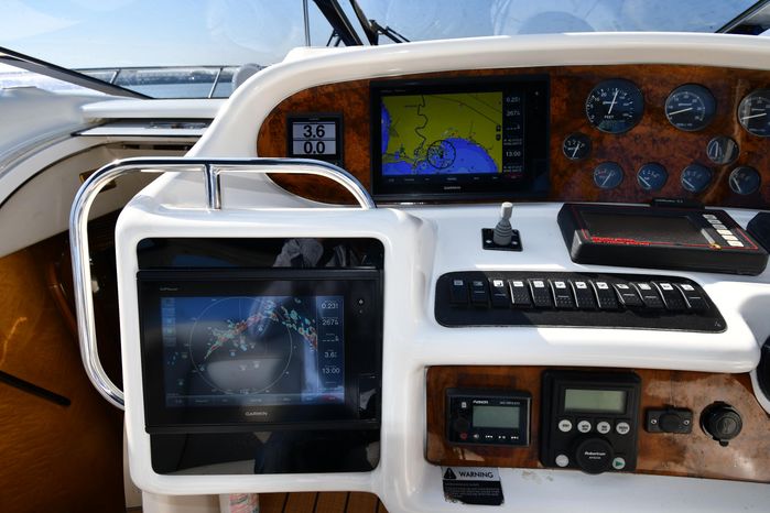 Freshwater / Great Lakes boat since new this vessel features Twin Detroit Diesel 8V92 DDEC 760-hp Diesel Engine's. Notable features include but are not limited to the following: Air-Conditioning & Heat (3-Units) - Note Forward Unit NEW, (2) Head's (Electric-Flush) w/Vanity/Sink/Stall-Shower, 3-Stateroom Layout (see photos), Windlass Anchor (NEW), NEW Generator (130 hrs) w/NEMA 2000, Updated Garmin NAV-System w/Dual 7612 XSV Display's w/Garmin HD-Radar/GPS/Chartplotter, Robertson Autopilot, Premium Fusion Sound System (Note 3-AMP's, JL-Audio Speakers, JL-Audio Sub-Woofer, JL-Audio Tower Speakers on Radar Arch, Forward Bow Sun-Pad (NEW) w/Cover, Snap-in Snap-out Cockpit Carpeting (NEW), Cockpit Wet Bar w/Sink/Ice-Maker/Freezer, and MUCH more!