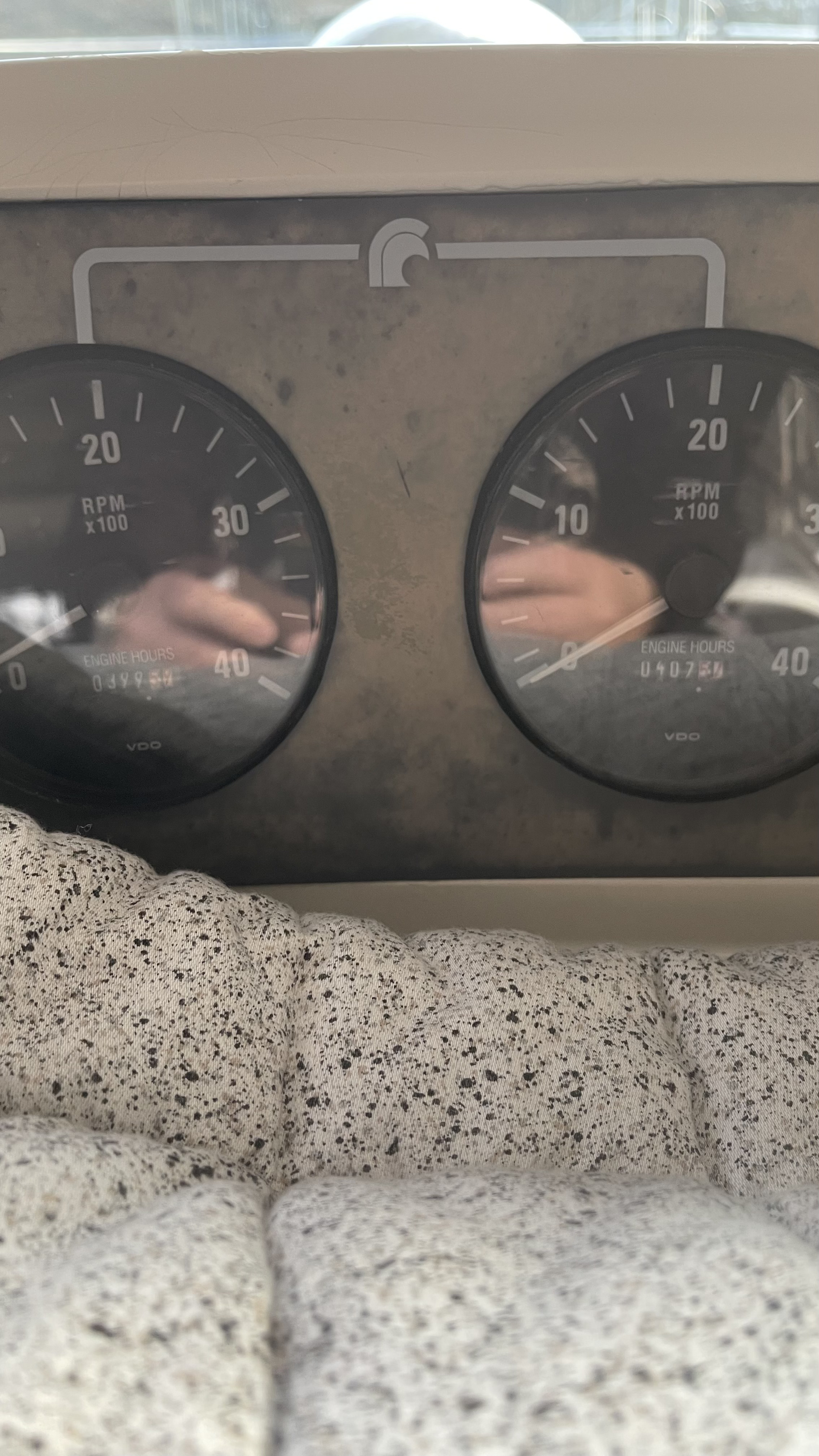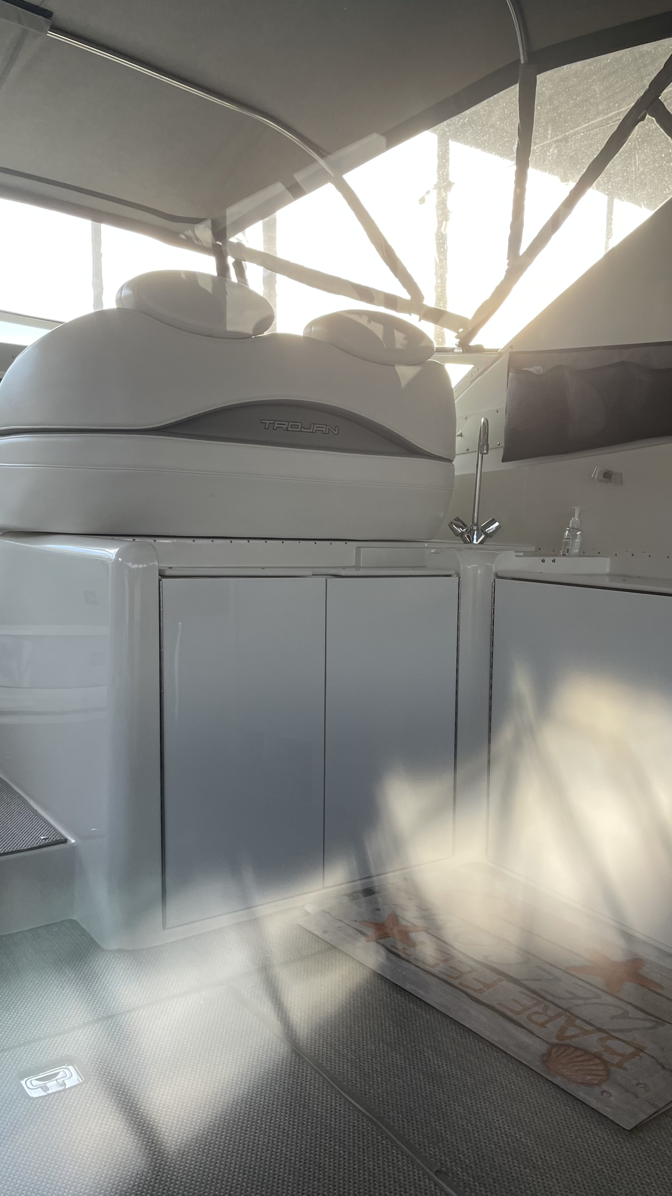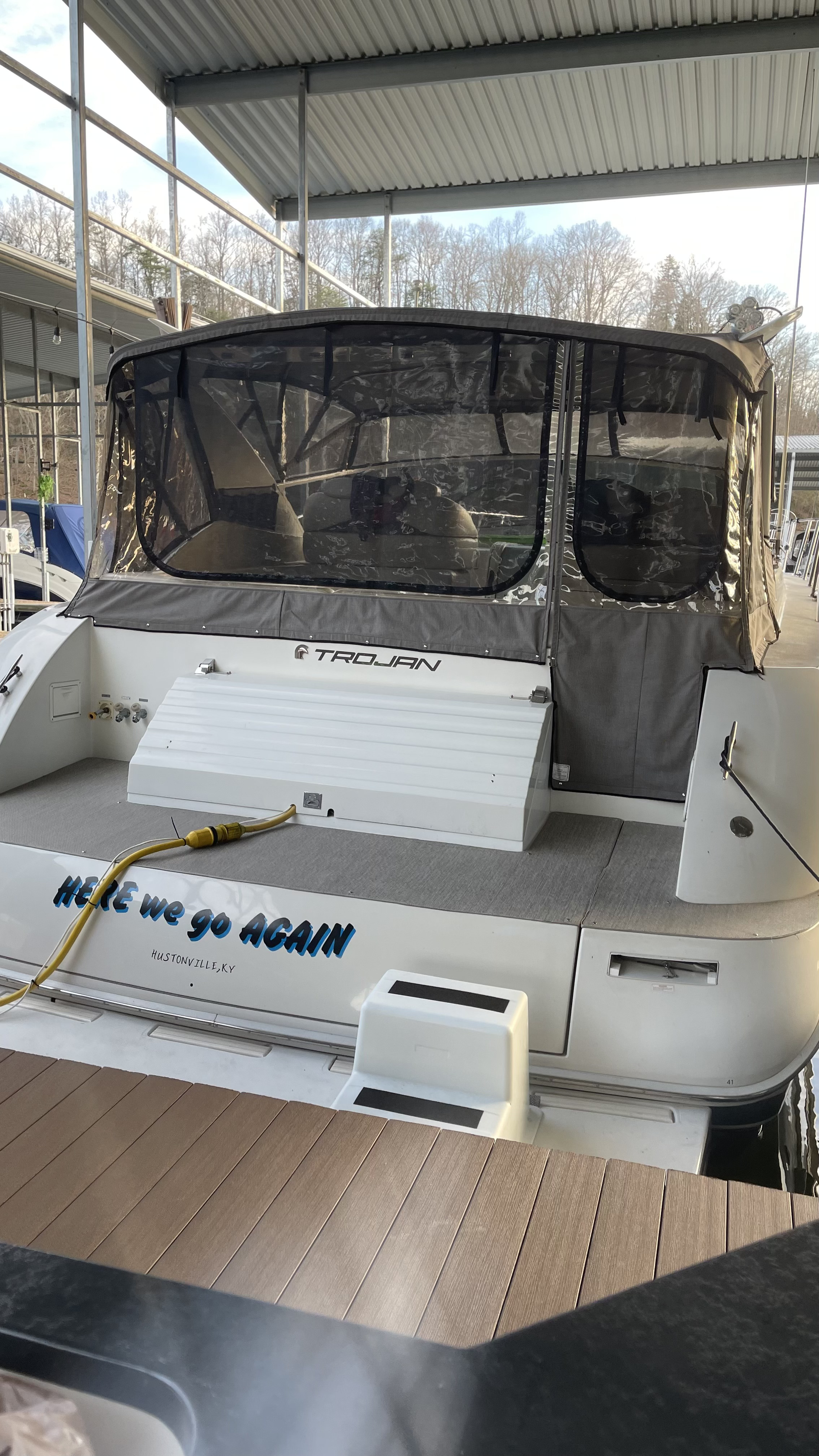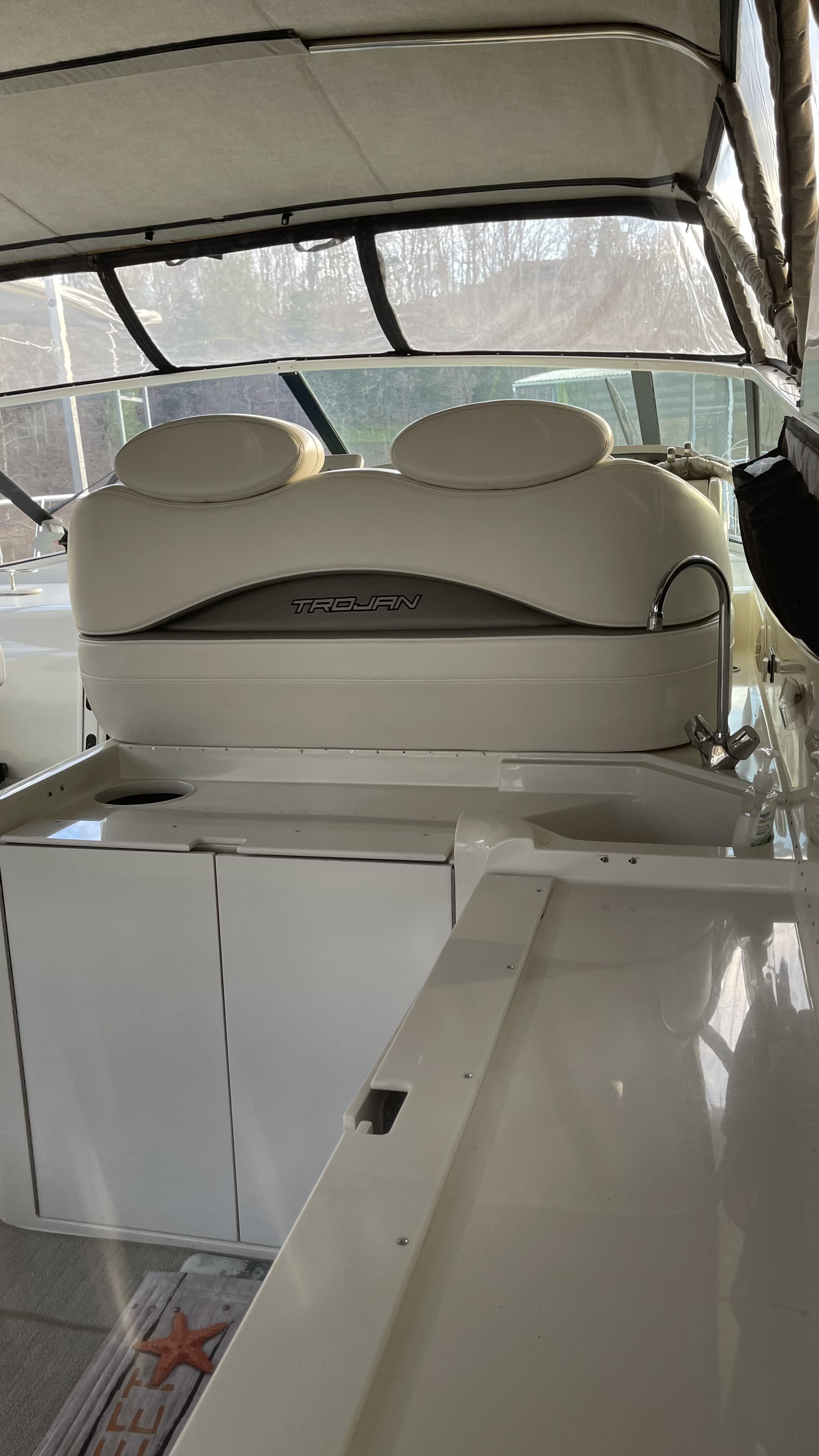 Trojan express cruiser 440, twin caterpillars 3126 diesel 420hp (400 hrs), runs excellent, 44' plus 4' platform, 15' beam, kohler marine diesel generator 8k (200 hrs), there are two private staterooms and two heads with stall showers, a full-service galley, and storage galore. Topsides the helm is very comfortable and has excellent sightlines for the captain. The cockpit is huge with comfortable seating for a crowd, washer/dryer combo, new fresh water pressure pump and new vinyl flooring...