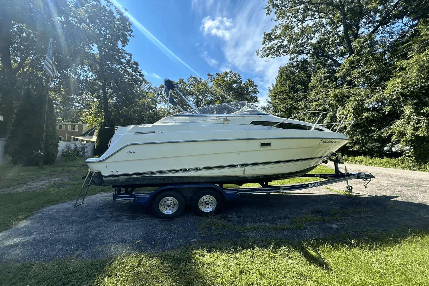 - New swim deck ladder installed Below deck, you’ll find air conditioning, a convertible dinette, microwave, fridge, and comfortable sleeping for four with both aft and bow berths. The cockpit features a stowable aft bench and reversible companion seating — perfect for cruising or relaxing at anchor. Includes a solid 1986 tandem axle Yacht Club trailer. This is a turnkey, water-ready package from motivated owners who’ve already moved on to their next boat. Priced to sell before winter.