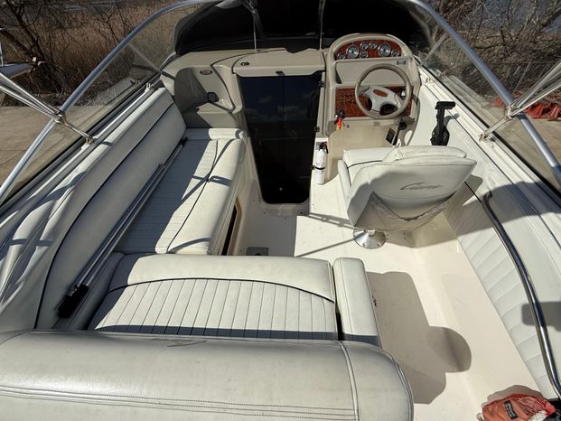 Freshwater use only this vessel features a Single 5.7-litre 260-hp MerCruiser Gas Engine with Alpha I Sterndrive! Notable features include but are not limited to the following: Shoreland'r Tandem Axle Bunk Trailer, Sleeping Accommodations for Four, Enclosed Head (Manual Flush) w/Vanity/Sink/Shower, Electronics Package (VHF Marine Radio Humminbird Depth Sound), AM/FM Stereo System w/CD-Player, Bimini Top Canvas Package w/Camper Back & Screens, Snap-in Snap-out Cockpit Carpeting, and MUCH more!