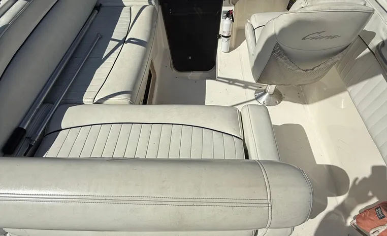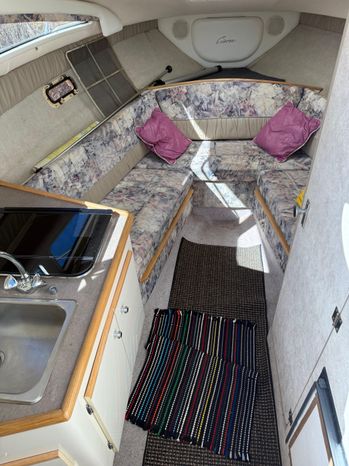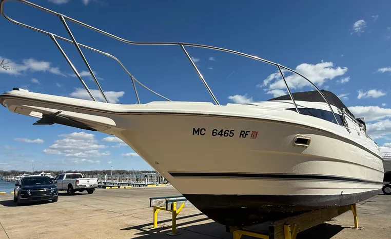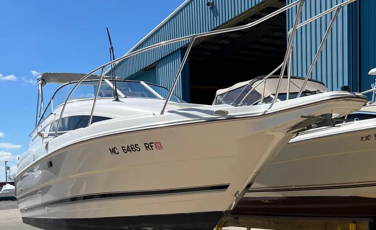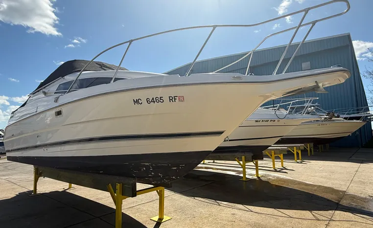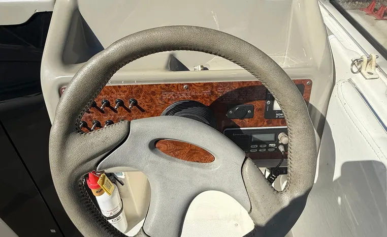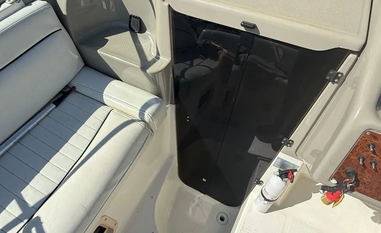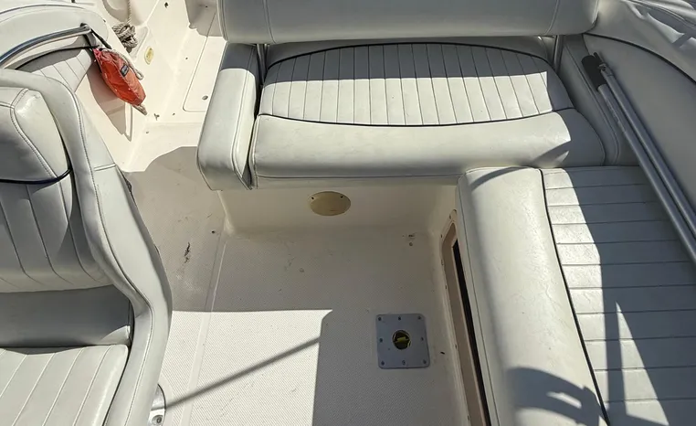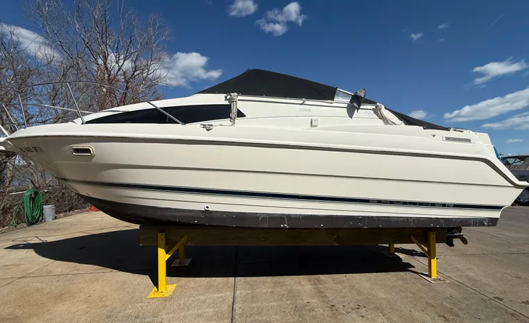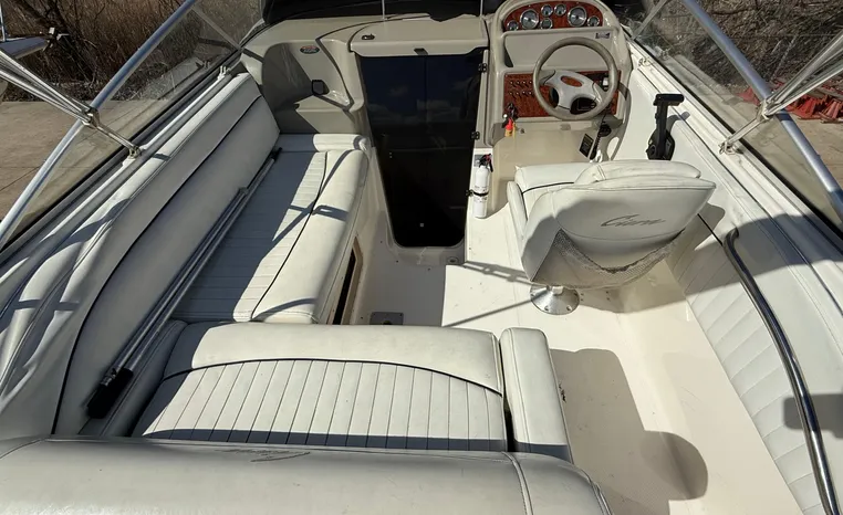 Wide-beam family cruiser (called 265 Cruiser in 2004) remains one of the biggest 26-footers ever produced. Spacious interior boasts full dinette with removable table, stand-up head compartment, large galley with lots of storage, comfortable mid-cabin berth. Topside features include walk-thru windshield, extended swim platform, cockpit seating for six, well-arranged helm with space for electronics. Note transom shower, reversible cockpit seat.