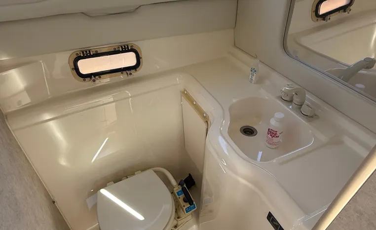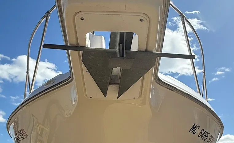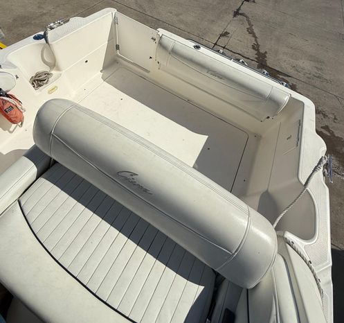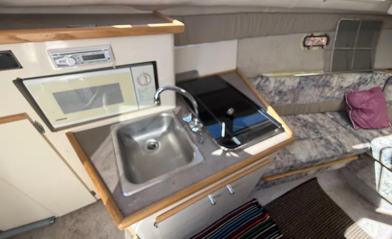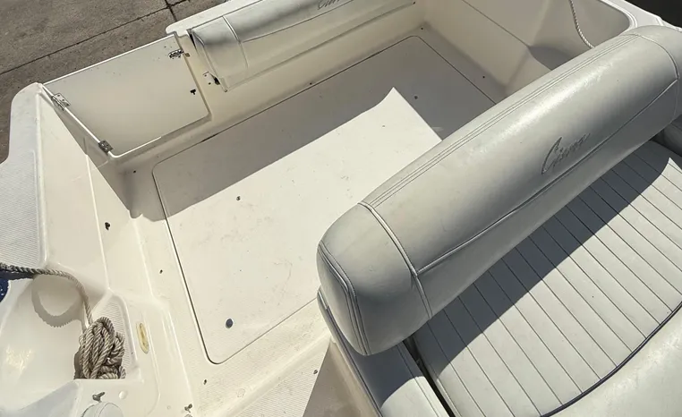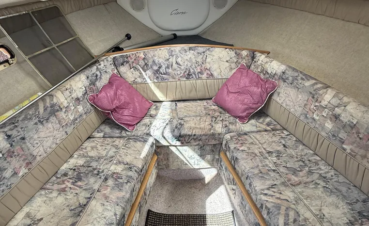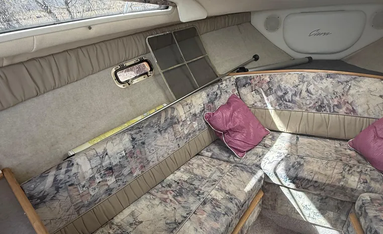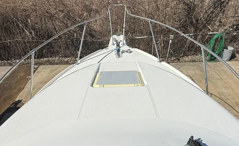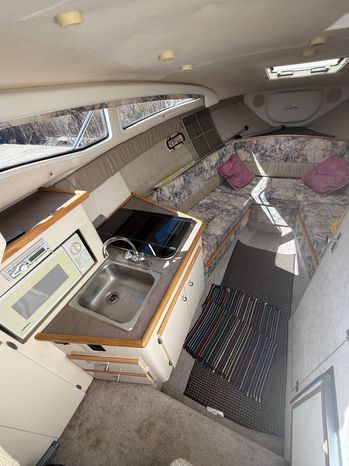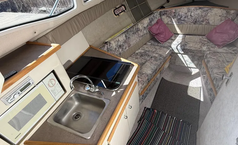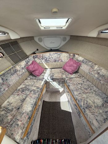 Wide-beam family cruiser (called 265 Cruiser in 2004) remains one of the biggest 26-footers ever produced. Spacious interior boasts full dinette with removable table, stand-up head compartment, large galley with lots of storage, comfortable mid-cabin berth. Topside features include walk-thru windshield, extended swim platform, cockpit seating for six, well-arranged helm with space for electronics. Note transom shower, reversible cockpit seat.