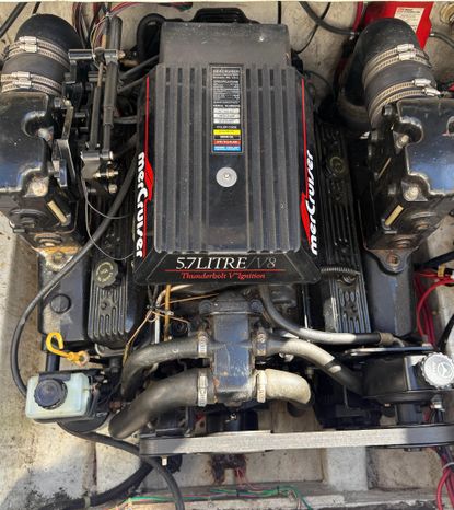 Freshwater use only this vessel features a Single 5.7-litre 260-hp MerCruiser Gas Engine with Alpha I Sterndrive! Notable features include but are not limited to the following: Shoreland'r Tandem Axle Bunk Trailer, Sleeping Accommodations for Four, Enclosed Head (Manual Flush) w/Vanity/Sink/Shower, Electronics Package (VHF Marine Radio Humminbird Depth Sound), AM/FM Stereo System w/CD-Player, Bimini Top Canvas Package w/Camper Back & Screens, Snap-in Snap-out Cockpit Carpeting, and MUCH more!
