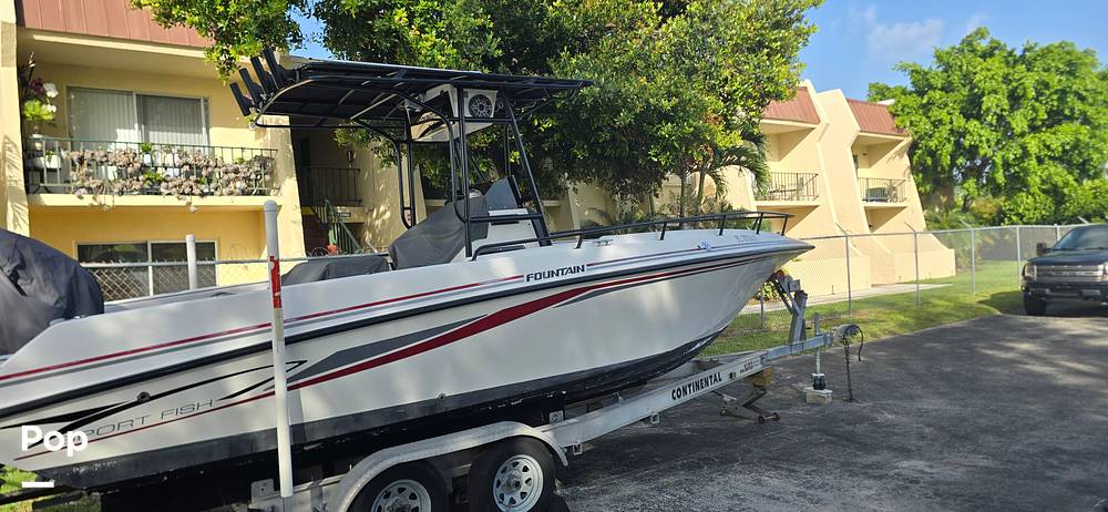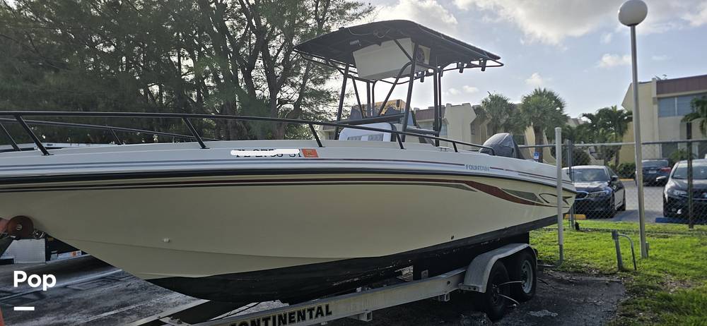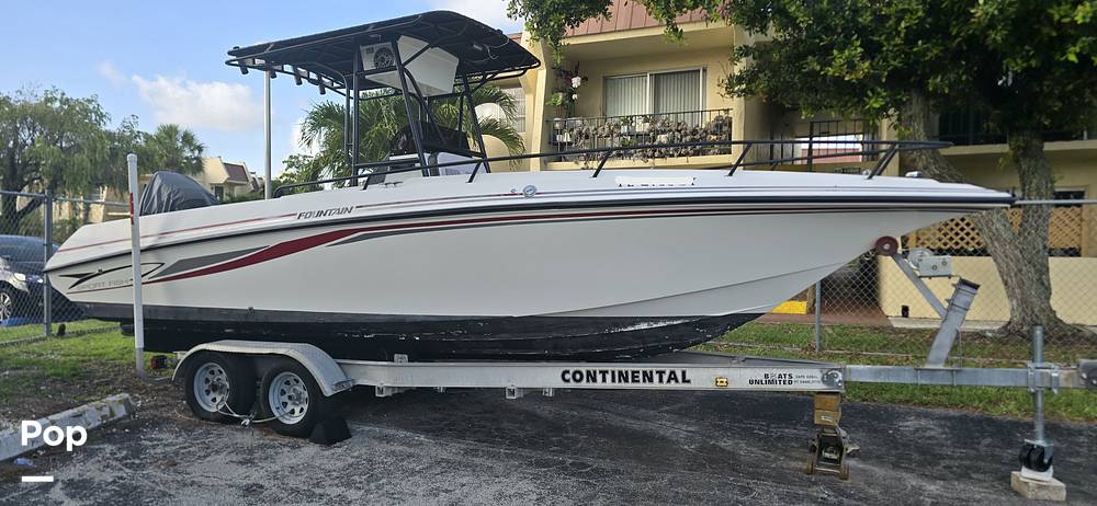 The Fountain center console features a T-top with canvas Bimini and working lights.