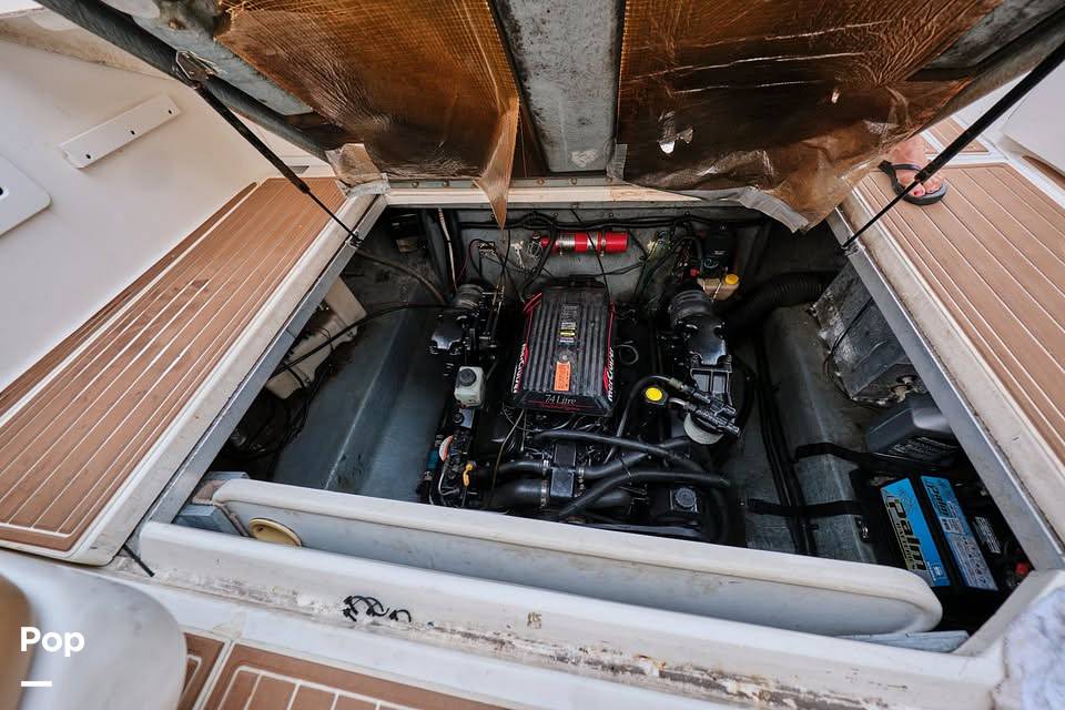 Some of the newer upgrades installed onto this Sundancer include exhaust manifolds & risers, metallic paint, pinstriping, tinted windows, a fresh steering wheel, sunbathing pads with beverage holders, top canvas (to protect upholstery), and fresh flooring (both upstairs & cabin) as well as fresh carpeting in the cabin.