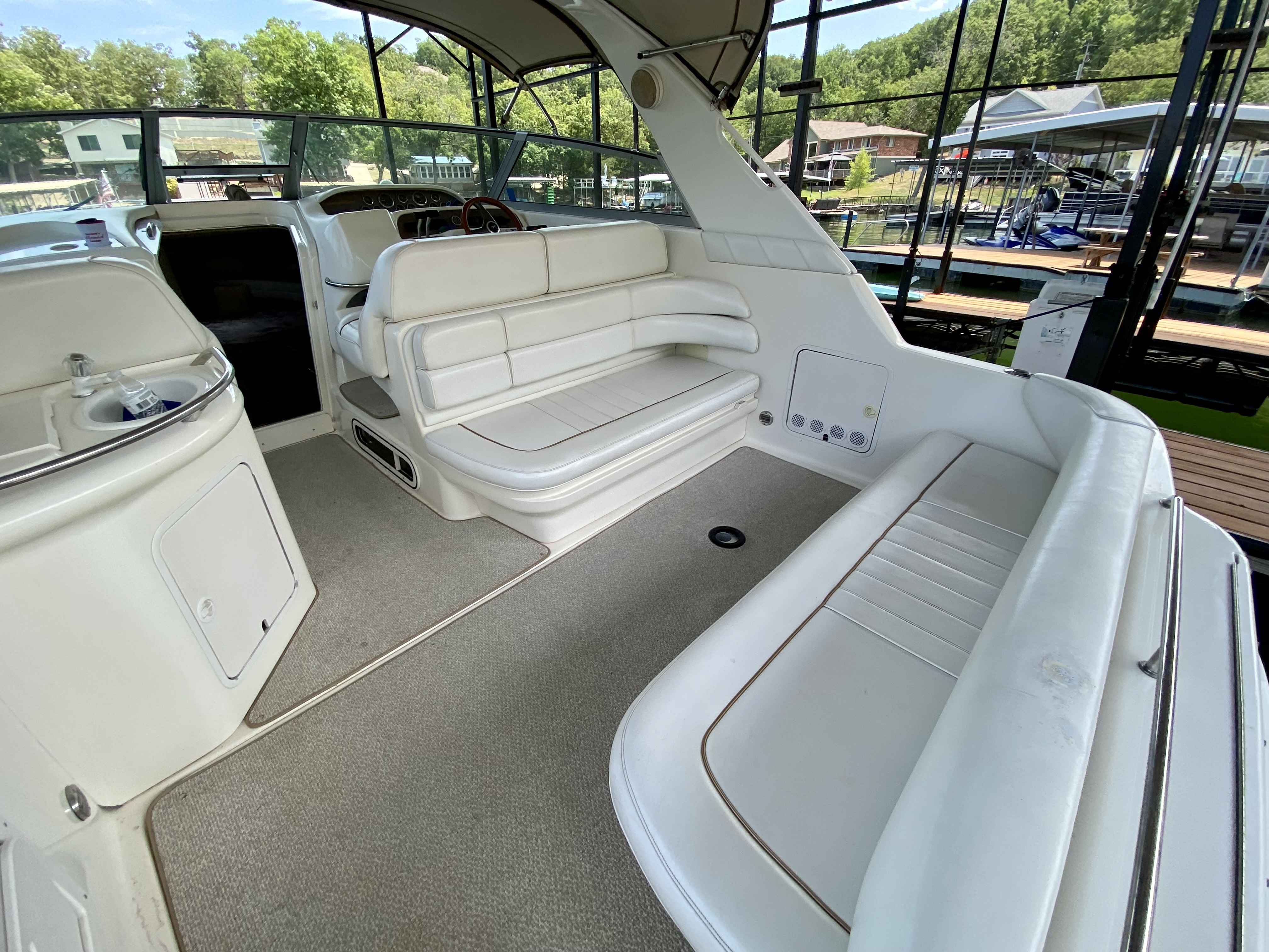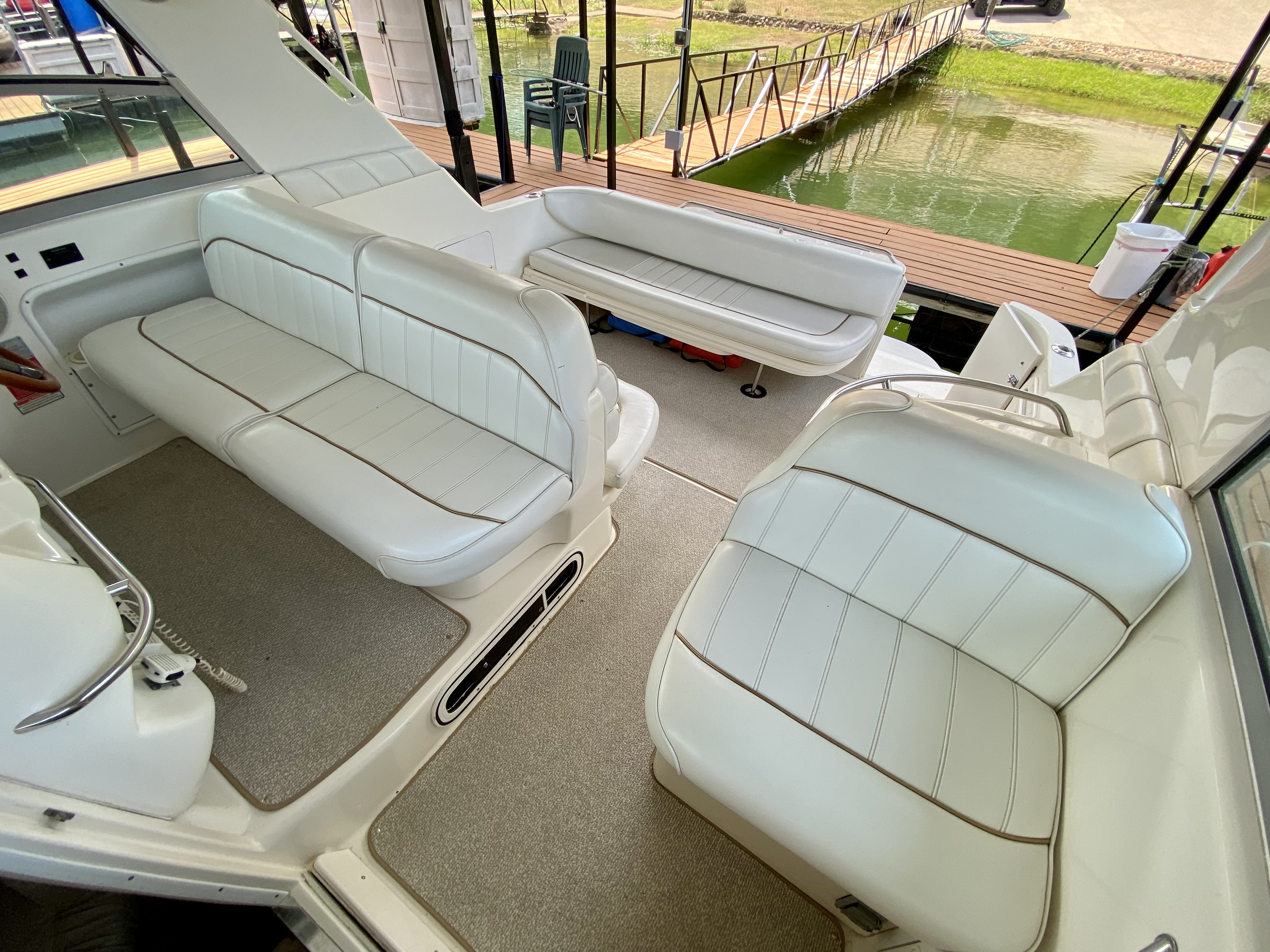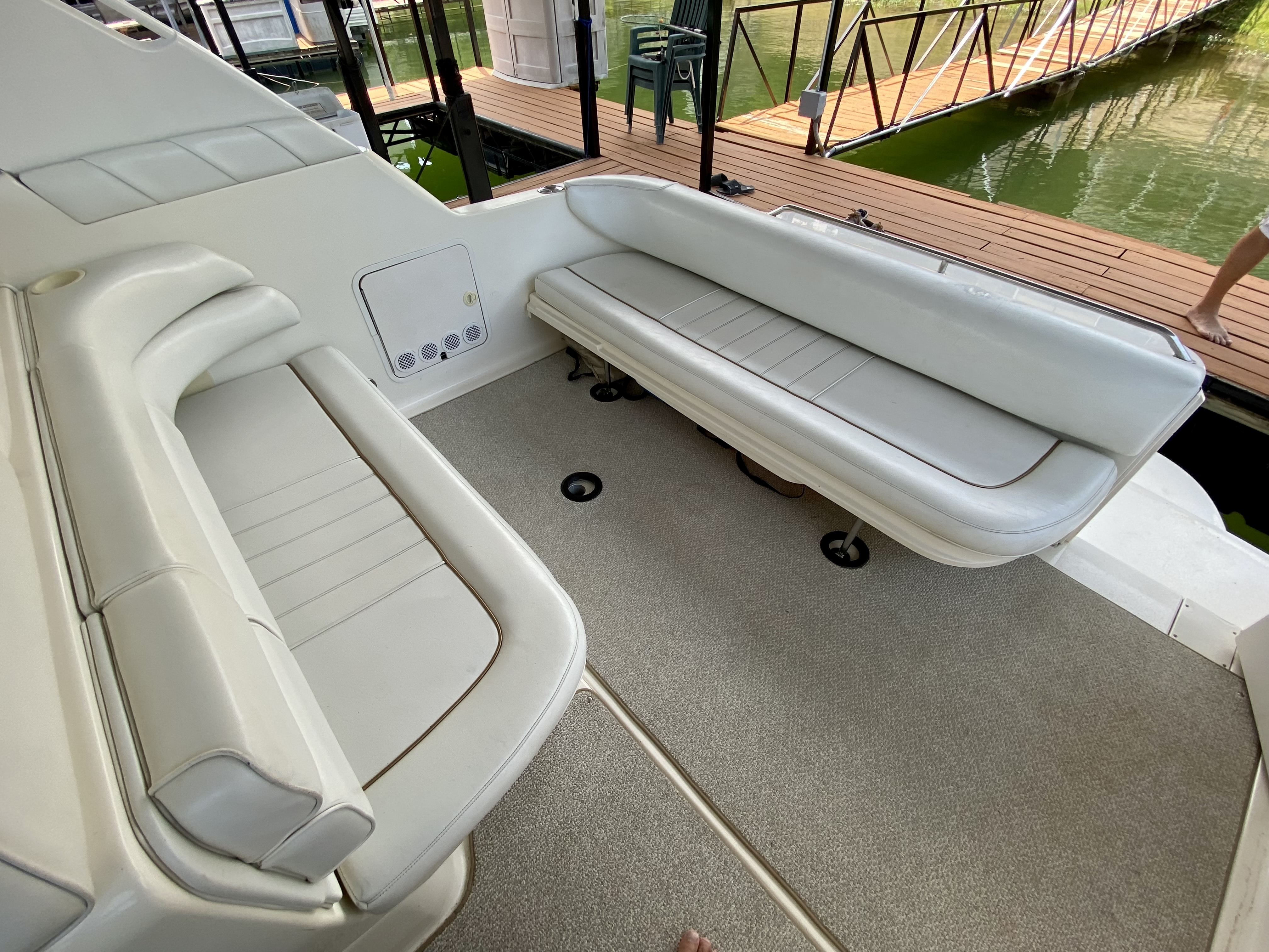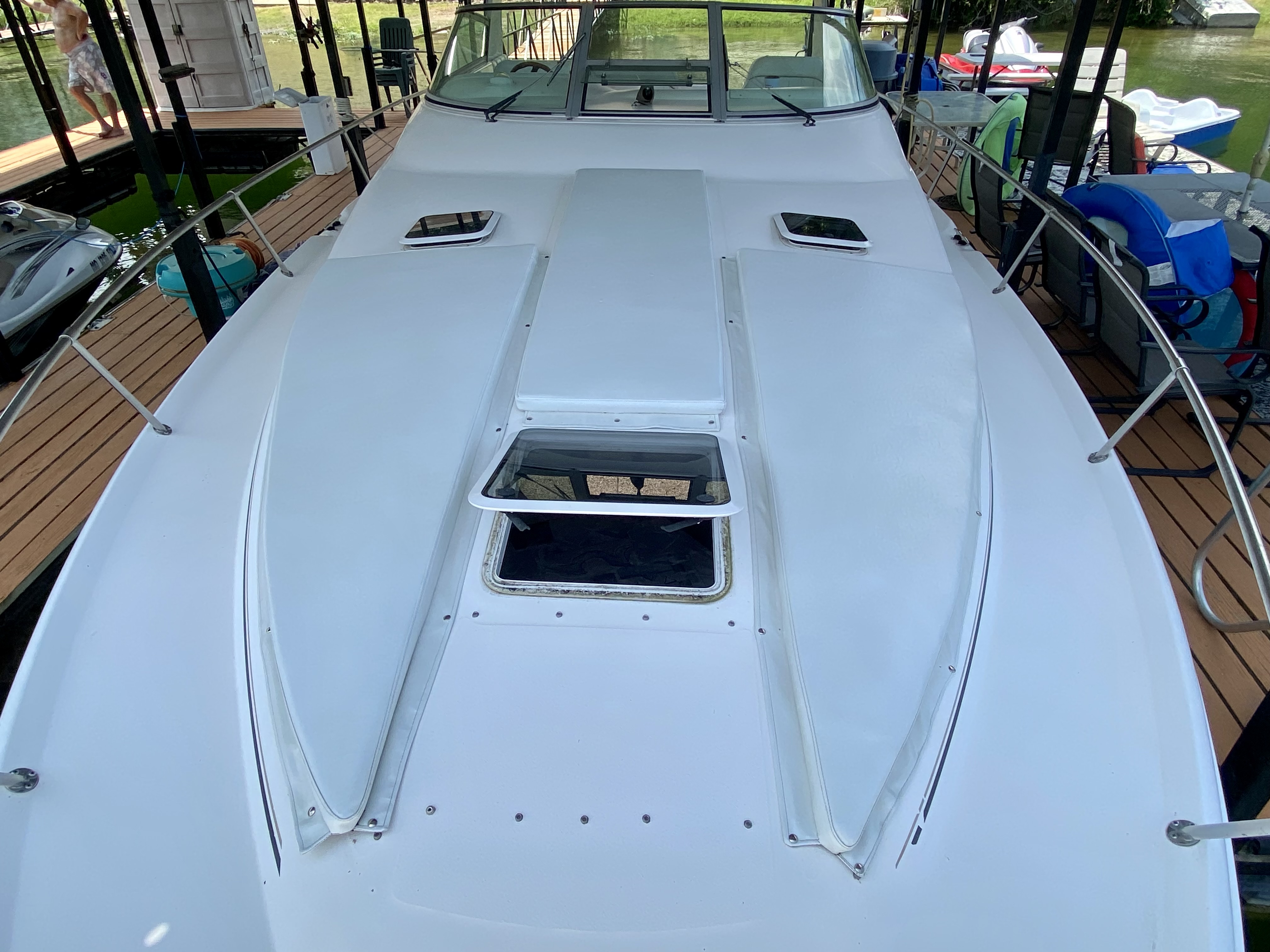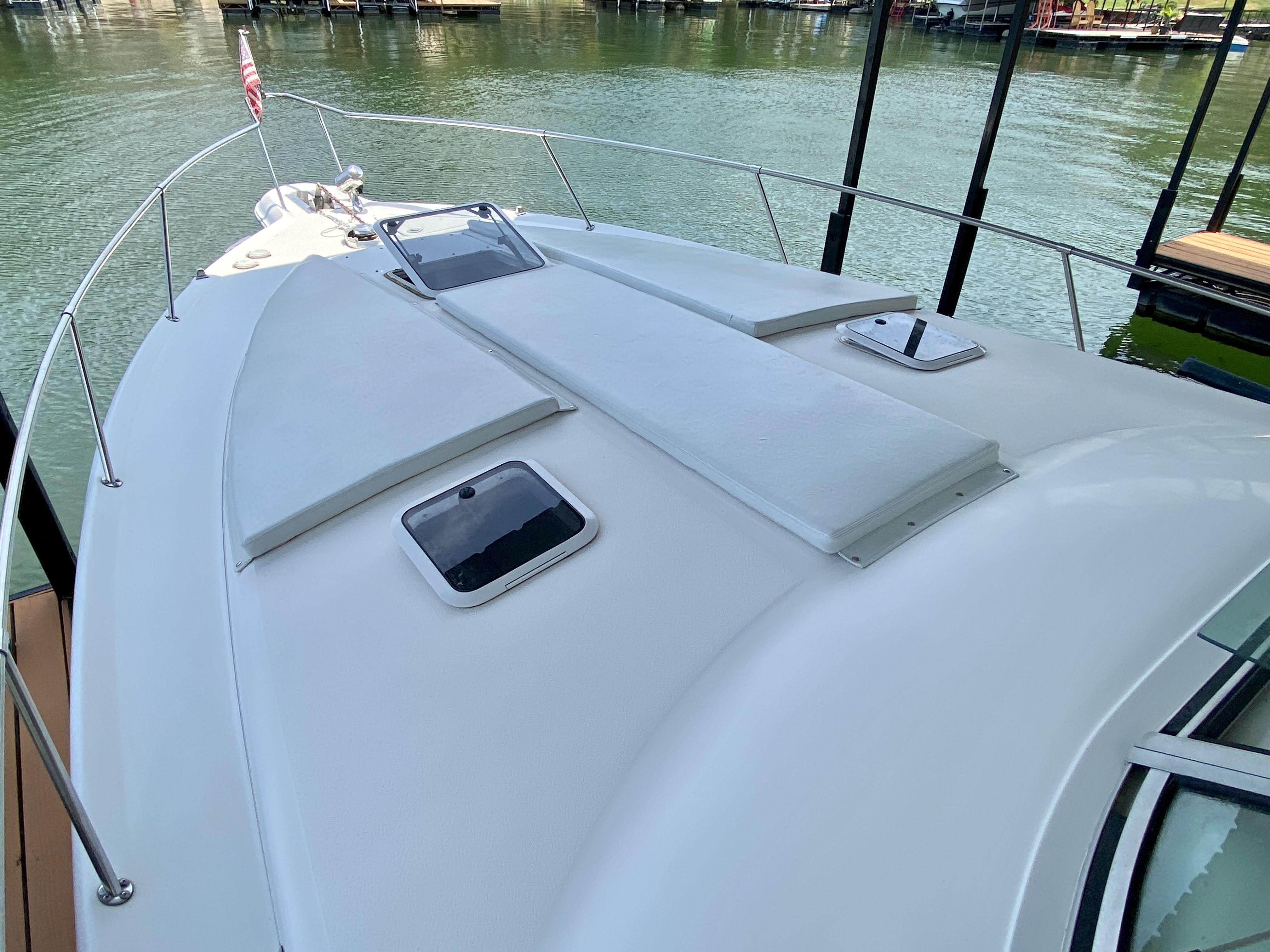 Deck/Hull: Anchor, pulpit, dock power, compass, spotlight, windshield wipers, shore water, wet bar with refrigerator, large custom bow sunpad, updated cockpit carpet, extended swim platform, transom shower, arch, bimini top, and partial full enclosure.