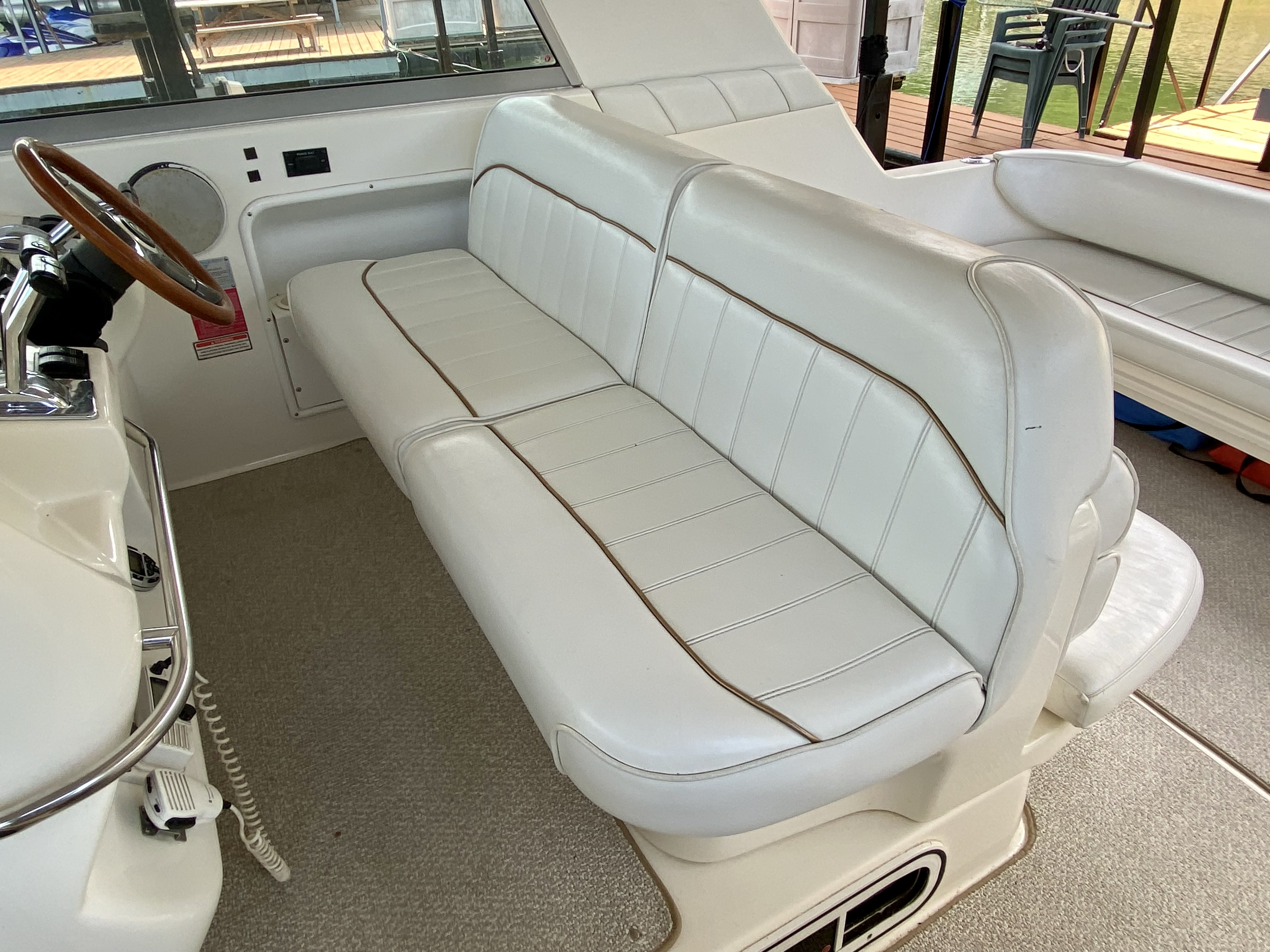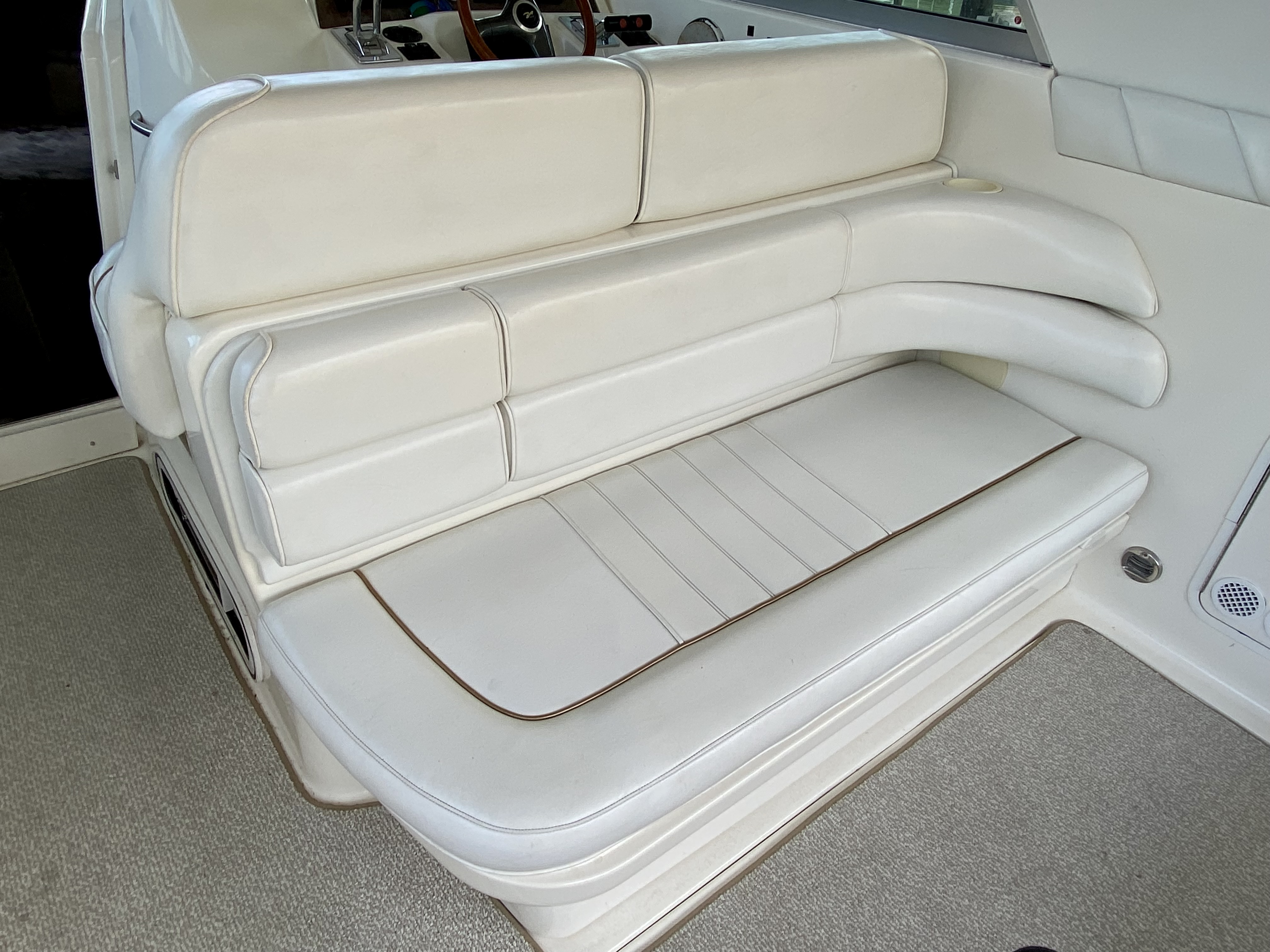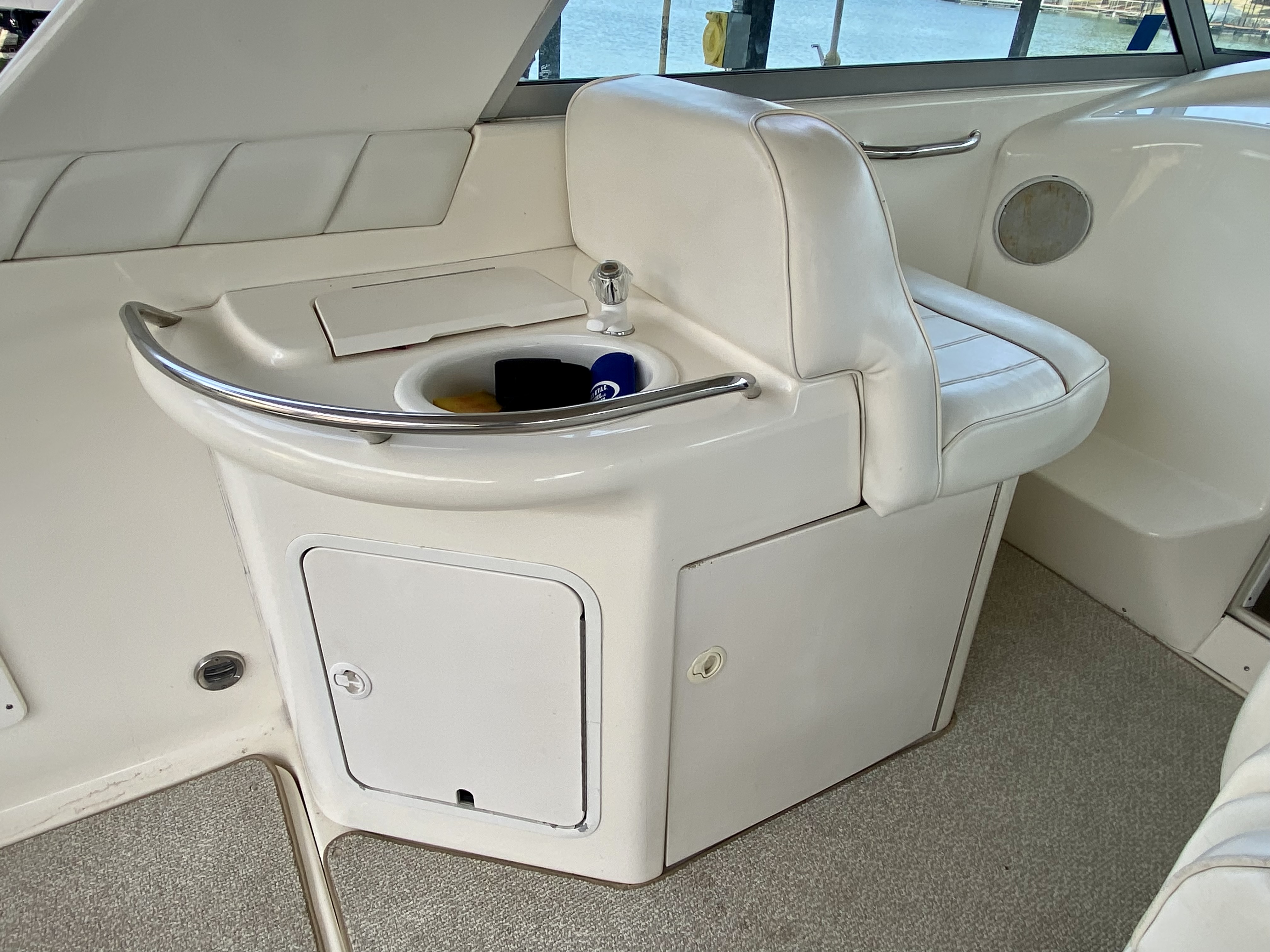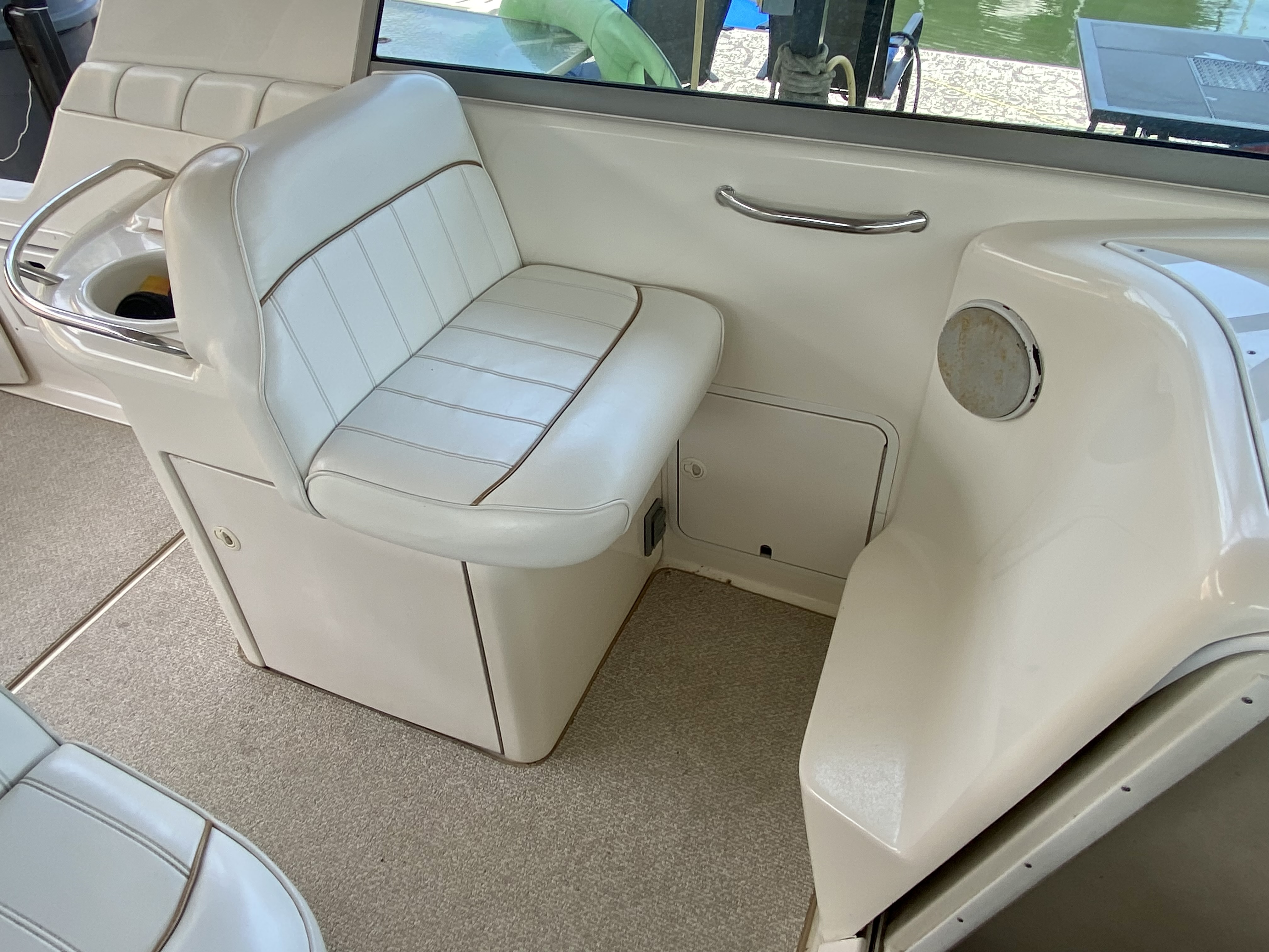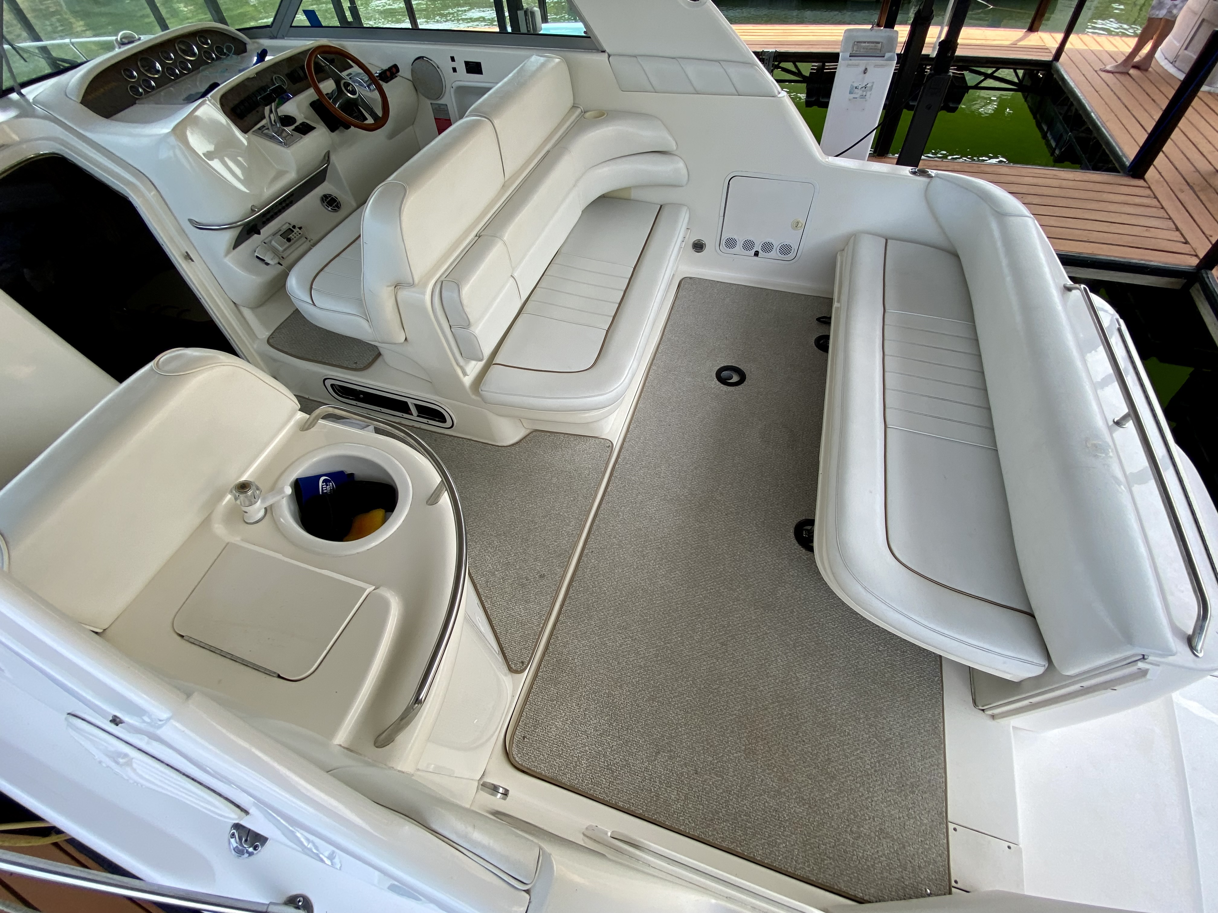 Deck/Hull: Anchor, pulpit, dock power, compass, spotlight, windshield wipers, shore water, wet bar with refrigerator, large custom bow sunpad, updated cockpit carpet, extended swim platform, transom shower, arch, bimini top, and partial full enclosure.