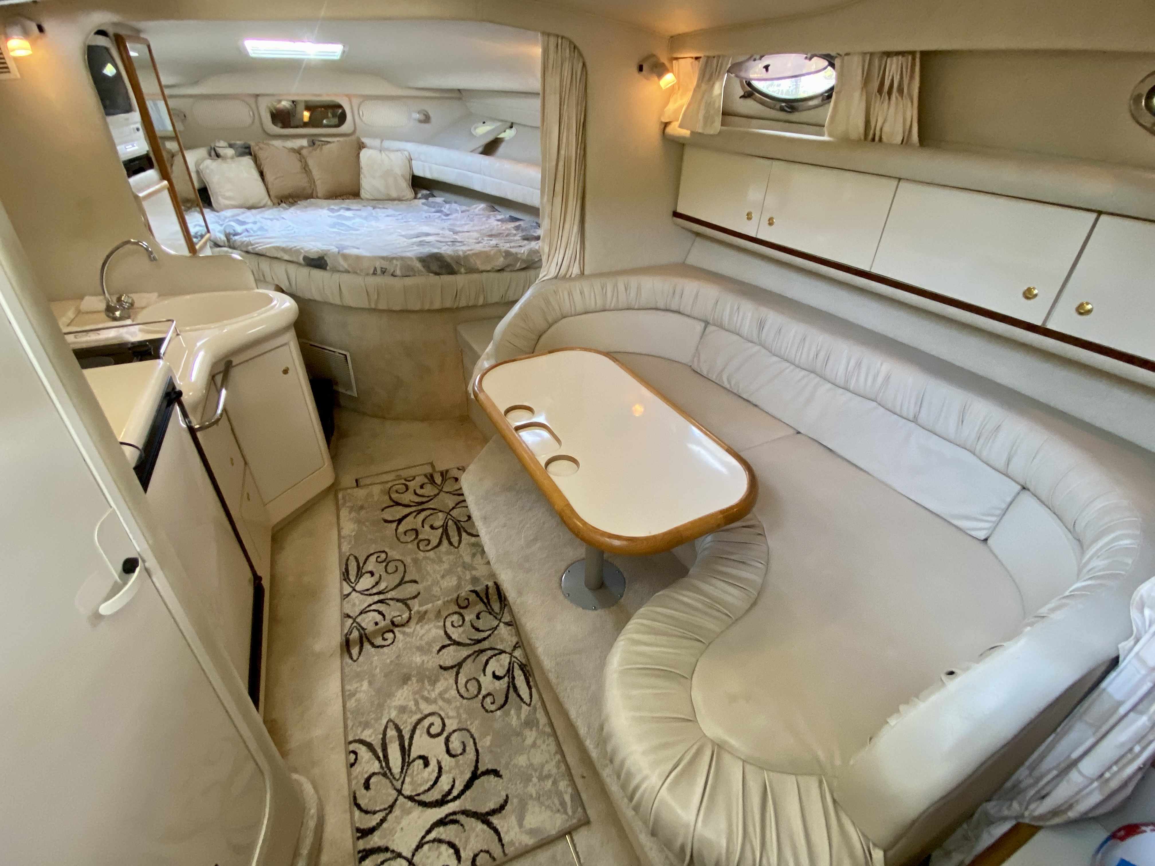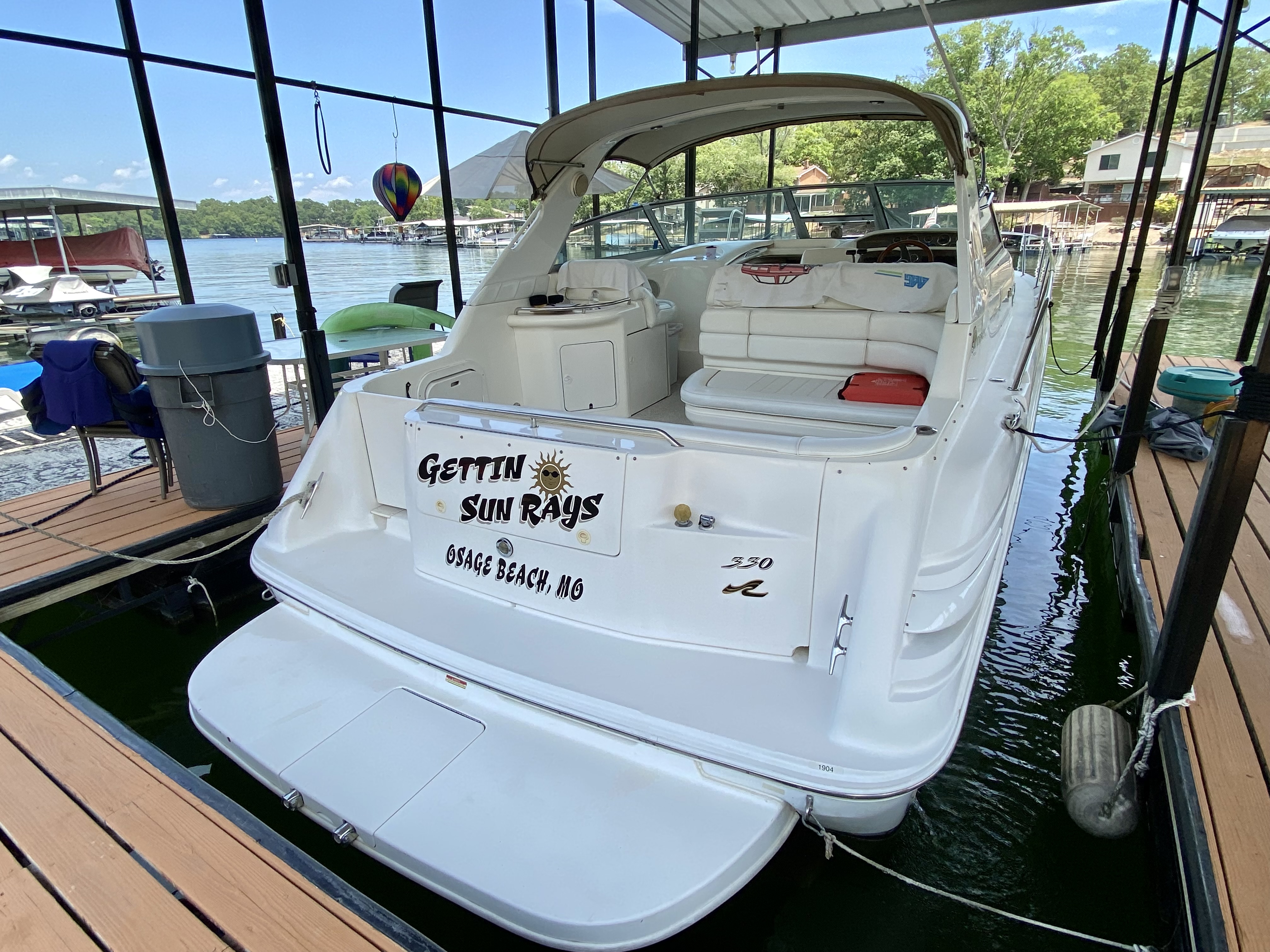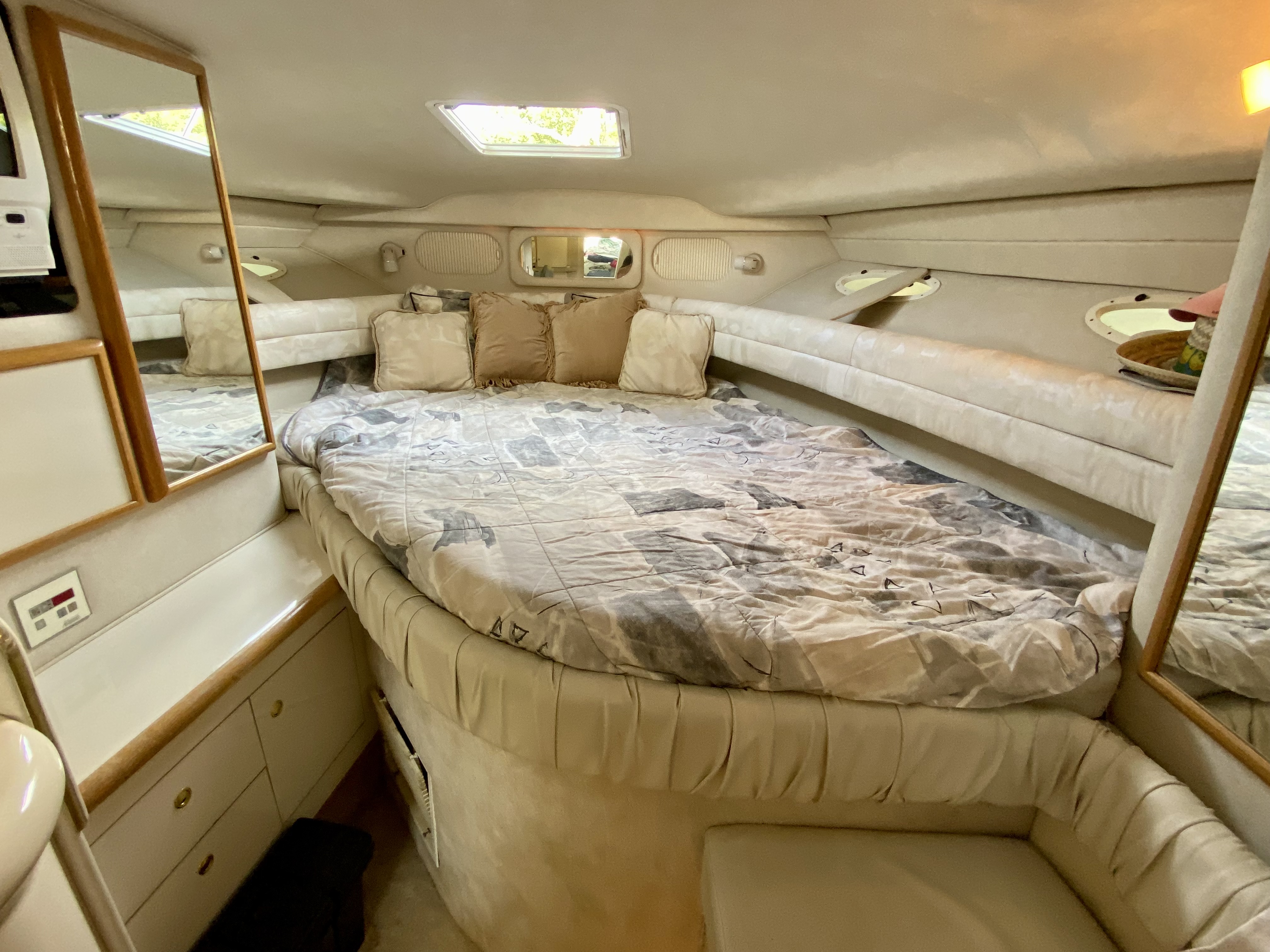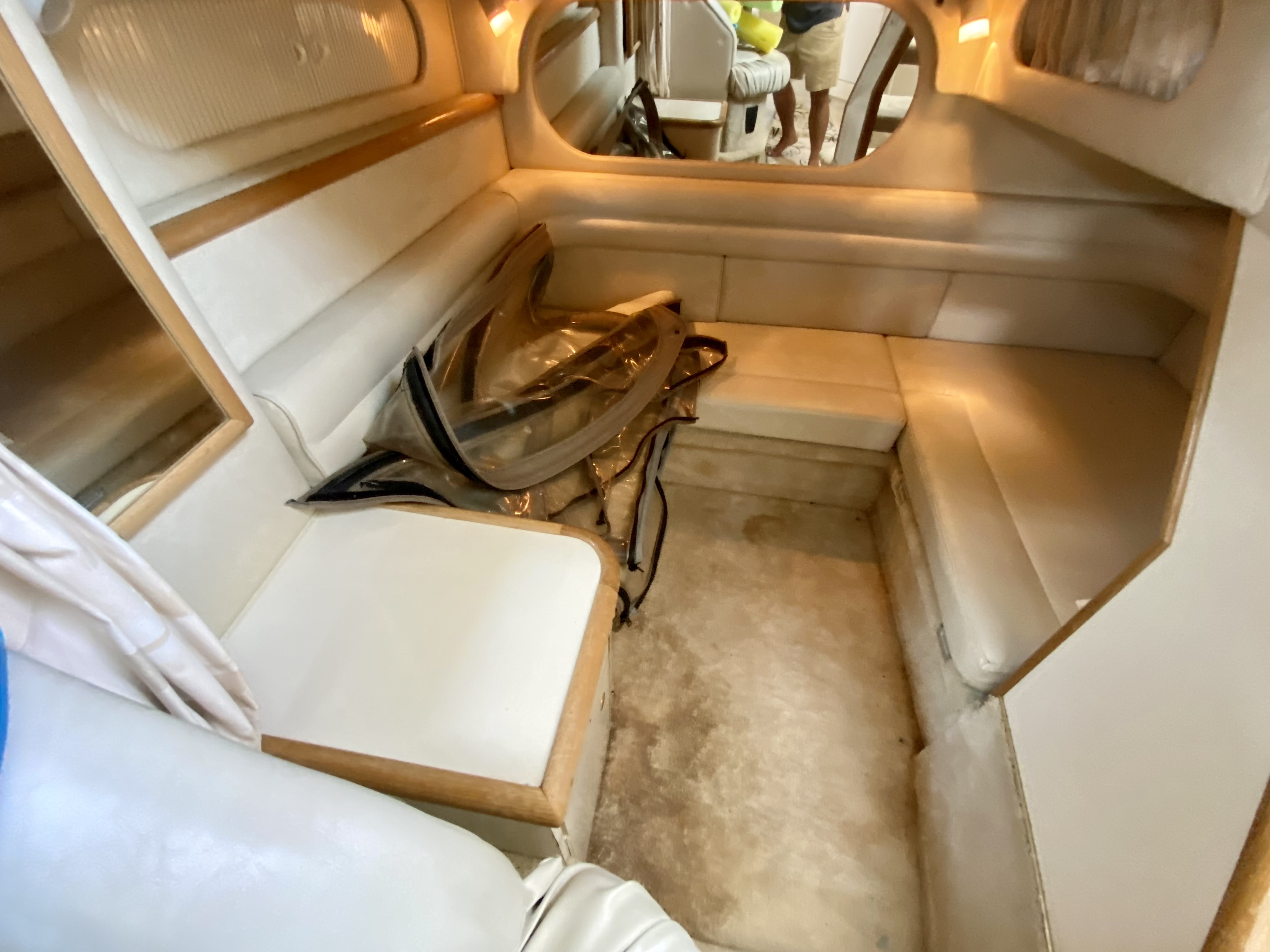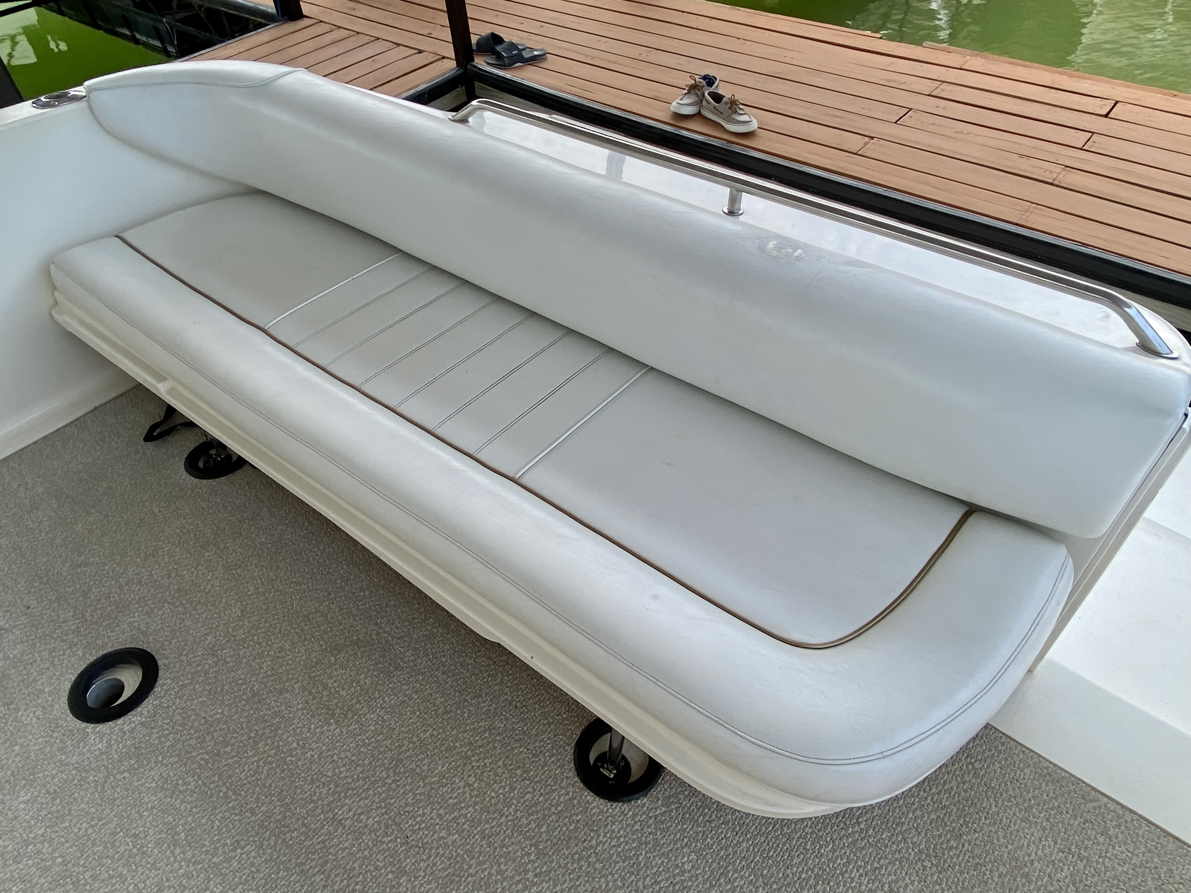 Deck/Hull: Anchor, pulpit, dock power, compass, spotlight, windshield wipers, shore water, wet bar with refrigerator, large custom bow sunpad, updated cockpit carpet, extended swim platform, transom shower, arch, bimini top, and partial full enclosure.